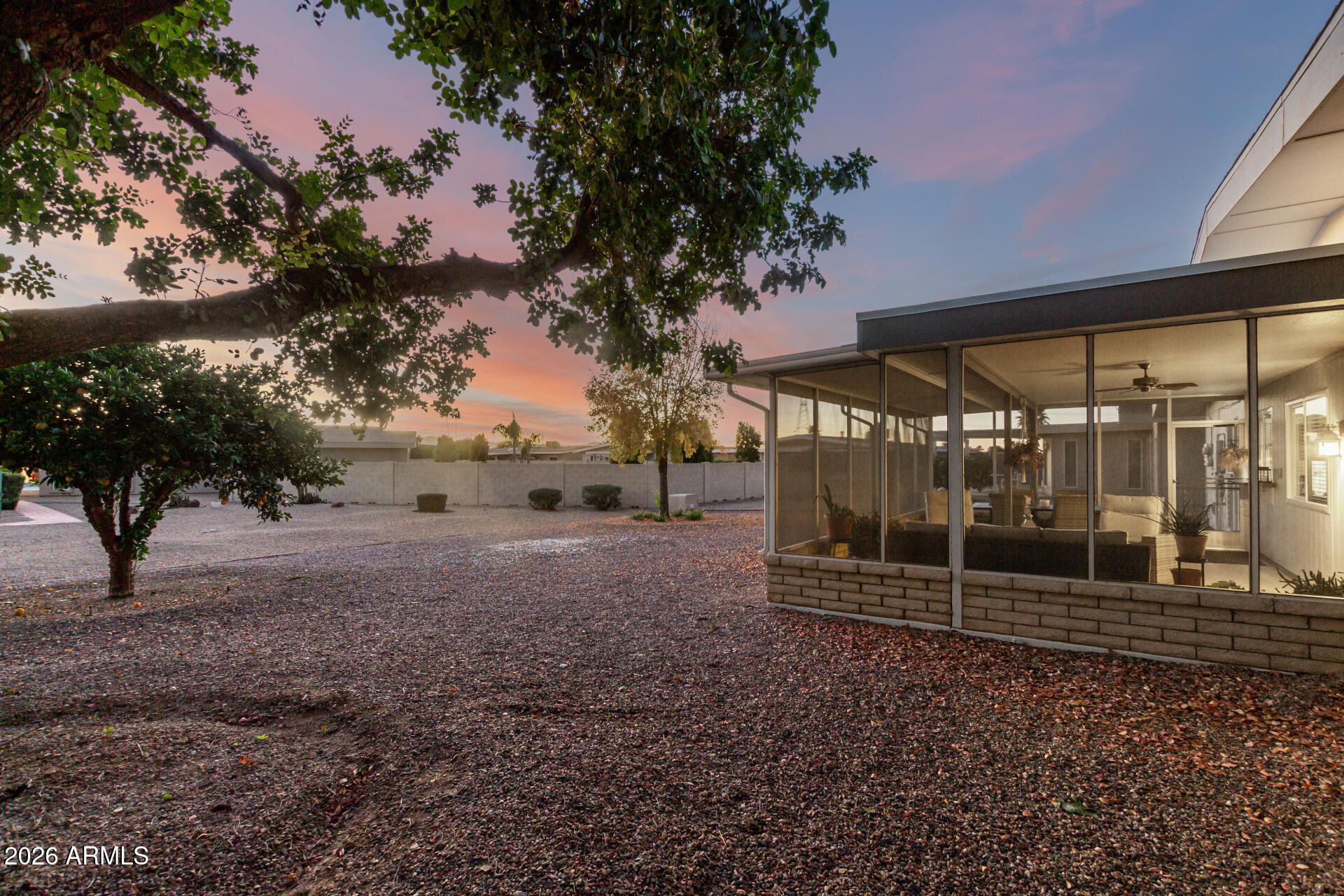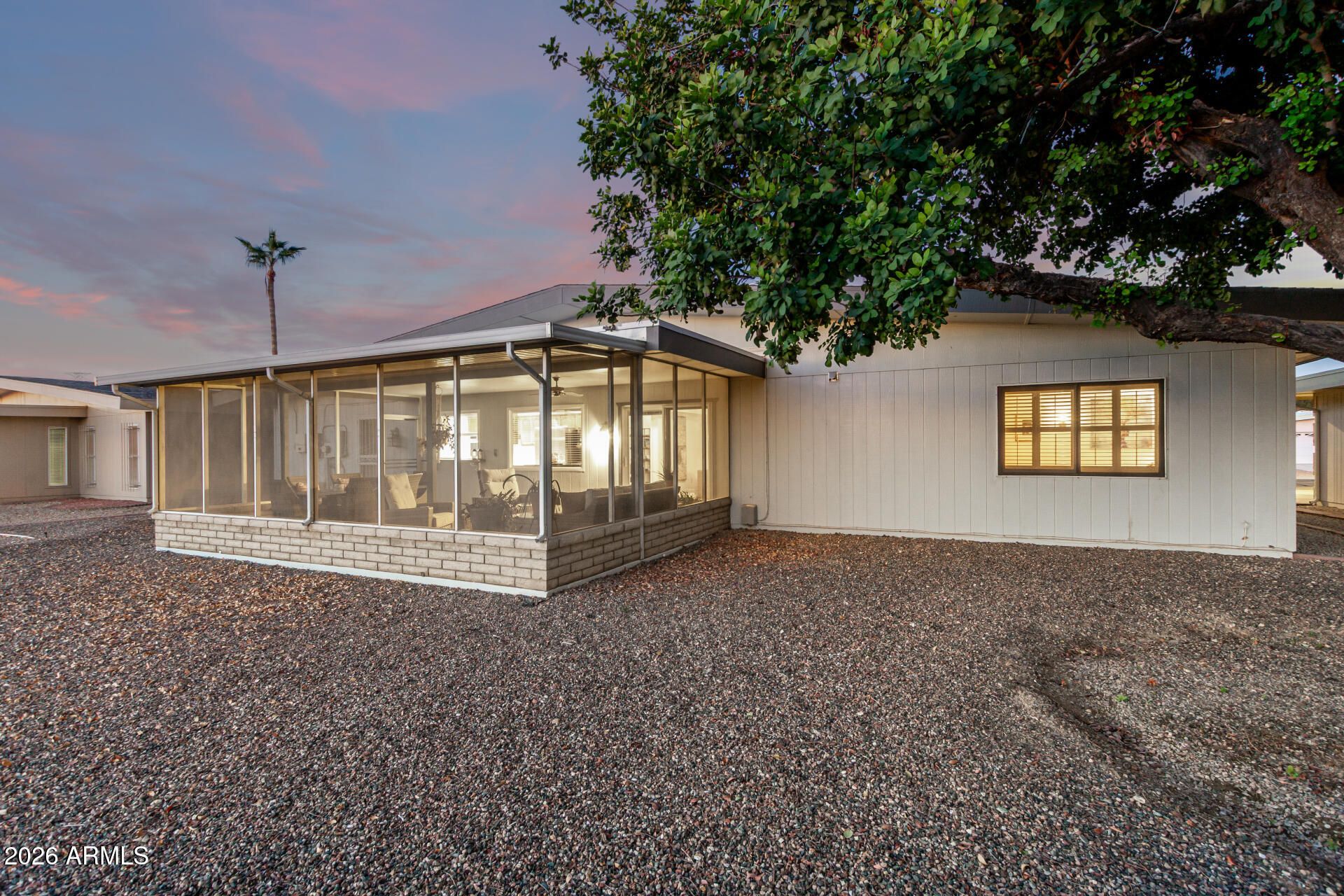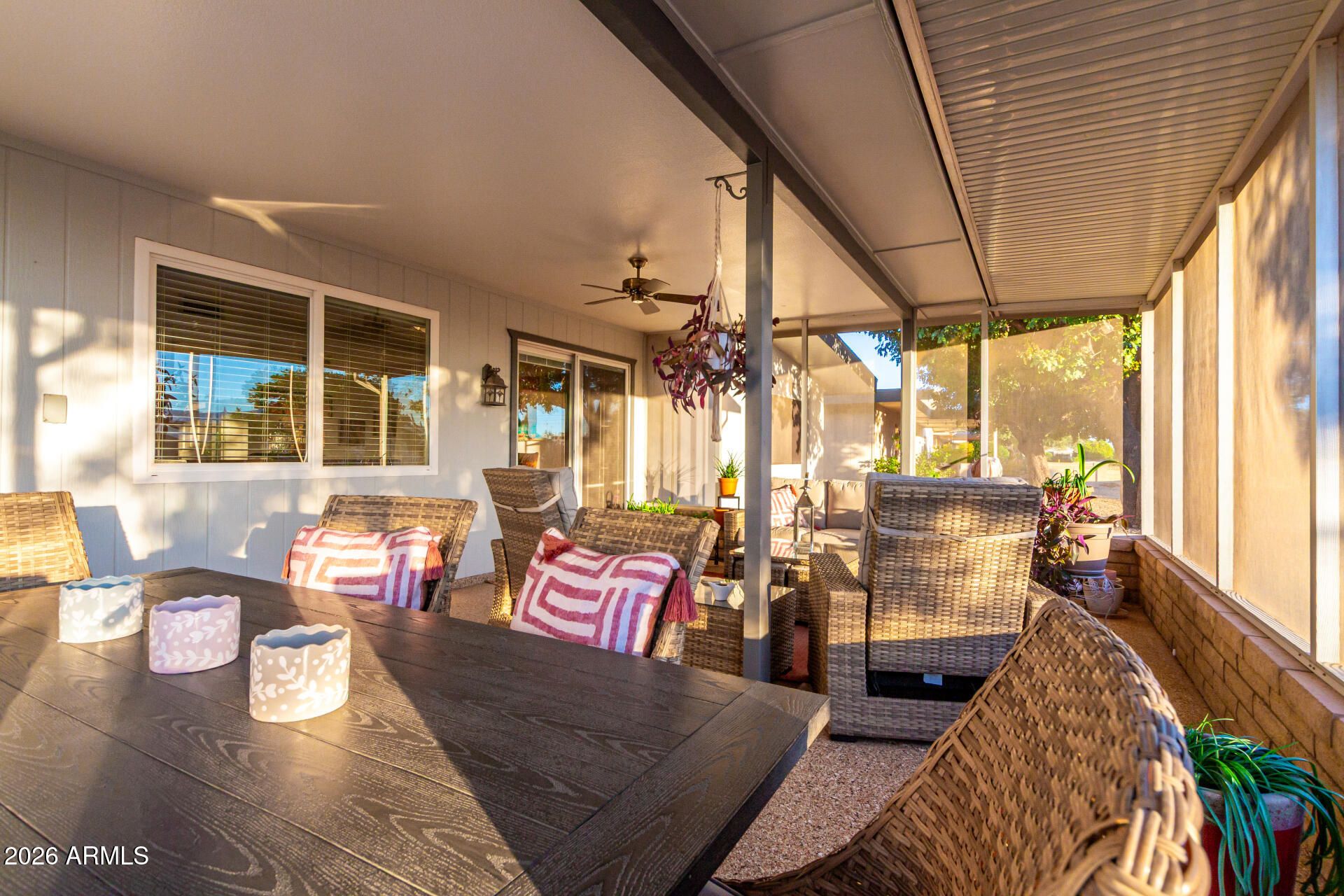 Extremely well cared-for 2-bedroom home features high ceilings and a bright, open feel. Dual-pane Pella windows, a separate family room, and a well-appointed kitchen with stainless steel appliances, Corian counters, tile backsplash, recessed lighting, and ample cabinetry contribute to the home's appeal. Recent upgrades include a 2-year-old AC, whole-house water softener, and RO system. Outdoor features include mature date palms, epoxy front patio, and an awesome screened-in back patio for entertaining and enjoying the great Arizona weather (most of the time ;-). The extended 2.5-car garage provides added storage and utility - could likely fit four small cars and certainly two regular sized cars and two golf carts.