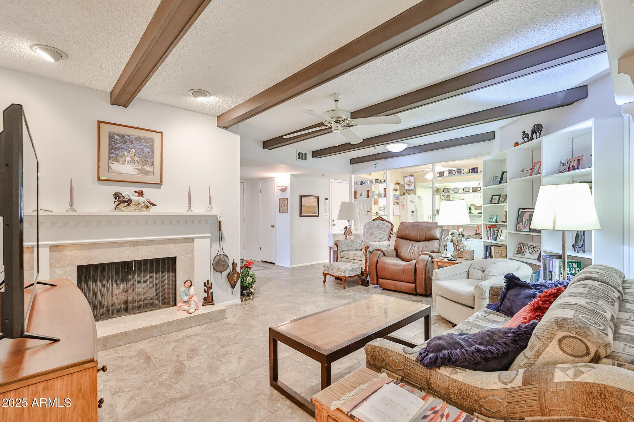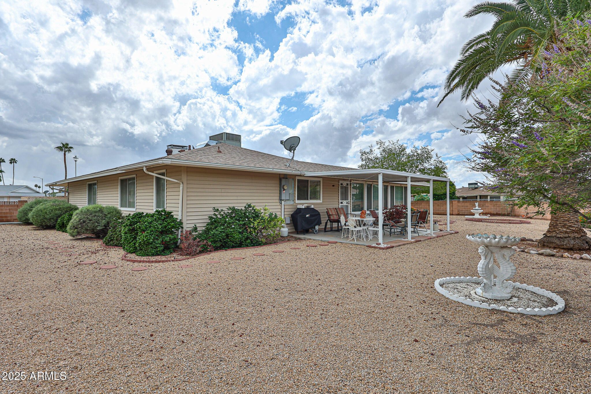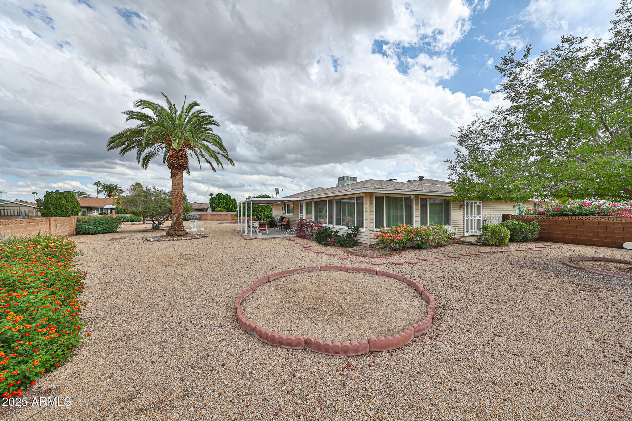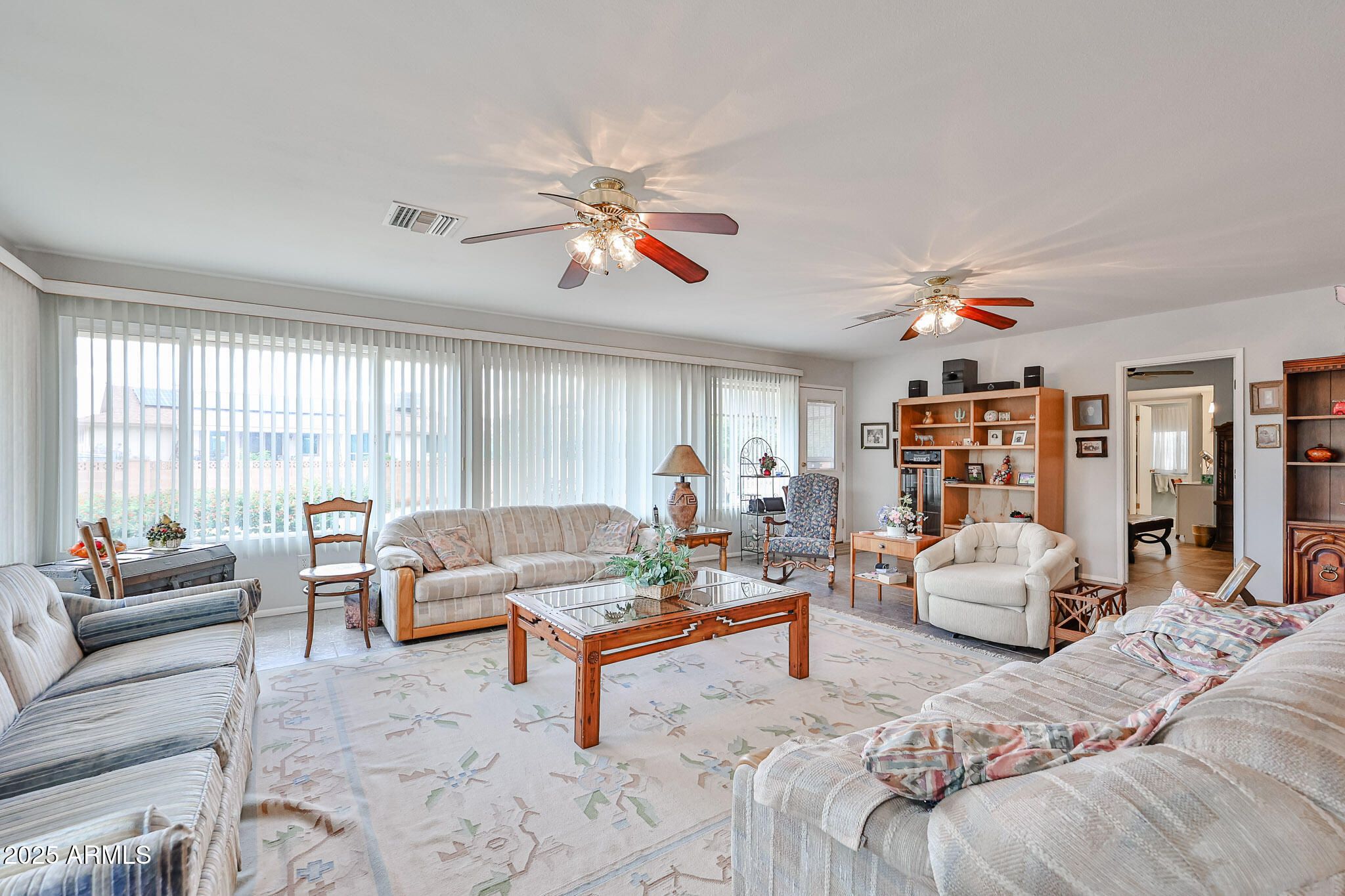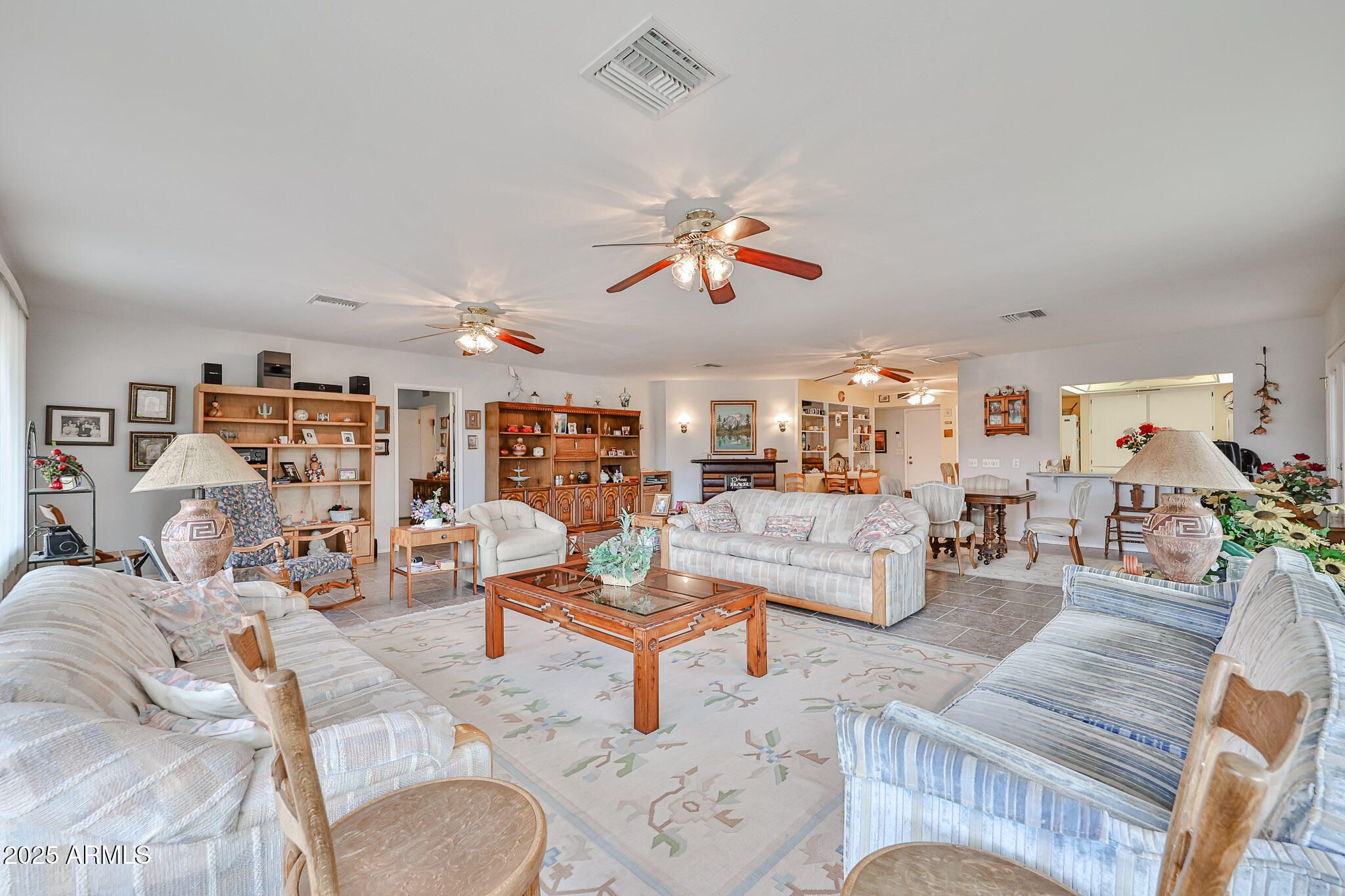 Room to Roam. This solid built Sun City property boast and huge expansion living area with tile floors throughout. Fireplace, formal living and newly renovated custom shower in primary bath. Covered patio faces North for ideal shade.