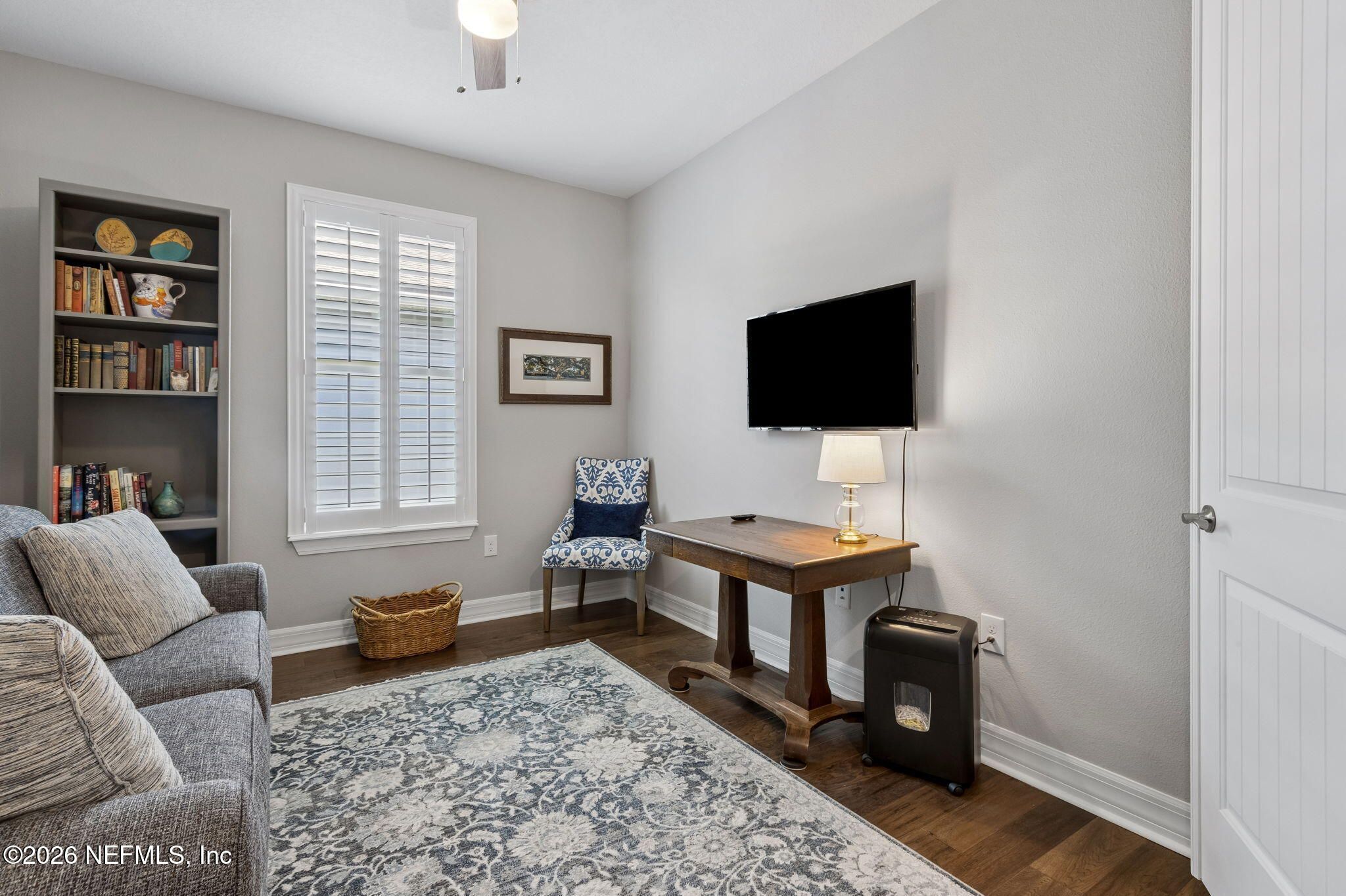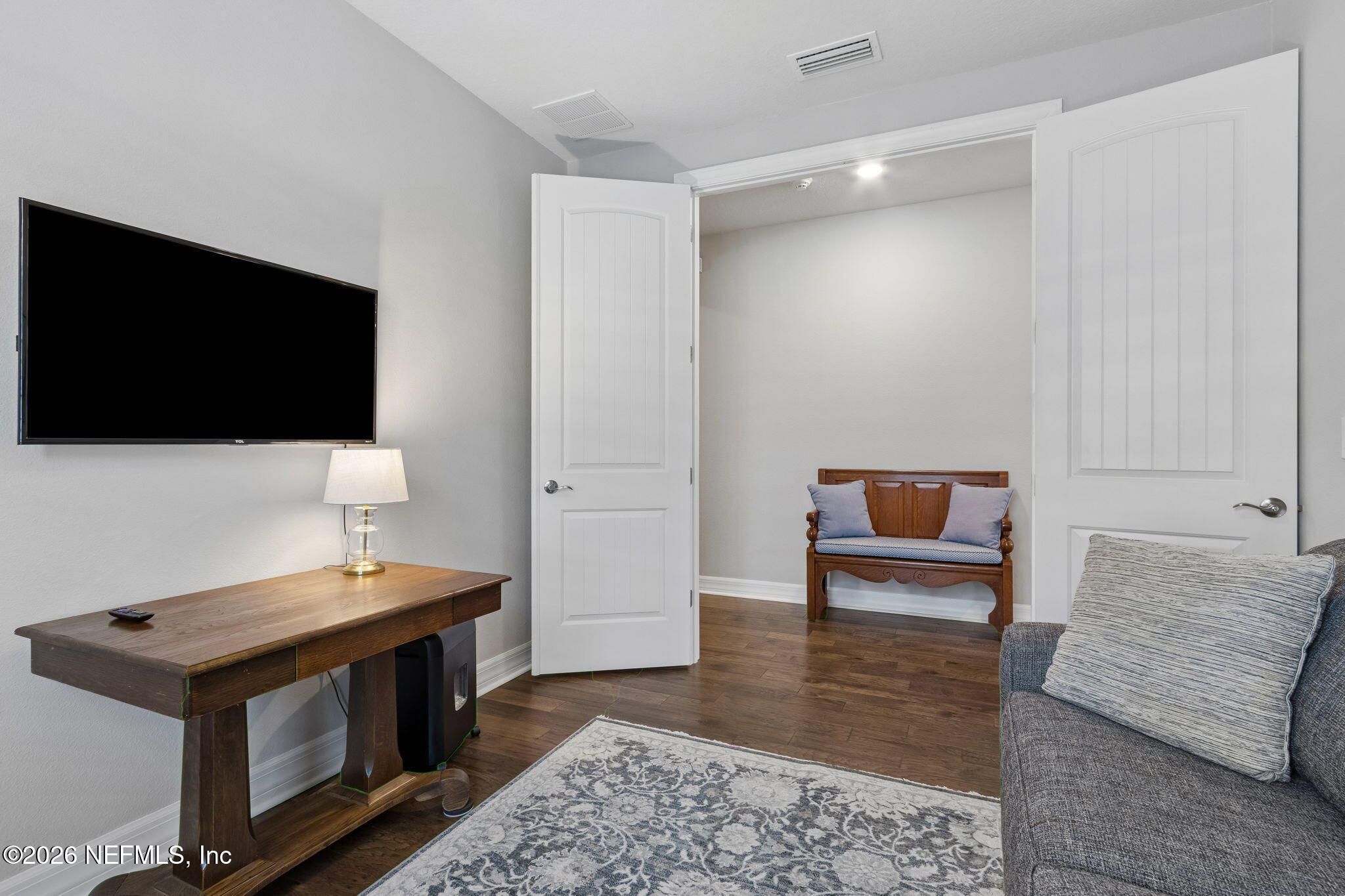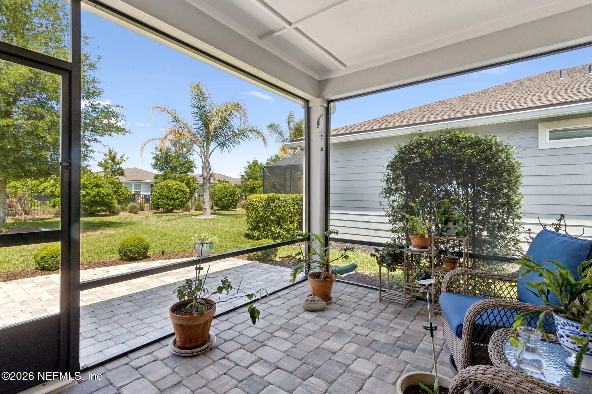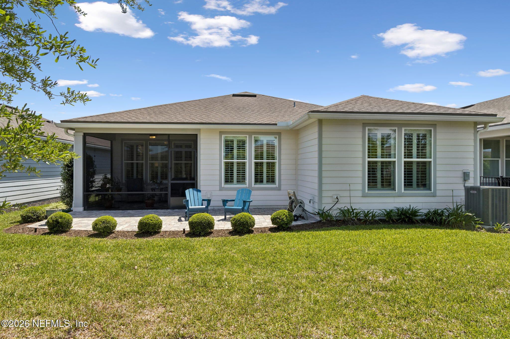 Located in a sought-after 55+ community, this highly desirable Mystique floor plan showcases tasteful upgrades and thoughtful design throughout. The home features gorgeous, engineered wood flooring in the main living areas and bedrooms, complemented by plantation shutters and elegant eight-foot doors. Levelor light-filtering cellular shades on the patio slider add both style and functionality, while abundant storage ensures everything has its place. The kitchen is a true centerpiece, offering quartz countertops, a large island perfect for gathering, and beautiful glass-front cabinetry accented by an exquisite tile backsplash. Additional features include reverse osmosis water, pull-out shelving, and an open layout that seamlessly overlooks the spacious living area-ideal for entertaining. A split-bedroom floor plan provides privacy for guests, while the versatile flex room can serve as a home office, additional living space, or craft room. Step outside to relax on the screened lanai with an extended patio, all set within a private backyard-perfect for enjoying Florida living year-round. This community boasts of state-of-the-art amenities for an active lifestyle. Conveniently located near shopping, dining, interstate access, and just a short drive to the beach, this home offers the perfect blend of comfort, style, and location.