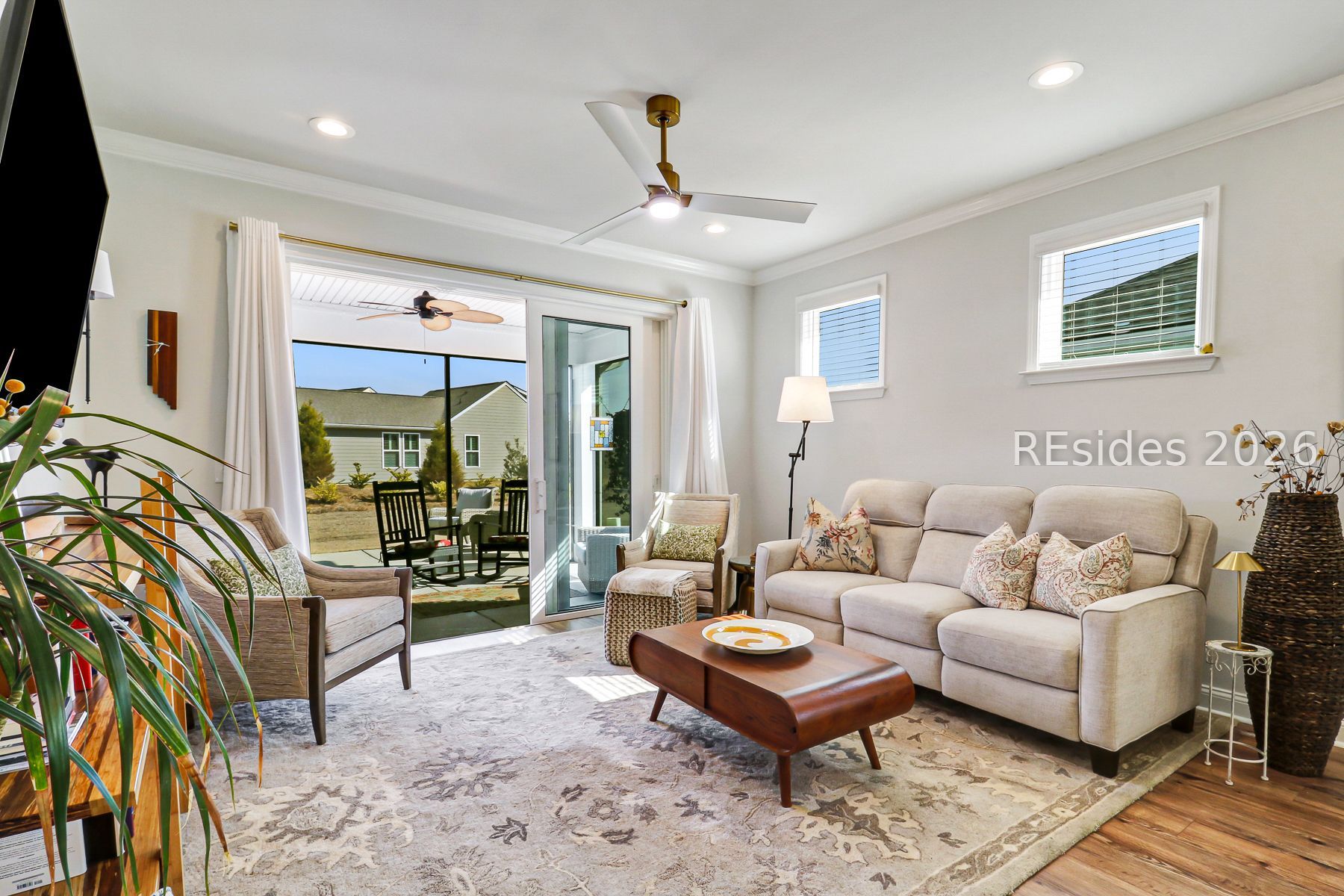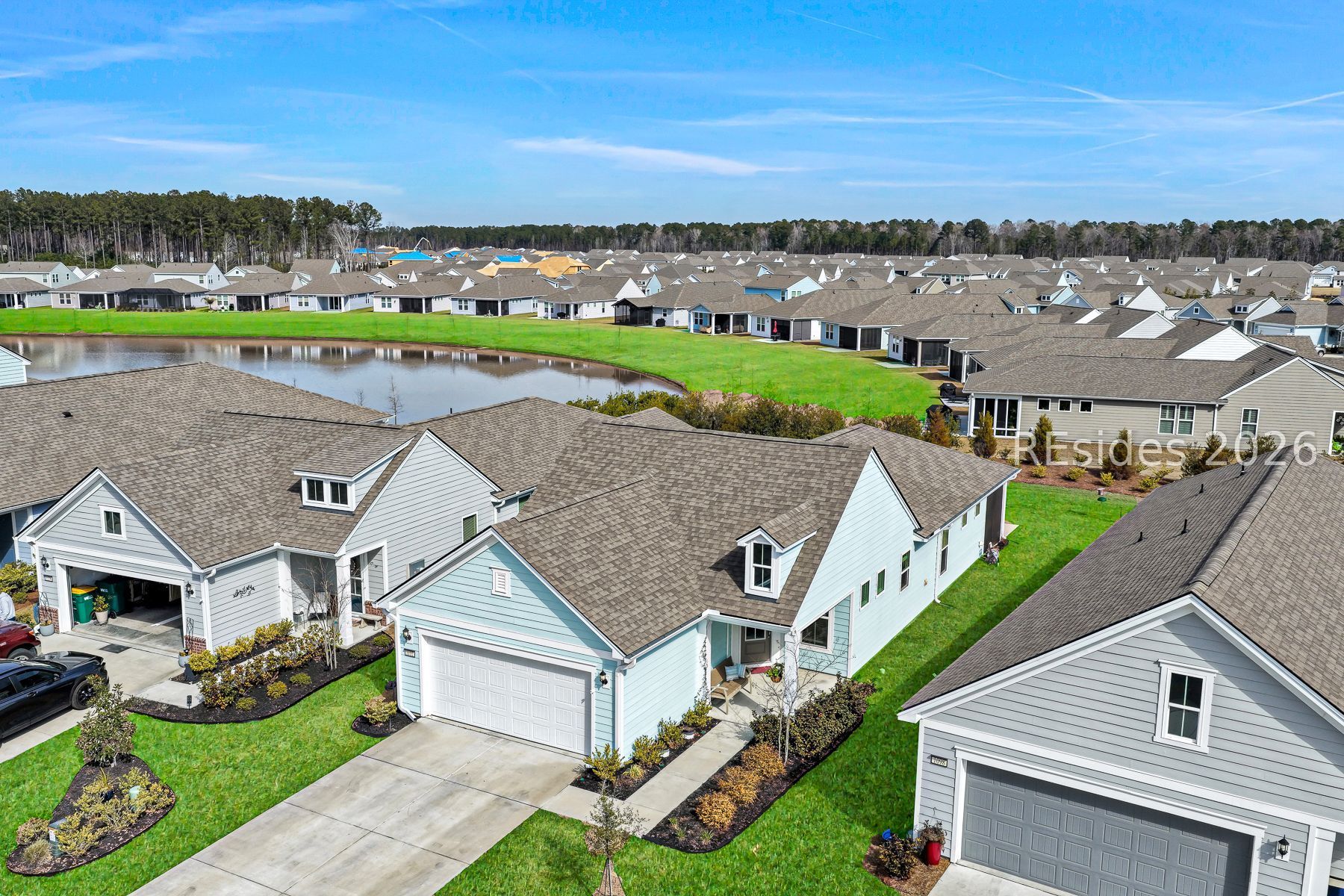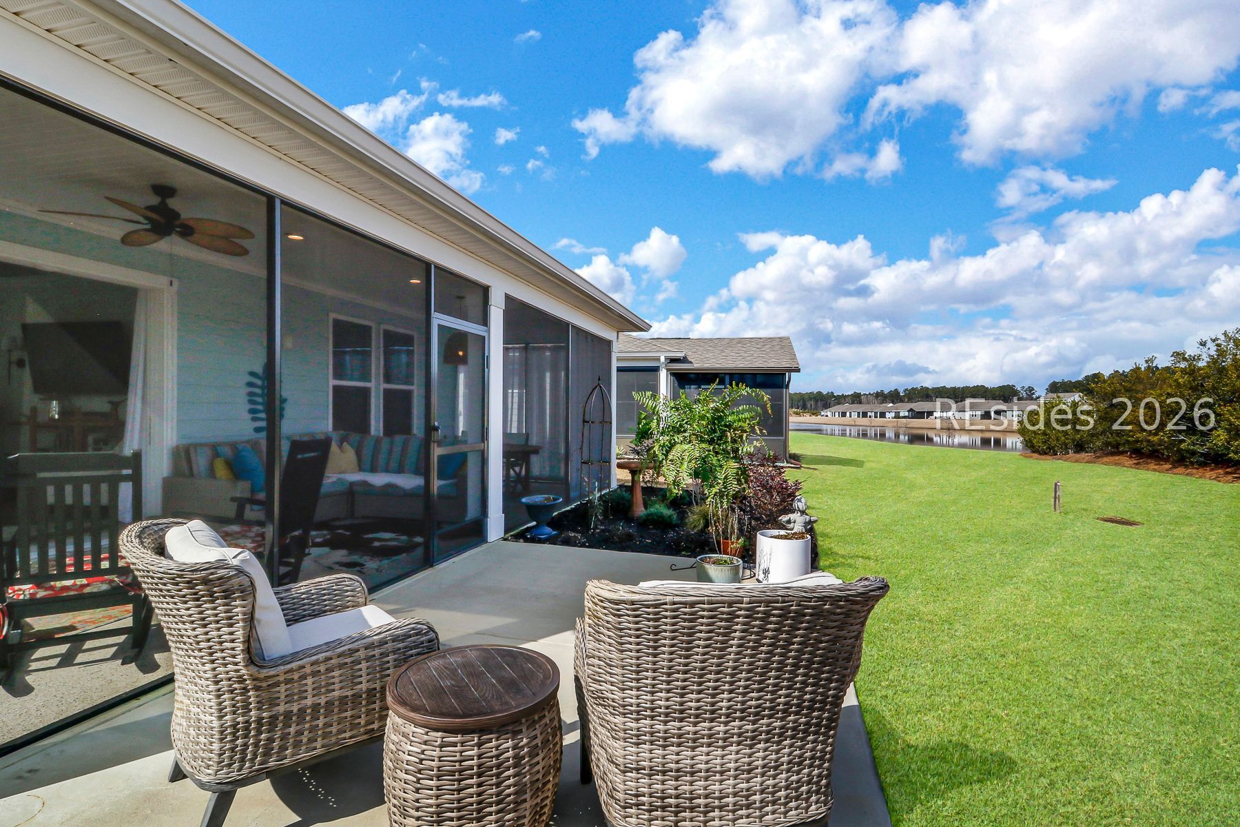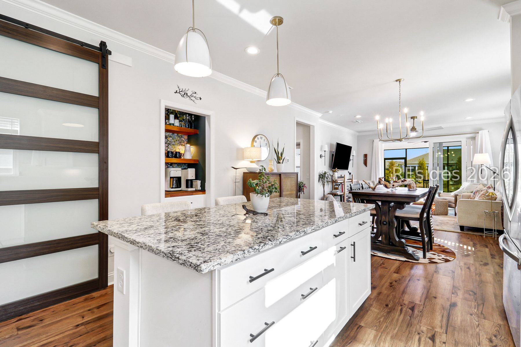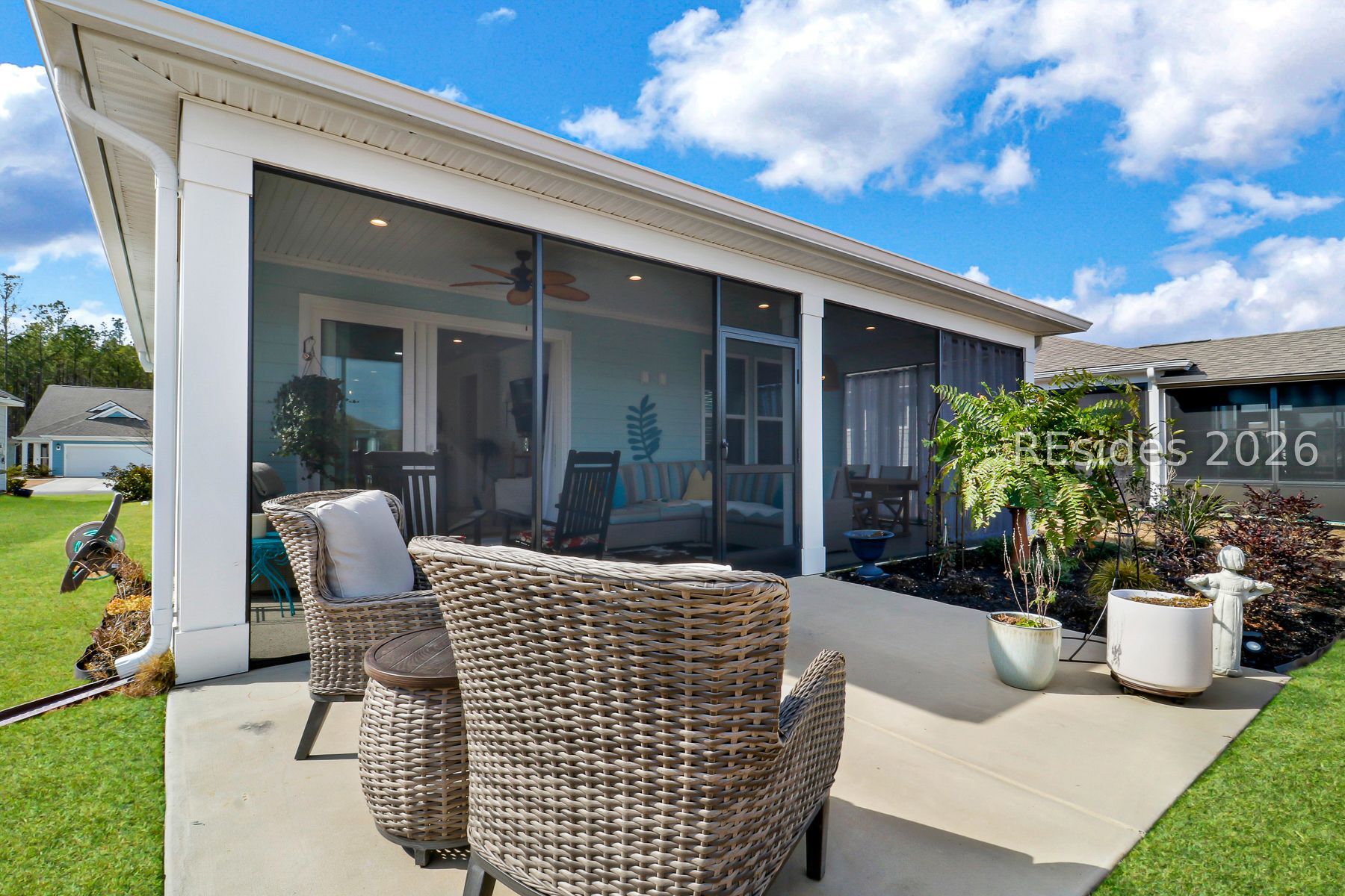 Completed in 2023, this refined Contour model offers an elevated approach to Lowcountry living, blending modern comfort with thoughtful design in a vibrant, resort style 55+ community. A welcoming formal entry opens to a light filled, open concept interior finished with clean lines, seamless flow, and upscale details throughout.The kitchen anchors the home with a striking statement island, stainless steel appliances, and generous counter space, creating an inviting space for daily living and entertaining. The main living area flows seamlessly to a covered and screened porch, enhancing the indoor outdoor experience and extending the living space for relaxed Lowcountry enjoyment.Upgrades include crown molding throughout, epoxy on both two car garage and lanai floors, build-out of coffee nook that can double as a bar, landscaping at front entrance and backyard, installation of sliding frosted glass barn door to provide extra privacy for guests, and a murphy bed in guest room.A flexible guest suite offers added privacy, while a dedicated home office provides a functional and polished workspace. The primary suite is designed for comfort and ease, supported by a smart layout that promotes low maintenance living.Impeccably maintained and move in ready, this home delivers modern style, everyday livability, and access to golf, amenities, and an active lifestyle, with future community enhancements already underway.