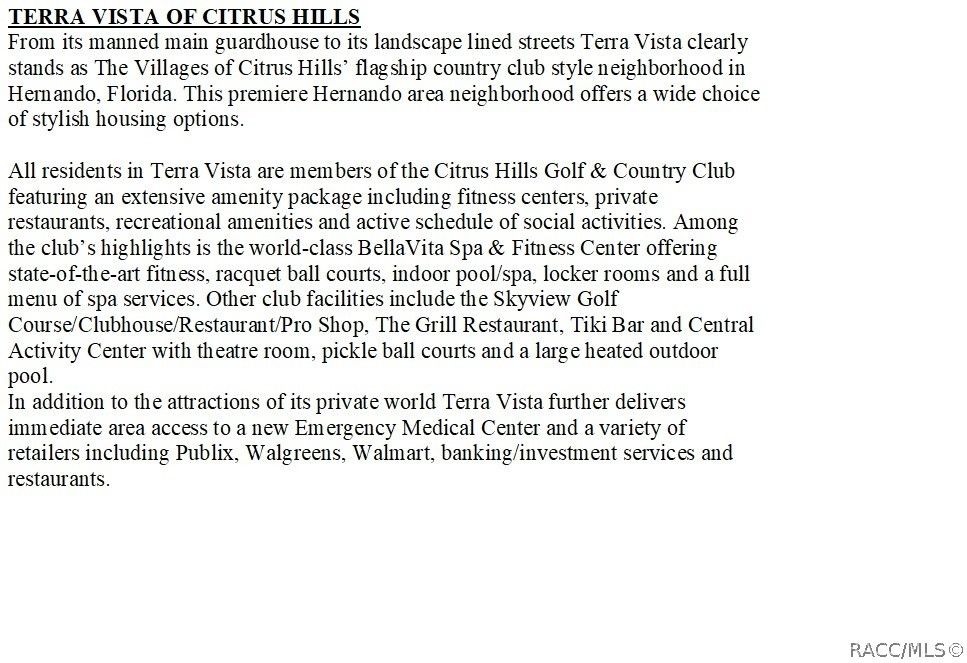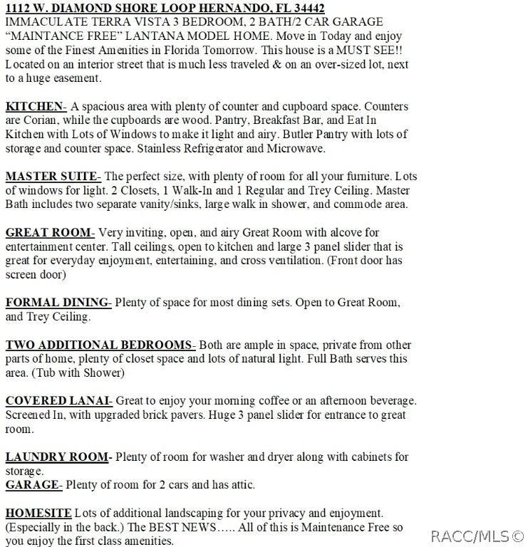 NOTHING IS WRONG WITH THIS HOME, IT IS JUST TIME TO SELL. SELLERS HAVE GOT VERY AGGRESSIVE WITH THE PRICE. TAKE ADVANTAGE OF THIS OPPORUNITY TO LIVE IN ONE OF THE PREMIER HIGHLY AMMENITIZED PLANNED COMMUNITIES. IMMACULATE TERRA VISTA 3 BEDROOM, 2 BATH/2 CAR GARAGE “MAINTANCE FREE” LANTANA MODEL HOME. Move in Today and enjoy some of the Finest Amenities in Florida Tomorrow. This house is a MUST SEE!! Located on an interior street that is much less traveled & on an over-sized lot, next to a huge easement. There are too many features to list here, (please see picture section for extensive list) but the highlights include, an Airy, Open Great Room design that provides ample space for everyday living & entertaining. A spacious Kitchen with Wood Cabinets, Corian Counters, Breakfast Bar, Butler's Pantry and Eat in Area. The spacious Master Bedroom Suite has 2 closets including a walk-in and plenty of natural light. The Master Bath Suite is fit for Royalty. There are Two Additional Bedrooms that are private from the rest of home. A Full Bath serves this area. A Formal Dining area completes the interior living space. Can’t forget about the screen enclosed Lanai with a beautifully landscaped yard and the easement next store allows for a lot more privacy. Come and Discover why Terra Vista is the Place to Be Today and enjoy the lifestyle of Citrus Hills Golf and Country Club!