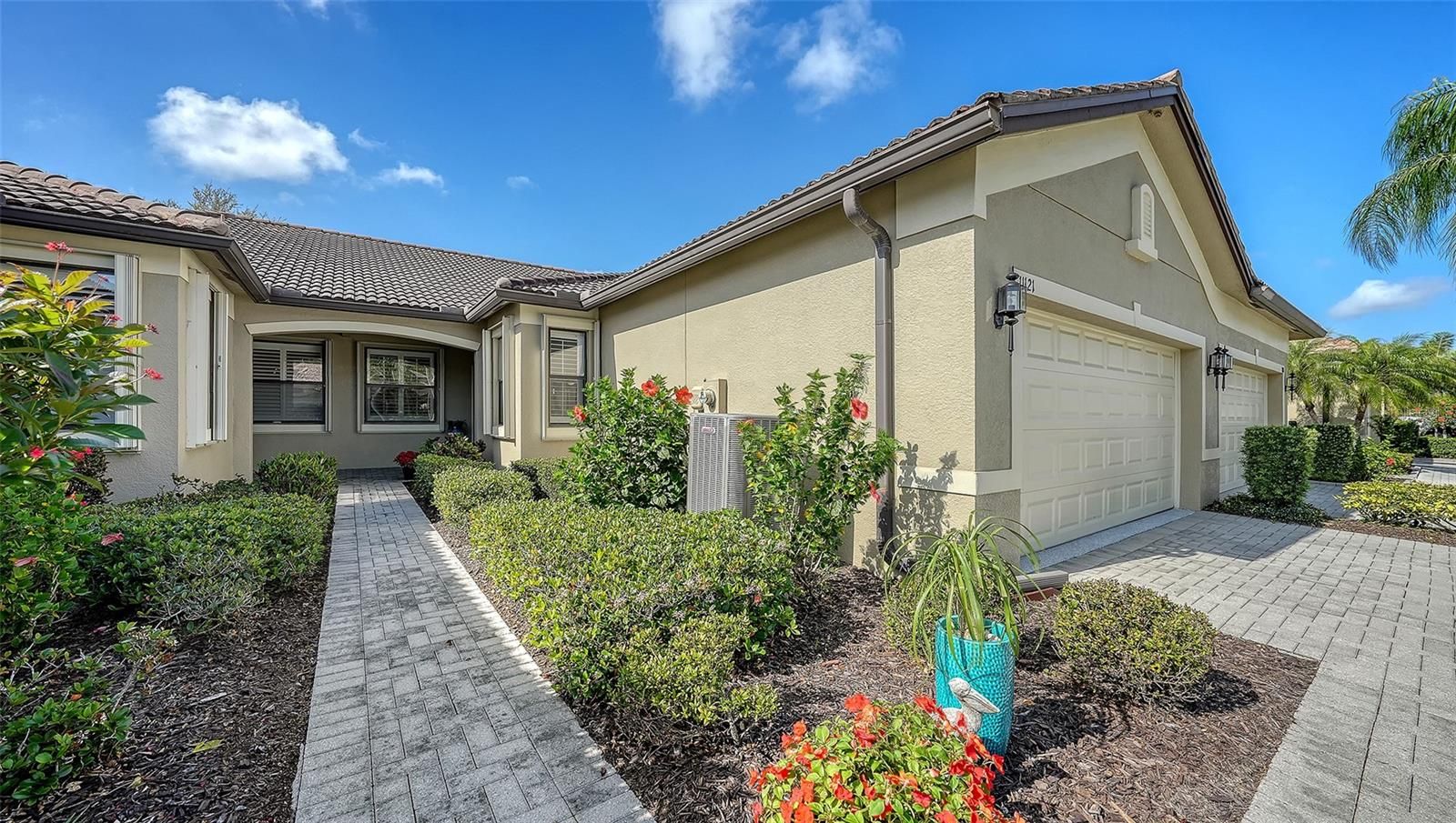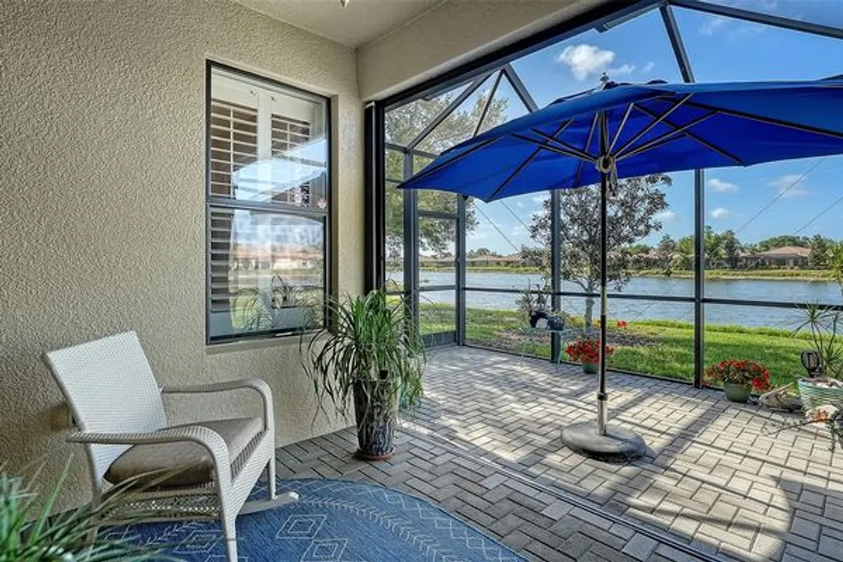 Peaceful, easy living in the resort-style community of Venetian Falls. Beautifully maintained 2-bed + den attached villa with sparkling LAKE views. An inviting open floorplan designed for comfort and effortless living. Glass and screen "storm" door at entry. Tile flooring throughout the main living areas and engineered hardwood in the bedrooms. Stylish plantation shutters and easy to use accordion hurricane shutters. Two-car attached garage with epoxy-coated flooring, workbench, storage cabinets plus drop down shelving. Stone paver driveway, walkway and lanai. Well-appointed kitchen with granite countertops, breakfast bar, solid wood cabinetry, pantry closet and Whirlpool stainless steel appliances. Versatile den with French doors provides space for a home office, media room, or additional guest accommodations. Primary suite with large walk-in closet and ensuite bath featuring dual vanity and walk-in shower. Both bathrooms have Corian countertops. in-unit LG washer and dryer. Freshly painted throughout Spring 2025. Extended lanai with serene lake views and enhanced with no-see-um screens, ideal for year-round enjoyment. You will love watching several varieties of Florida birds and wildlife everyday around the lake. Venetian Falls offers an exceptional lifestyle with a 16,000 SF clubhouse featuring a grand ballroom, fitness center, billiards room, craft and card rooms, internet café, and meeting spaces. Residents enjoy a heated lap pool and spa, resistance walking pool, bocce ball courts, a 9-hole putting green, and scenic walking and biking paths throughout the community. A full-time activity director ensures a vibrant social calendar, while on-site management provides added convenience. The reasonable HOA fee includes lawn maintenance, trimming, mulching, irrigation, cable TV, internet, exterior paint scheduling, and roof power washing—allowing for truly low-maintenance living with reasonable fees. Ideally located just minutes from Wellen Park and historic downtown Venice for shopping, dining, entertainment, everyday conveniences, and the beautiful Gulf beaches.