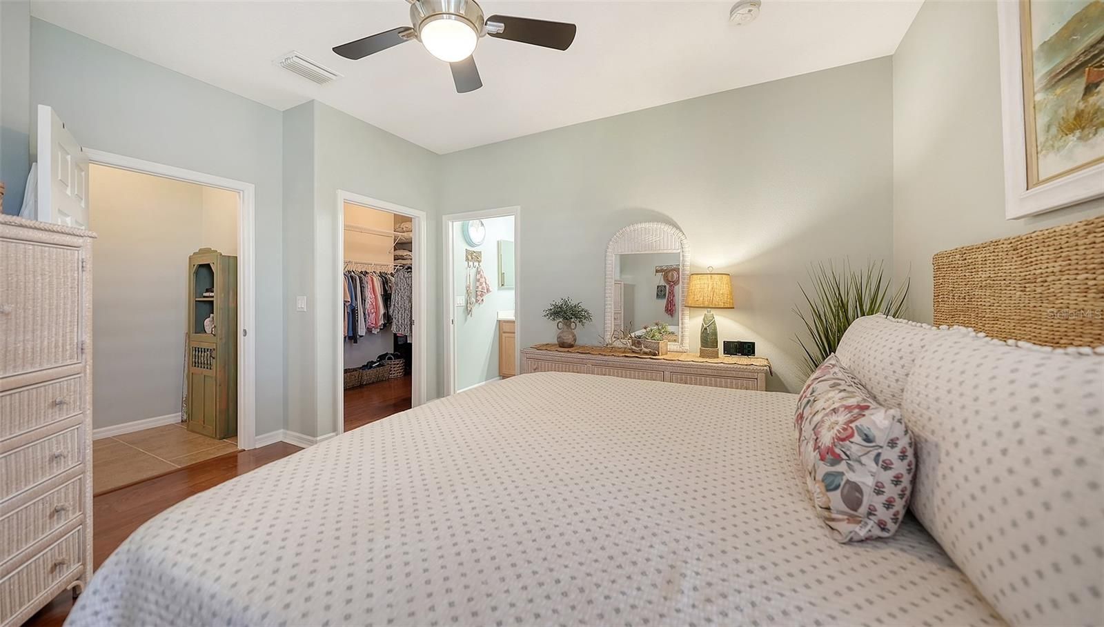 - Ceiling Fan(s), Eat-in Kitchen, High Ceilings, Living/Dining Room, Open Floorplan, Main Level Primary, Solid-Wood Cabinets, Stone Counters, Thermostat, Walk-In Closet(s), Window Treatments