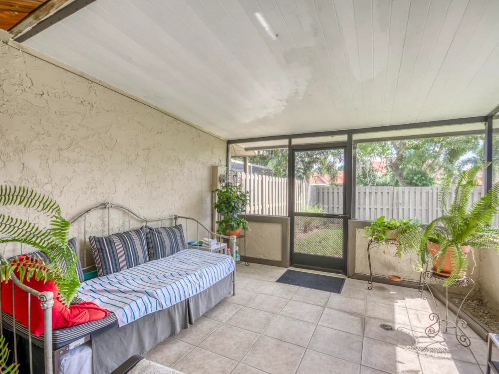 Welcome to this bright and peaceful 3BR/2.5BA home in the charming Boynton Beach 55+ community of Oakdale. Set on a spacious lot with a lush, private backyard oasis perfect for relaxing, entertaining, or spending time with pets and family. This well-maintained home features a vaulted ceiling living room with wet bar, updated kitchen with white cabinetry, plenty of counter space, a dedicated coffee station, and new appliances, and a cozy Florida room for year-round enjoyment. The primary suite offers a walk-in closet, private balcony, and garden tub in the en-suite. Upgrades include a new A/C, new hurricane shutters, and tile throughout. With low HOA dues, no required club membership, and a pet-friendly vibe, this is a hidden gem close to Woolbright, shopping, dining, and more!