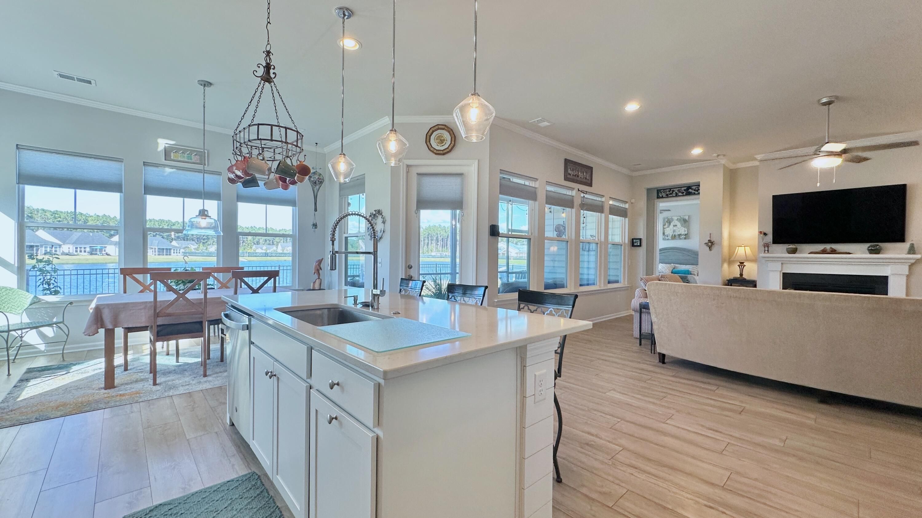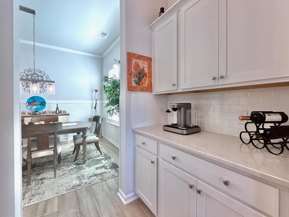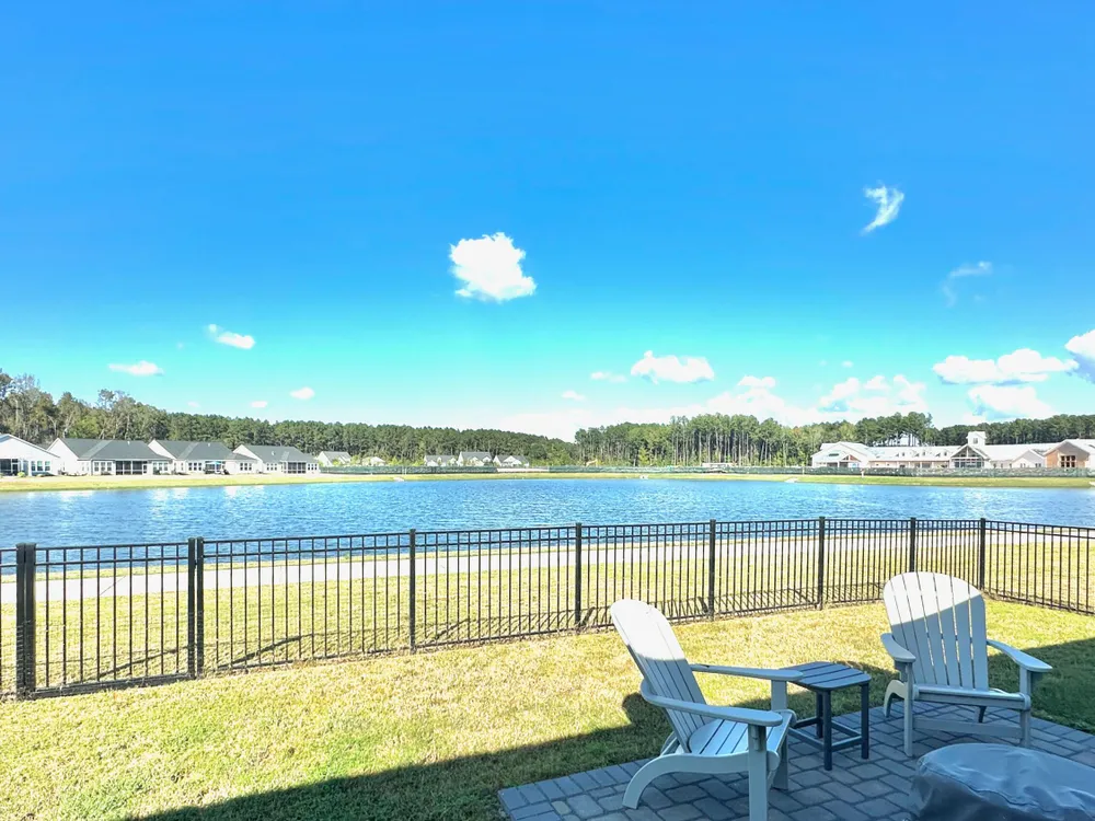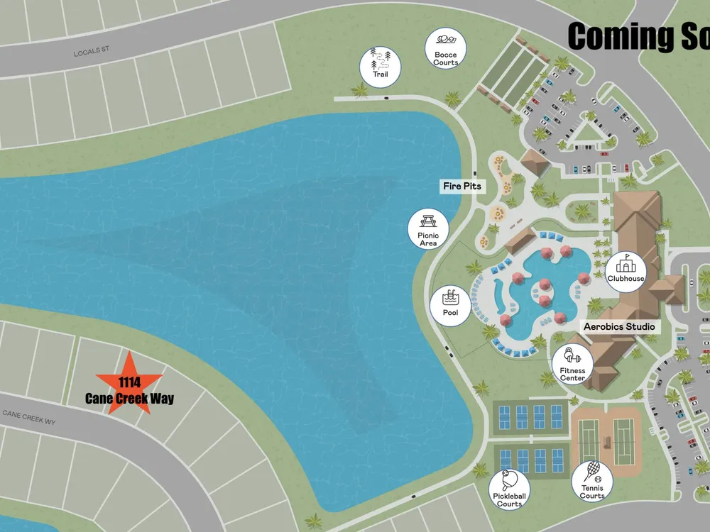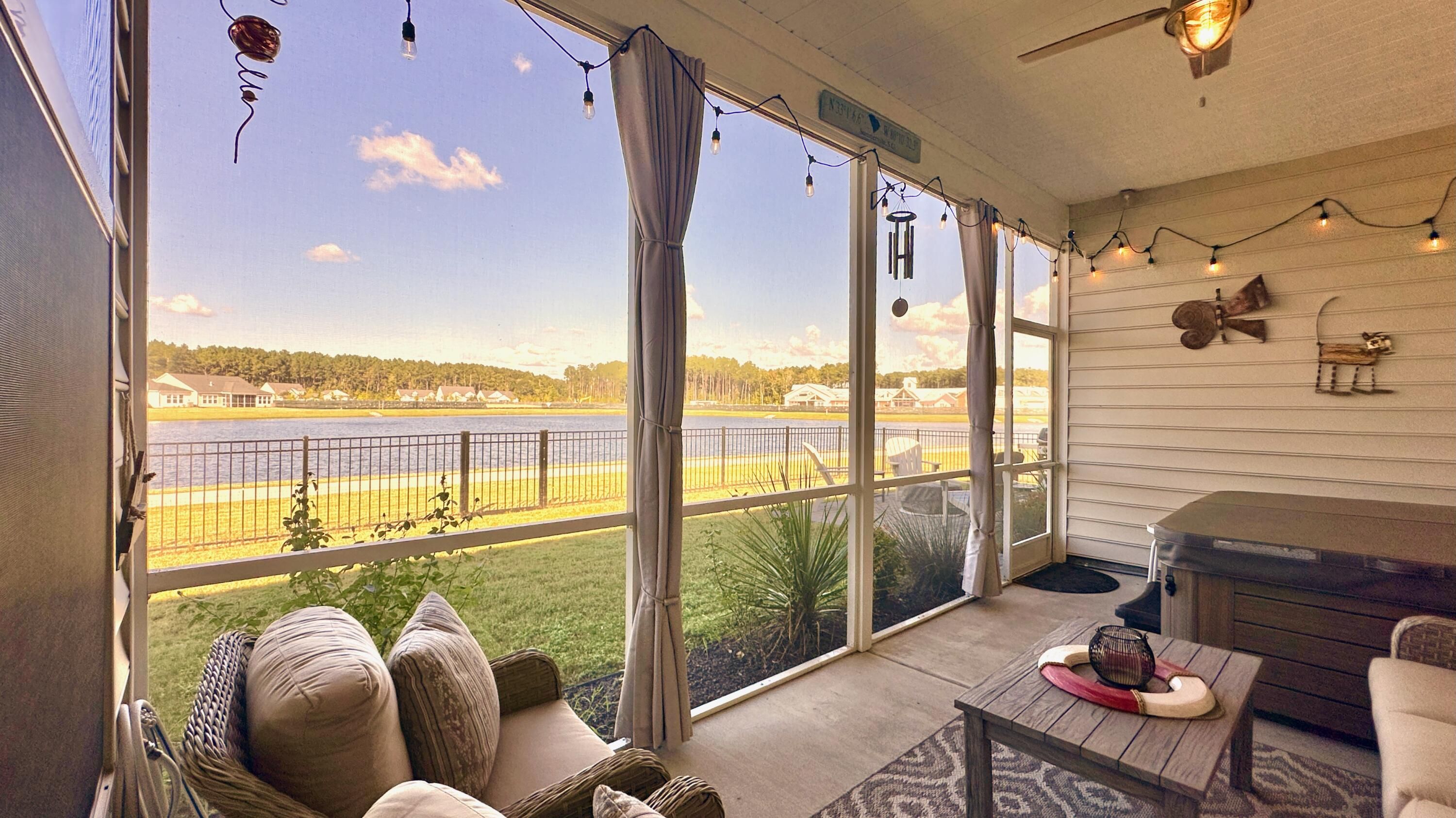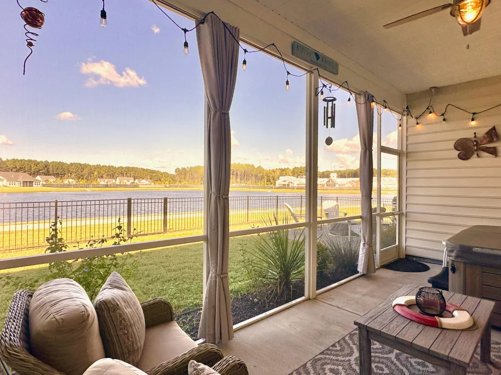 Welcome a stunning single-level retreat in the sought-after Horizons 55+ community. This special Juniper model, no longer in production, offers the look and feel of new construction without the wait. With 4 bedrooms and 3 baths, this home delivers modern living at its finest, featuring an open-concept design, abundant natural light, and a premier lakeside view along the entire rear of the home.The residence provides single-level living with premium finishes, including 10-foot ceilings and 8-foot doors throughout to create an expansive, airy ambiance. Thoughtful upgrades add refined detail and lasting appeal. Enjoy the serene lakeside from multiple living areas and the spacious screened porch, delivering a tranquil for everyday living and entertaining.The kitchen is a chef-inspired centerpiece with quartz countertops, a subway tile backsplash, a large walk-in pantry, and a substantial island. Recessed lighting plus pendant fixtures over the island provide a bright, contemporary workspace. The dining room features elegant wainscoting, while crown molding accents the foyer, hallways, kitchen, living room, and primary suite for a cohesive, crafted feel. The owner's suite shines with a tray ceiling and an ensuite bathroom offering a zero-entry shower with frameless glass doors, complemented by a generous walk-in closet. Smart window treatments and lighting enhance the interior, with cellular shades in the living room and kitchen, cordless Levolor blinds in bedrooms and dining, and updated lighting throughout for a clean, uncluttered aesthetic. Interior upgrades include shiplap accents in the laundry room, kitchen island, and the garage-to-hallway custom built drop zone, ensuring texture and warmth, along with ceiling fans with separate switches for comfort. Outside, a three-car garage accommodates vehicles and storage, while a large screened porch overlooks the nearly complete amenity center with indoor and outdoor pools. A 10x10 paver patio with a BBQ grill bump-out, a black aluminum backyard fence, and a front-yard palm tree boost curb appeal. HOA mows the lawn and refreshes flowerbeds twice a year, simplifying maintenance. This home blends luxury, convenience, and a premier lakeside setting all on one level.