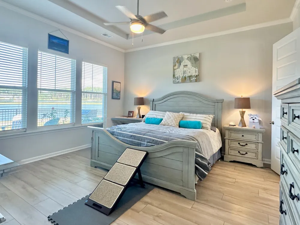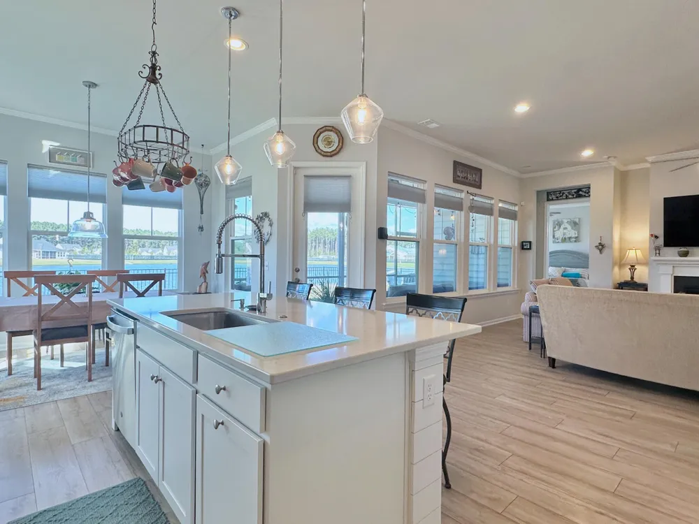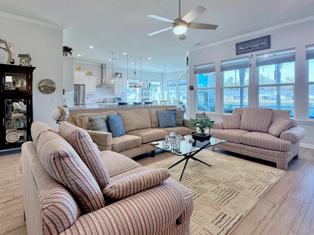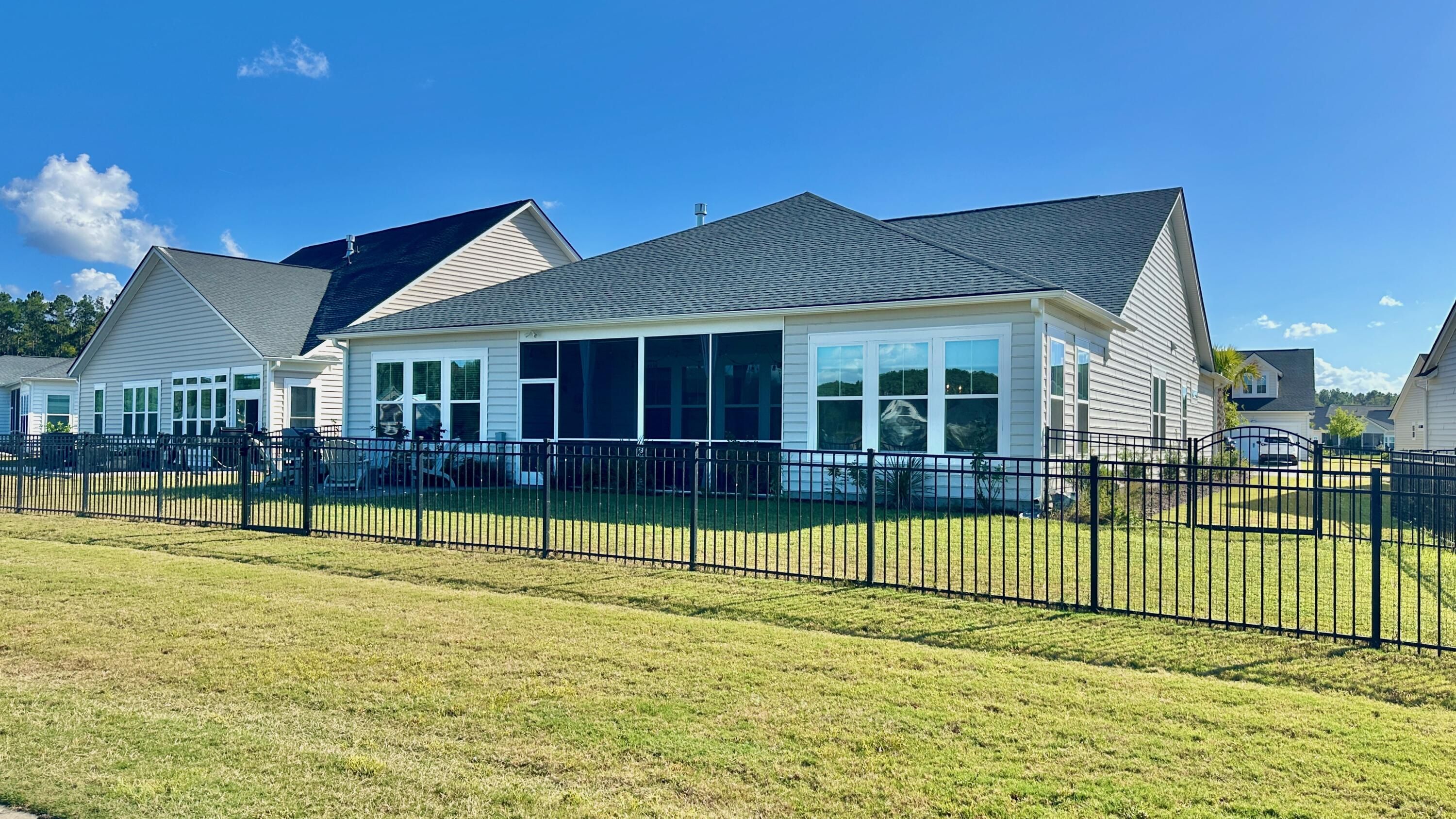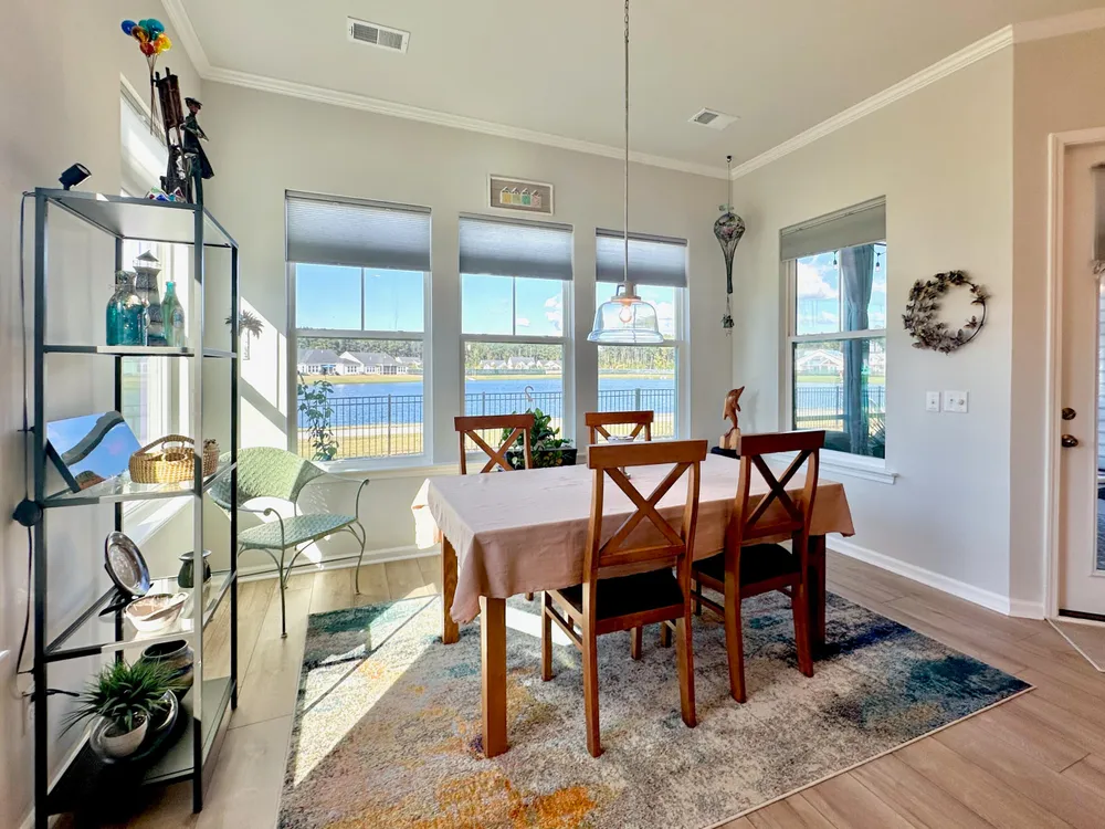 Welcome a stunning single-level retreat in the sought-after Horizons 55+ community. This special Juniper model, no longer in production, offers the look and feel of new construction without the wait. With 4 bedrooms and 3 baths, this home delivers modern living at its finest, featuring an open-concept design, abundant natural light, and a premier lakeside view along the entire rear of the home.The residence provides single-level living with premium finishes, including 10-foot ceilings and 8-foot doors throughout to create an expansive, airy ambiance. Thoughtful upgrades add refined detail and lasting appeal. Enjoy the serene lakeside from multiple living areas and the spacious screened porch, delivering a tranquil for everyday living and entertaining.The kitchen is a chef-inspired centerpiece with quartz countertops, a subway tile backsplash, a large walk-in pantry, and a substantial island. Recessed lighting plus pendant fixtures over the island provide a bright, contemporary workspace. The dining room features elegant wainscoting, while crown molding accents the foyer, hallways, kitchen, living room, and primary suite for a cohesive, crafted feel. The owner's suite shines with a tray ceiling and an ensuite bathroom offering a zero-entry shower with frameless glass doors, complemented by a generous walk-in closet. Smart window treatments and lighting enhance the interior, with cellular shades in the living room and kitchen, cordless Levolor blinds in bedrooms and dining, and updated lighting throughout for a clean, uncluttered aesthetic. Interior upgrades include shiplap accents in the laundry room, kitchen island, and the garage-to-hallway custom built drop zone, ensuring texture and warmth, along with ceiling fans with separate switches for comfort. Outside, a three-car garage accommodates vehicles and storage, while a large screened porch overlooks the nearly complete amenity center with indoor and outdoor pools. A 10x10 paver patio with a BBQ grill bump-out, a black aluminum backyard fence, and a front-yard palm tree boost curb appeal. HOA mows the lawn and refreshes flowerbeds twice a year, simplifying maintenance. This home blends luxury, convenience, and a premier lakeside setting all on one level.