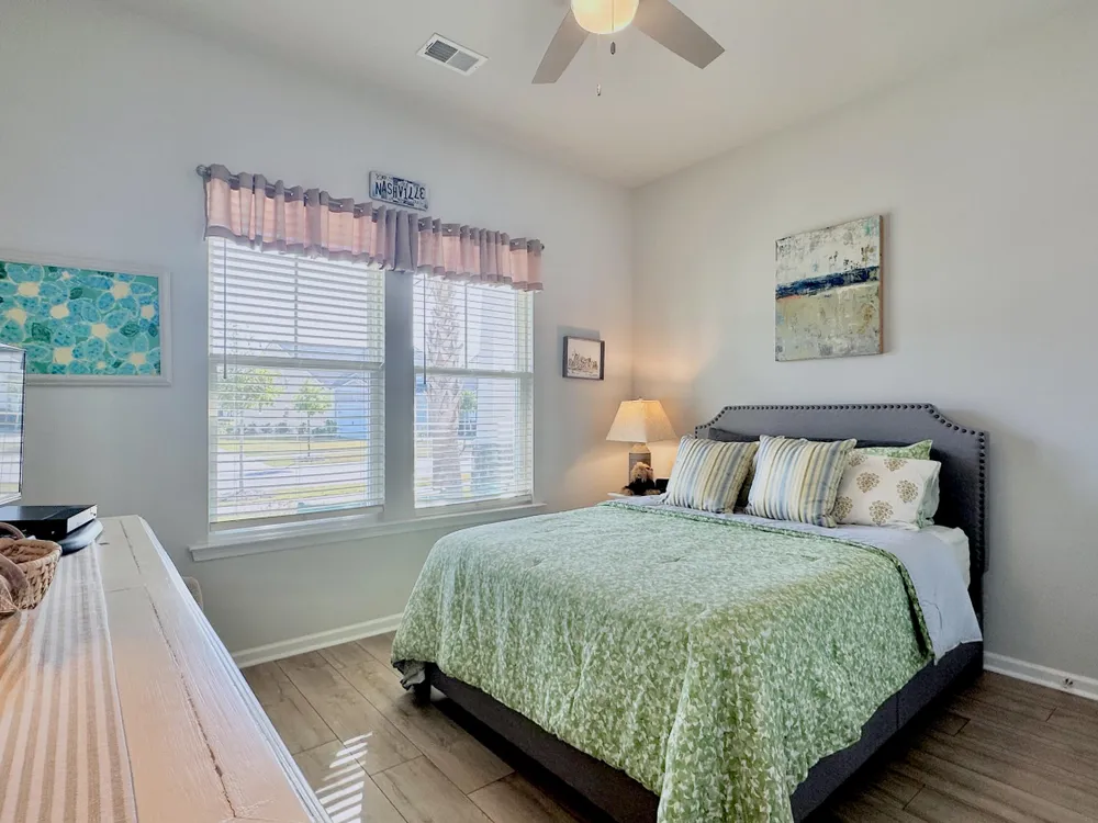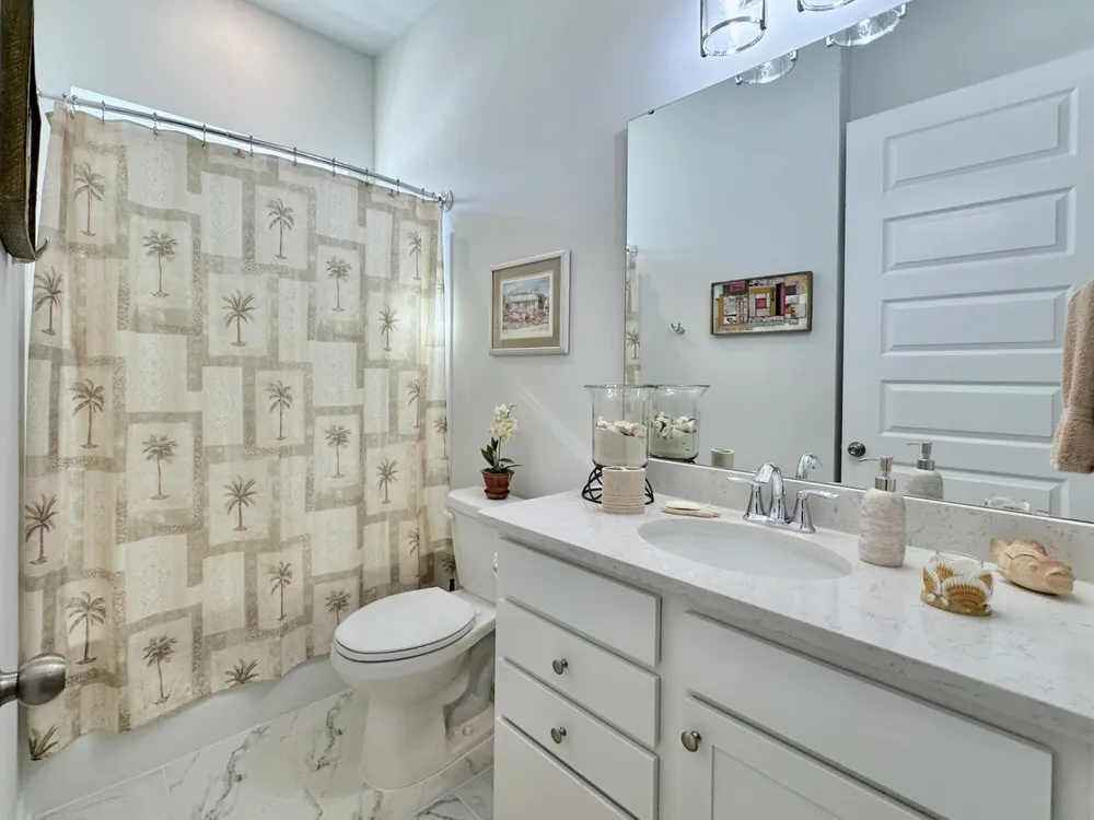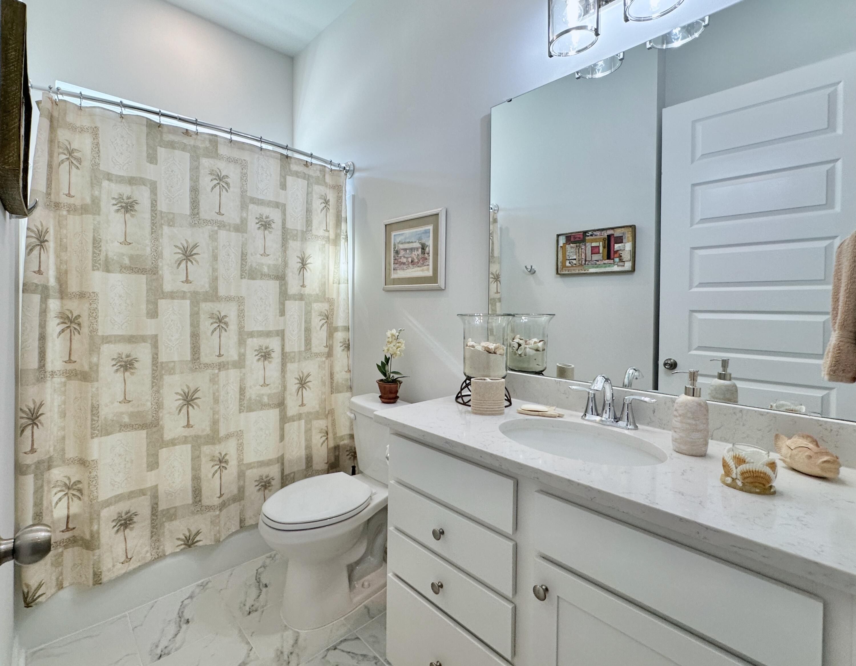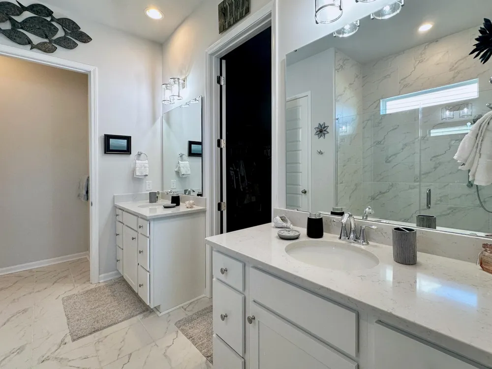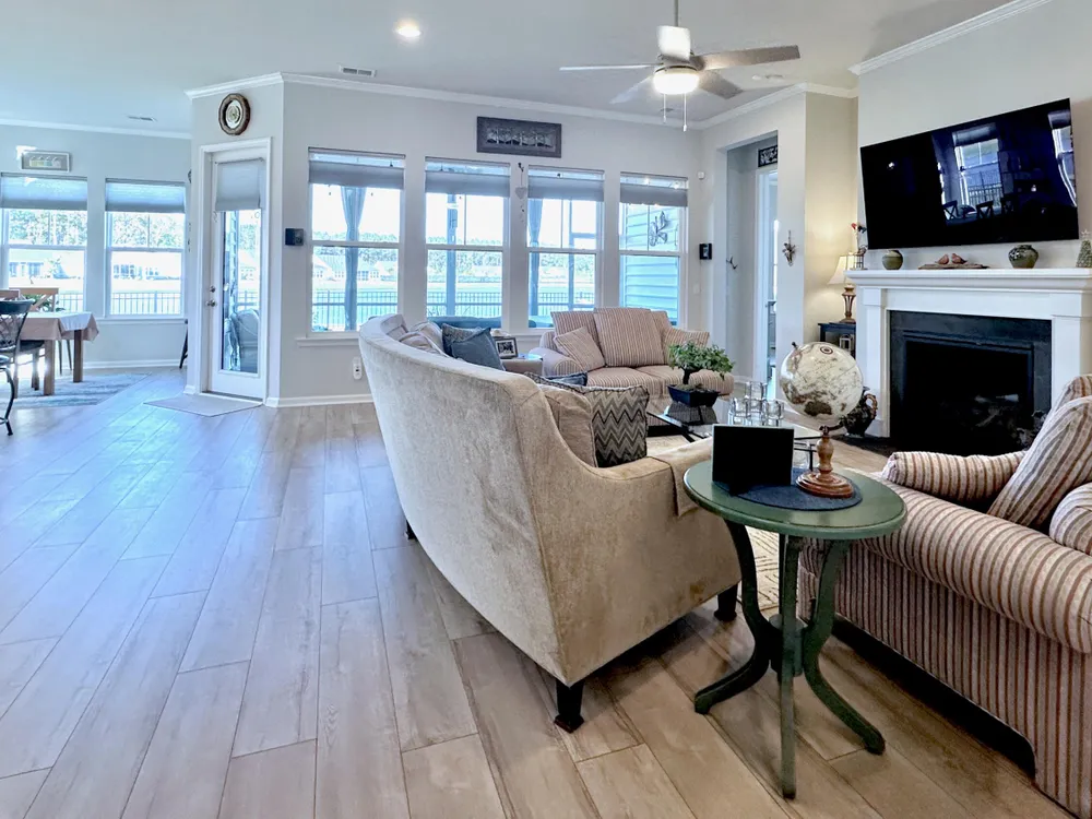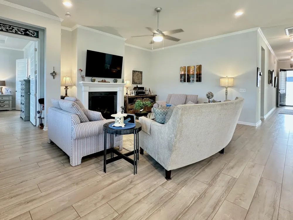 Welcome a stunning single-level retreat in the sought-after Horizons 55+ community. This special Juniper model, no longer in production, offers the look and feel of new construction without the wait. With 4 bedrooms and 3 baths, this home delivers modern living at its finest, featuring an open-concept design, abundant natural light, and a premier lakeside view along the entire rear of the home.The residence provides single-level living with premium finishes, including 10-foot ceilings and 8-foot doors throughout to create an expansive, airy ambiance. Thoughtful upgrades add refined detail and lasting appeal. Enjoy the serene lakeside from multiple living areas and the spacious screened porch, delivering a tranquil for everyday living and entertaining.The kitchen is a chef-inspired centerpiece with quartz countertops, a subway tile backsplash, a large walk-in pantry, and a substantial island. Recessed lighting plus pendant fixtures over the island provide a bright, contemporary workspace. The dining room features elegant wainscoting, while crown molding accents the foyer, hallways, kitchen, living room, and primary suite for a cohesive, crafted feel. The owner's suite shines with a tray ceiling and an ensuite bathroom offering a zero-entry shower with frameless glass doors, complemented by a generous walk-in closet. Smart window treatments and lighting enhance the interior, with cellular shades in the living room and kitchen, cordless Levolor blinds in bedrooms and dining, and updated lighting throughout for a clean, uncluttered aesthetic. Interior upgrades include shiplap accents in the laundry room, kitchen island, and the garage-to-hallway custom built drop zone, ensuring texture and warmth, along with ceiling fans with separate switches for comfort. Outside, a three-car garage accommodates vehicles and storage, while a large screened porch overlooks the nearly complete amenity center with indoor and outdoor pools. A 10x10 paver patio with a BBQ grill bump-out, a black aluminum backyard fence, and a front-yard palm tree boost curb appeal. HOA mows the lawn and refreshes flowerbeds twice a year, simplifying maintenance. This home blends luxury, convenience, and a premier lakeside setting all on one level.