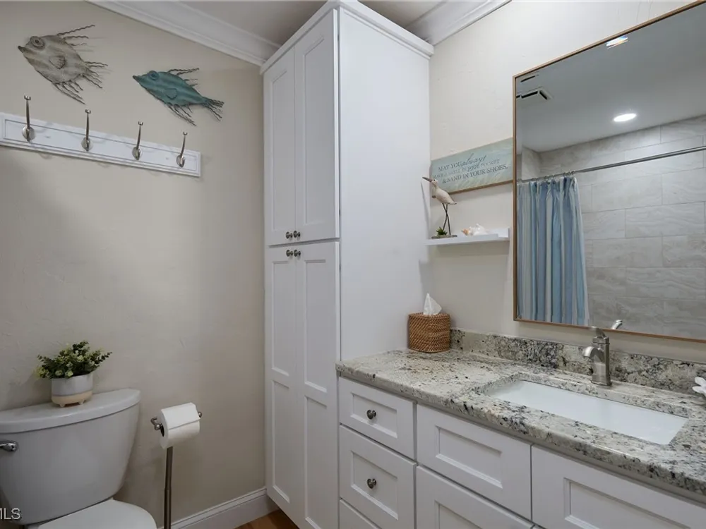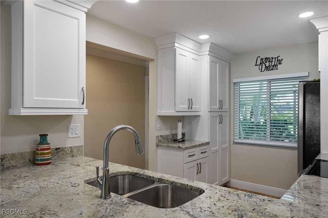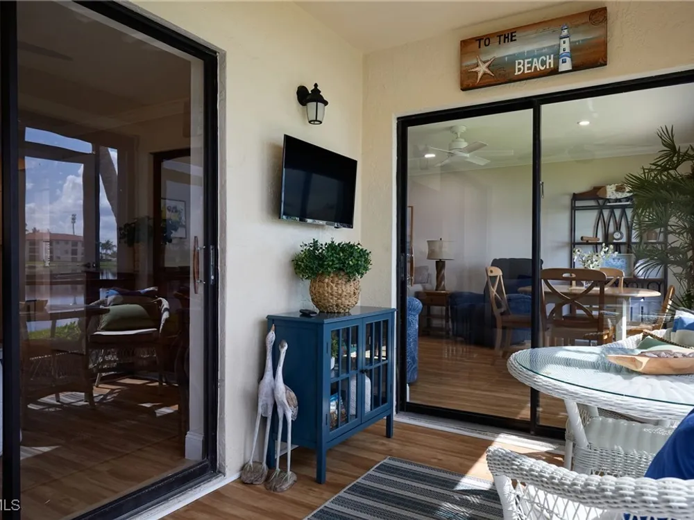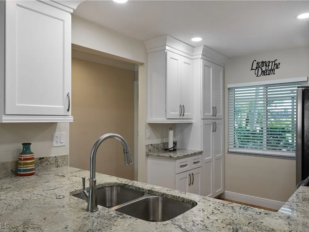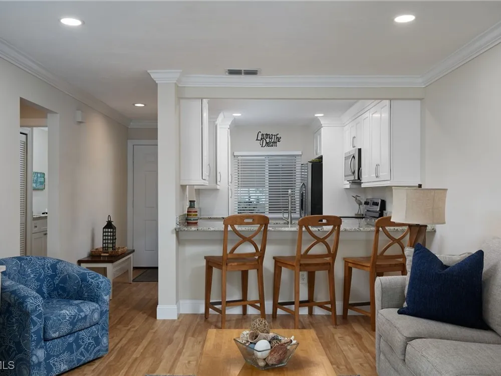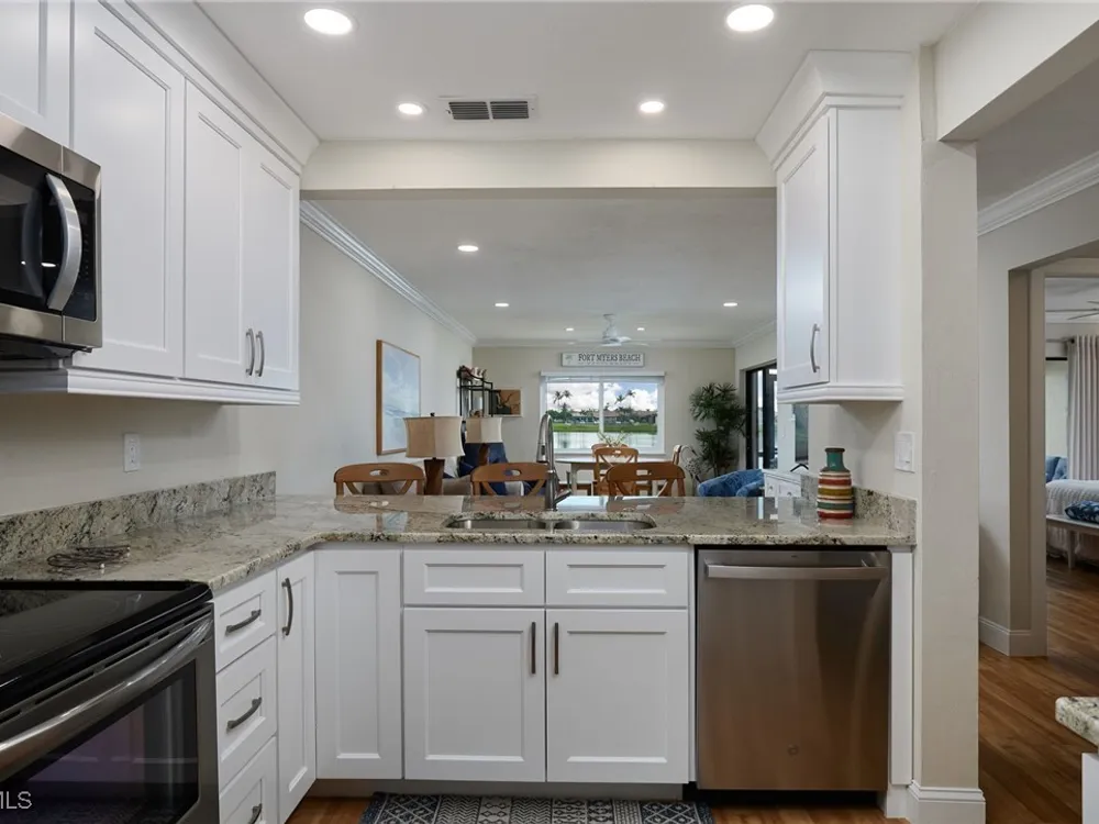 This tastefully remodeled 1st floor condo with a spectacular water view w/ leaning Palm Tree will make you want to take your shoes off and relax with a beachy drink in your hand! All you need is the drink because this condo is listed furnished turnkey! What else could you ask for? The beach is a few minutes away, with shopping, entertainment, beachfront dining and sunsets for days!! Kitchen and bathrooms are new with matching beautiful white ceiling-high cabinets, 6" crown molding, dovetail soft close drawers with gorgeous granite counter tops, stainless steel appliances, cabinets added in laundry room, sleeper couch for guests, High Impact Windows!! Carport parking spot #106 is always shaded :) Cinnamon Cove is a very active community, friendly neighbors and dog friendly with all the amenities you would want ~Pickleball, onsite activity director, exercise classes, ice cream social, food trucks, Bridge, live performances, community band "Cinnamon Crows", 1 main pool and 3 satellite pools, and the list goes on!!