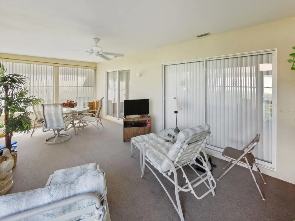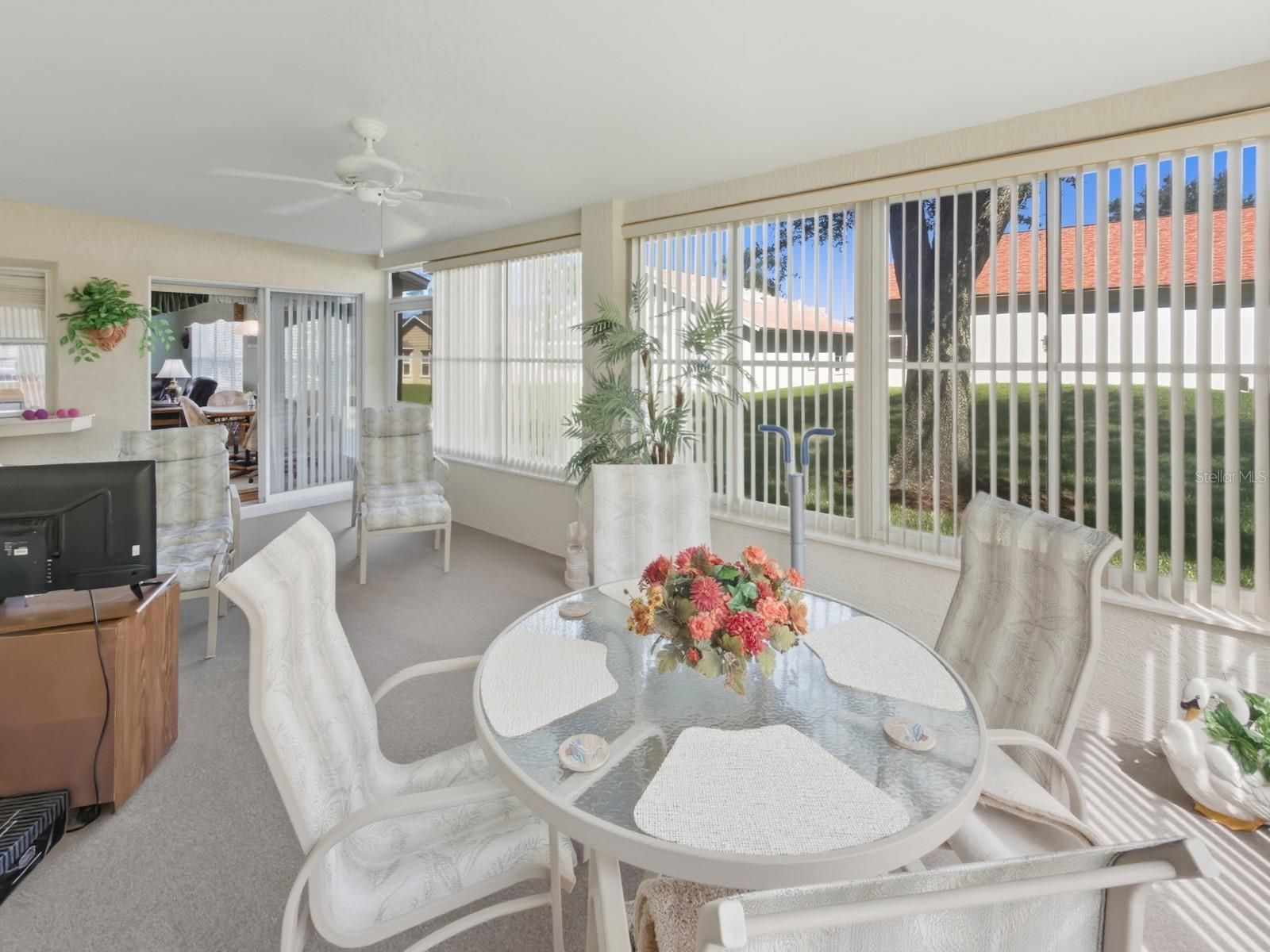 Welcome to Heritage Pines, a premier 55+ golf community. This meticulously maintained 2-bedroom, 2-bath home is offered by its original owners and can be purchased turn-key, with all furniture and contents included at no additional cost. The open living and dining room features high ceilings, while the kitchen sits at the heart of the home with a breakfast bar, closet pantry, cozy dinette, and newer refrigerator and dishwasher. Overlooking the family room, it’s an ideal layout for entertaining. The desirable split-bedroom floor plan provides privacy, with a primary suite offering dual walk-in closets and an en suite bath with walk-in shower. The guest bedroom and full bath are conveniently located on the opposite side of the home. Additional features include an indoor laundry room with built-in cabinetry, washer and dryer, and an extra fridge with freezer. A highlight of this property is the enclosed sunroom, accessible from multiple rooms and now fully integrated into the home’s living space with extended HVAC—bringing the total to 2,125 sq. ft. of heated and cooled comfort. Major updates include a brand-new roof, 2018 water heater, and 2011 Trane AC. Heritage Pines residents enjoy an active, resort-style lifestyle with an 18-hole championship golf course, clubhouse with restaurant and bar, heated pool and spa, fitness center, tennis, pickleball, bocce, and more. HOA fees cover cable, internet, lawn care, and irrigation for a truly low-maintenance lifestyle. Schedule your private tour today and see why this home is the perfect fit!