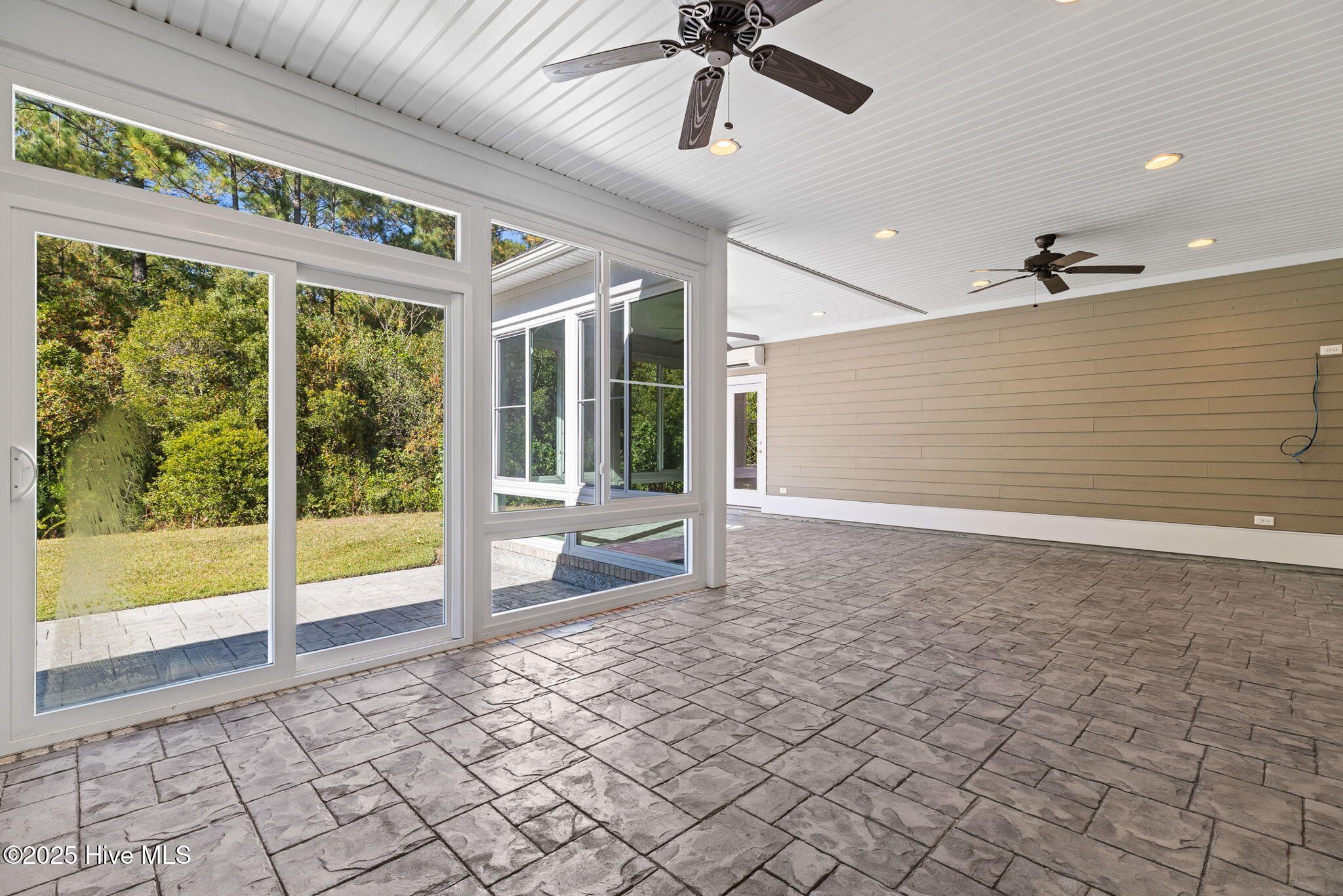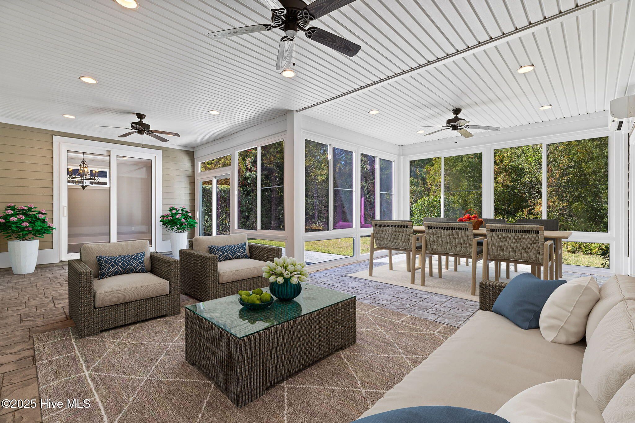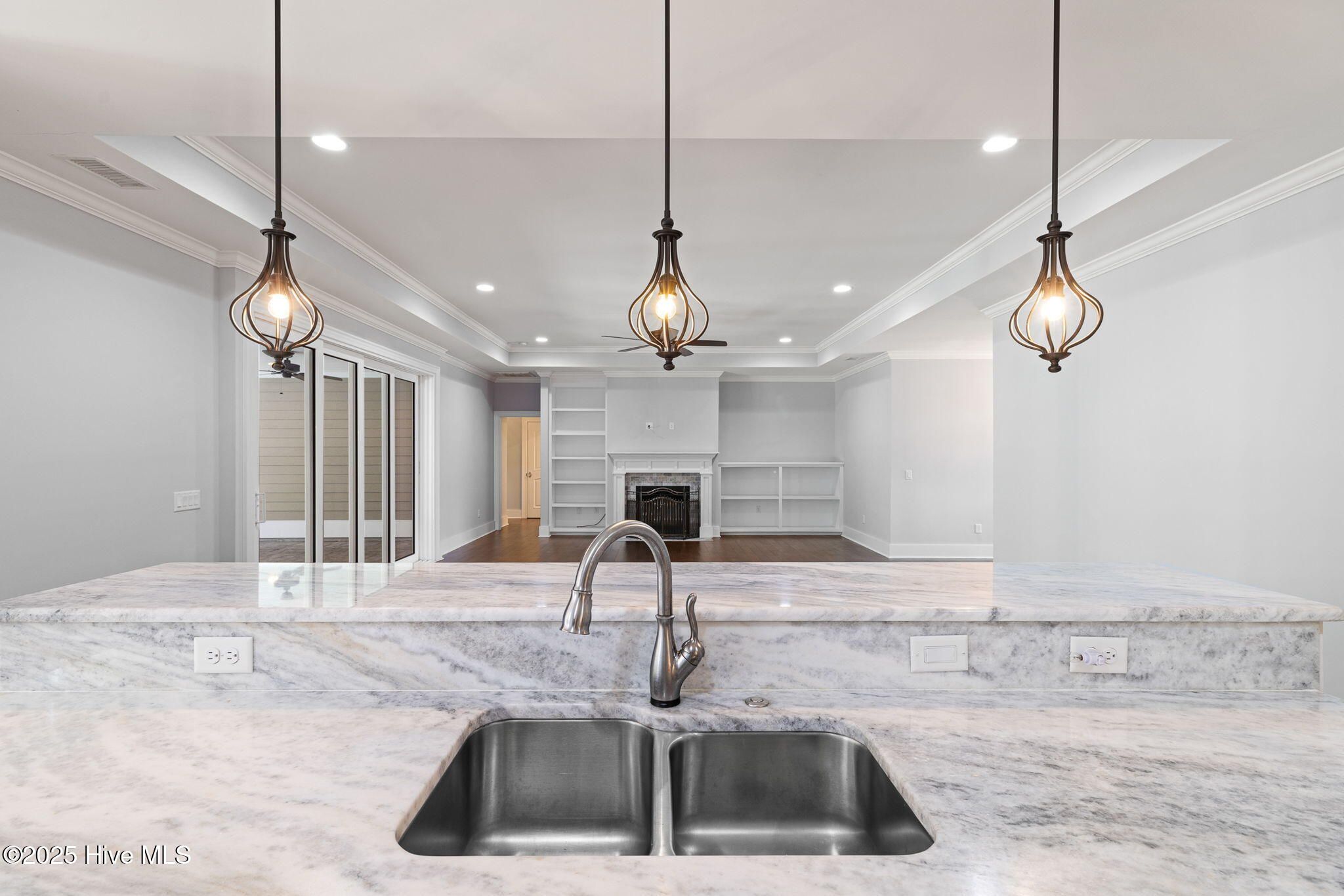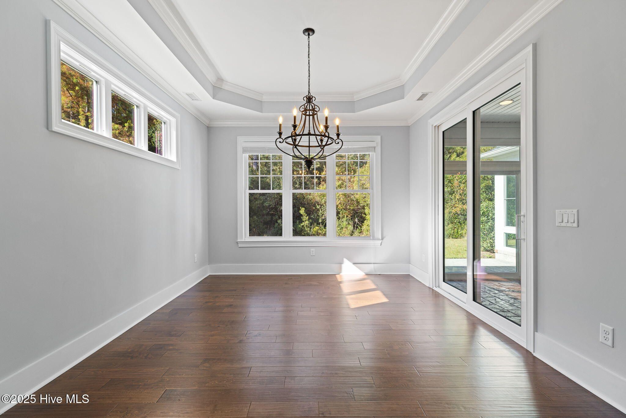 Discover exceptional privacy and coastal-casual elegance in this 3 bedroom, 2 bathroom, 2,892 sq ft home located in the desirable Evangeline neighborhood of Brunswick Forest. Tucked at the end of a quiet cul-de-sac and backing up to serene natural surroundings, this home offers the perfect blend of tranquility and convenience. A welcoming large covered front porch sets the tone for the warm, light-filled interior, enhanced by rich wood floors and an open layout. The living room features beautiful built-ins surrounding a cozy fireplace, creating an inviting centerpiece for gatherings. The gorgeous kitchen will delight any cook with its stainless steel appliances and a striking two-tiered island with generous seating. A stylish dining room with tray ceiling provides an elegant space for entertaining. Retreat to the spacious primary suite, complete with two walk-in closets and a spa-like ensuite featuring double sinks and a walk-in shower. Two additional bedrooms offer comfort and flexibility for guests, family, or hobbies. Enjoy year-round relaxation in the expansive sunroom, the ideal spot for entertaining or soaking in the coastal lifestyle. Step outside to the stone patio, which extends your living space and overlooks the peaceful natural backdrop. With its premier location, thoughtful design, and abundant privacy, this Evangeline gem is the perfect place to call home.