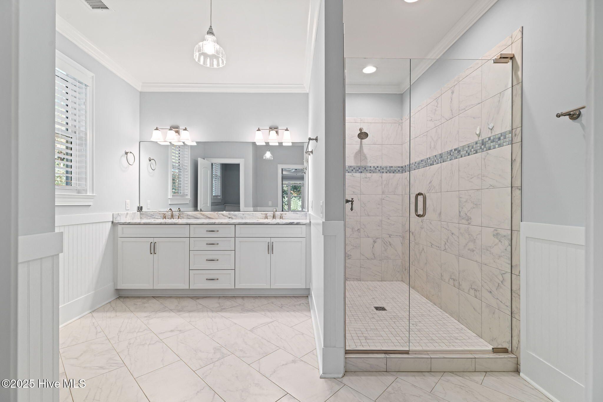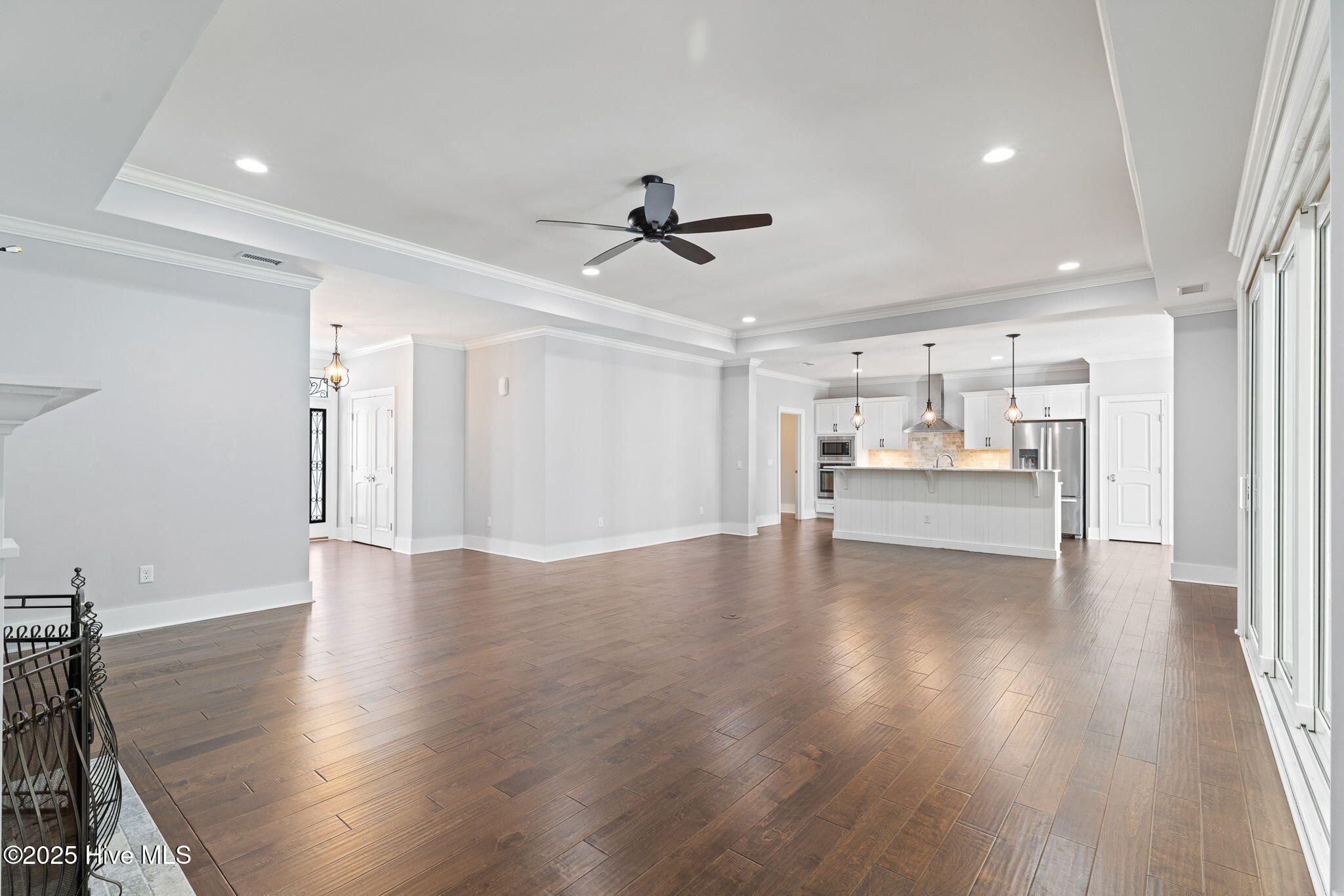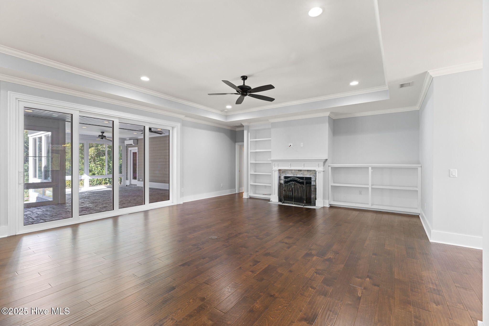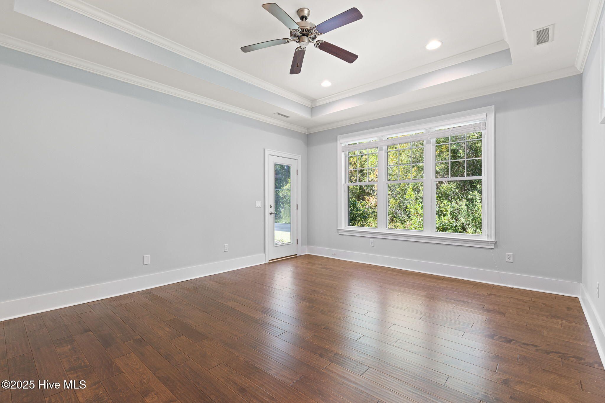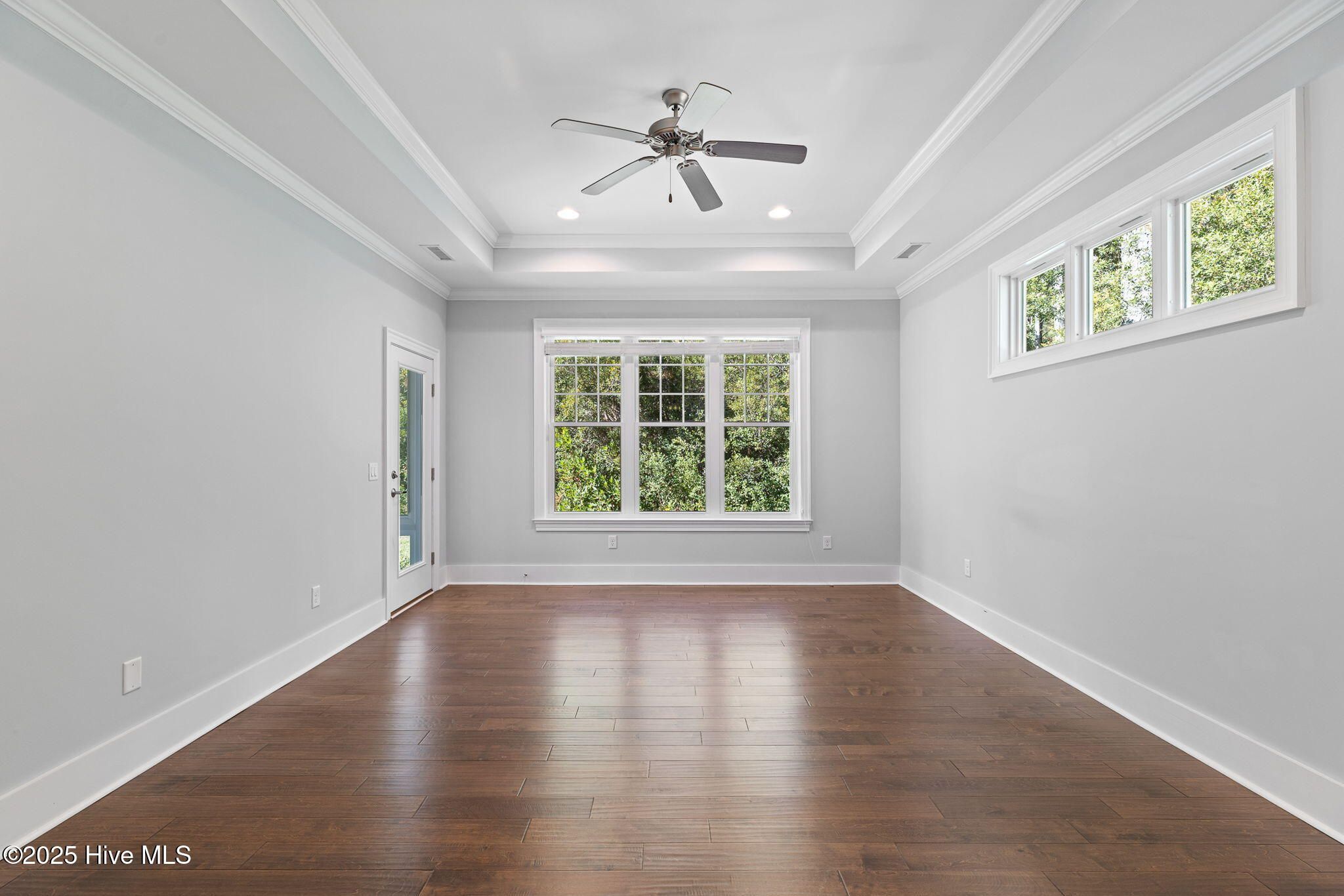 - Master Downstairs, Walk-in Closet(s), Tray Ceiling(s), Solid Surface, Bookcases, Kitchen Island, Ceiling Fan(s), Walk-in Shower