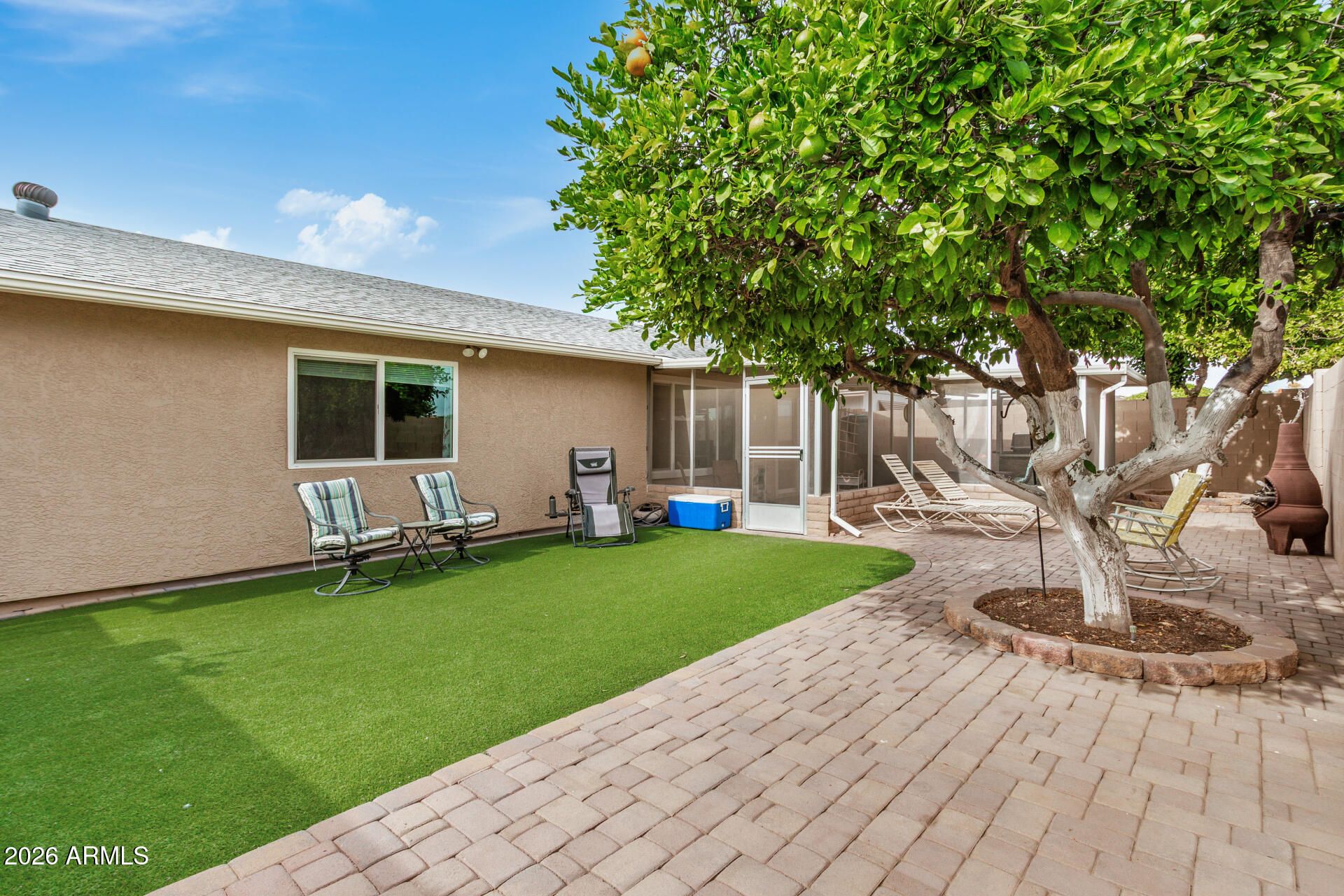 The home in Fountain of the Sun you've been waiting for! 3 BR, 2BTH, 2 car garage, huge kitchen and laundry room w/ new W/D. Updated kitchen with stainless steel appliances including wine fridge and both bathrooms nicely updated. New doors, all new windows, luxury vinyl flooring, fresh paint inside and out, garage storage cabinets. Water softener, all new fixtures throughout. Maricopa floor plan. Large open front courtyard and covered and screened back patio with new awning. Sliding doors in dining room open to your peaceful back yard with a 6 ft block fence for privacy and a safe space for your pet. New turf and paver back yard. A delicious tangelo and navel orange tree with irrigation. Quiet cul-de-sac street. Enjoy all of the FOS amenities, golf, dining, pickleball, activities