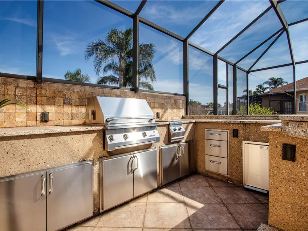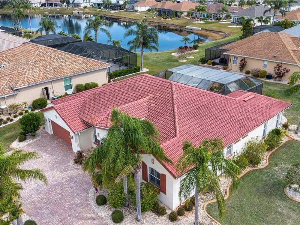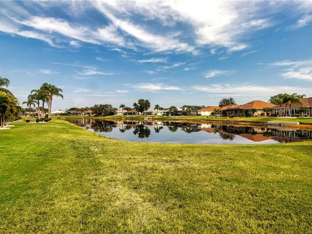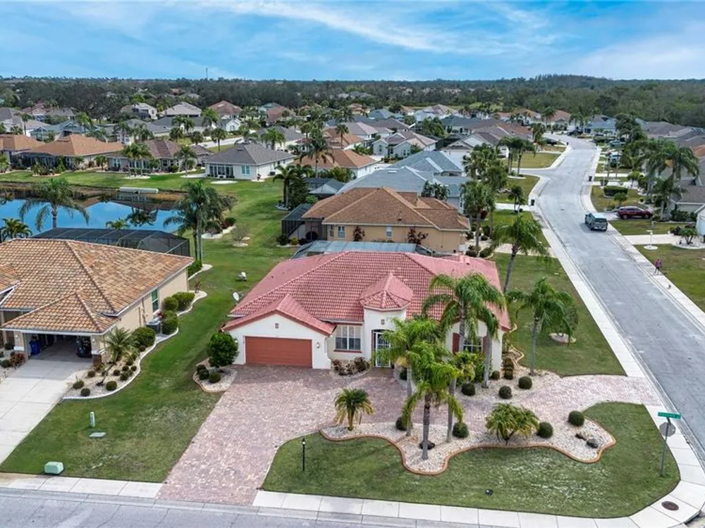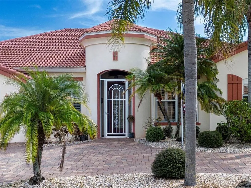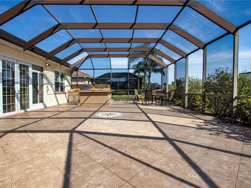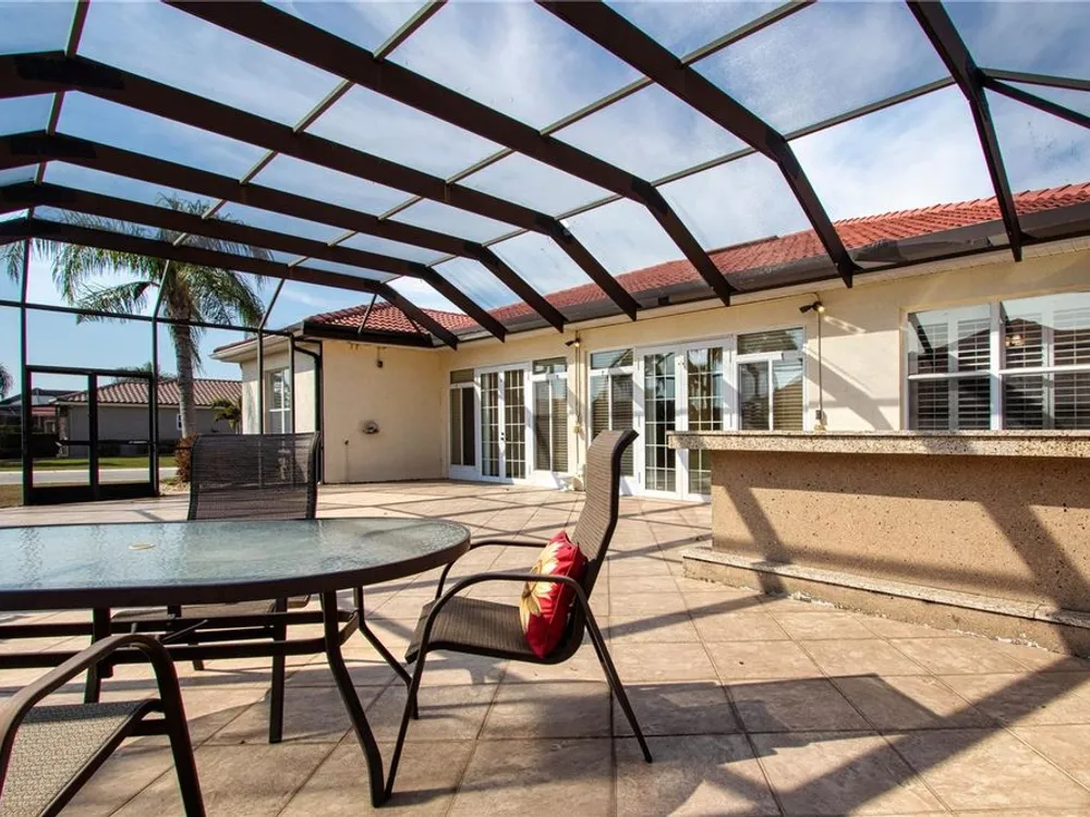 One or more photo(s) has been virtually staged. Discover the Florida lifestyle in this 2,500 sq. ft. home with 3 bedrooms, 3 bathrooms, a 2-car garage, and a 43x27 screened lanai with an outdoor kitchen, all on over a quarter-acre corner lot with a water view. Located in a 55-plus community, this property offers great value in Sun City Center. This Mediterranean-style home features mature landscaping, a circular paver driveway, tile roof, and hurricane-rated windows. Inside, you'll find a formal dining room, wet bar, tray ceilings, Tiffany lighting, and plantation shutters throughout. The open floor plan includes a split bedroom layout and a chef's kitchen with stainless steel appliances, granite countertops, tile back splash with a granite island that has a built in sink and breakfast bar and ample cabinet space. The enclosed Florida room overlooks the large screened lanai, that’s has a outdoor kitchen and bar perfect for entertaining. The master bedroom has tray ceilings, plantation shutters, dual walk-in closets, dual stone vanities, a soaking tub, and a separate shower and water closet. The second bedroom also has plantation shutters is near a full guest bathroom, and the third bedroom includes custom shelving and a desk, suitable for an office or craft room ans also complete with plantation shutters, with another full bathroom nearby. The laundry room features custom cabinets, shelving, and a utility sink. The home also has an irrigation and water softener system. The HOA is reasonable, and the community offers a pool, recreation facility, and restaurant with numerous social clubs to get plugged into. Close to shopping,Hosptals and VA clinic, Easy cummute from I-75 and I-275 to Gulf Beaches and even Orlando and Disney World. Don't miss this opportunity to retire in style. Call for a private showing today!