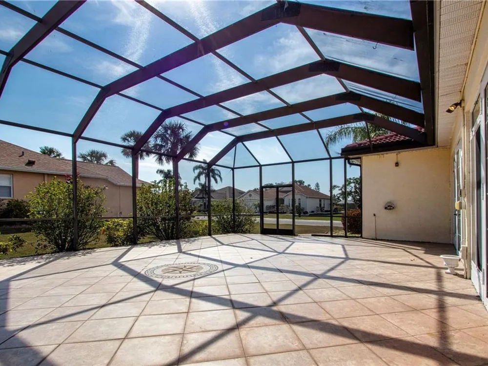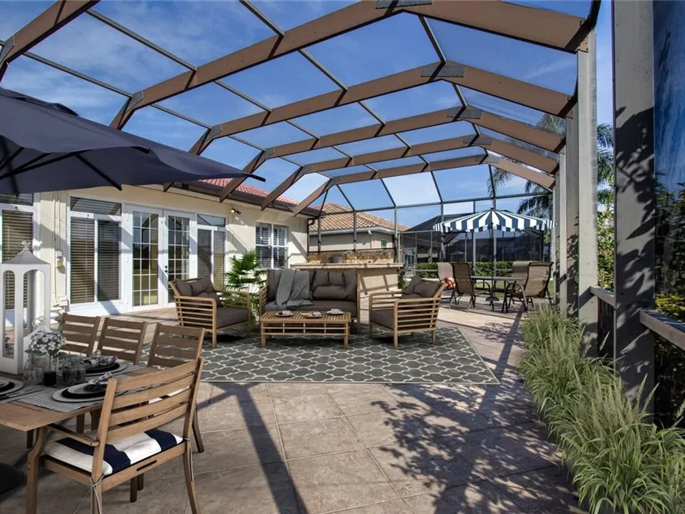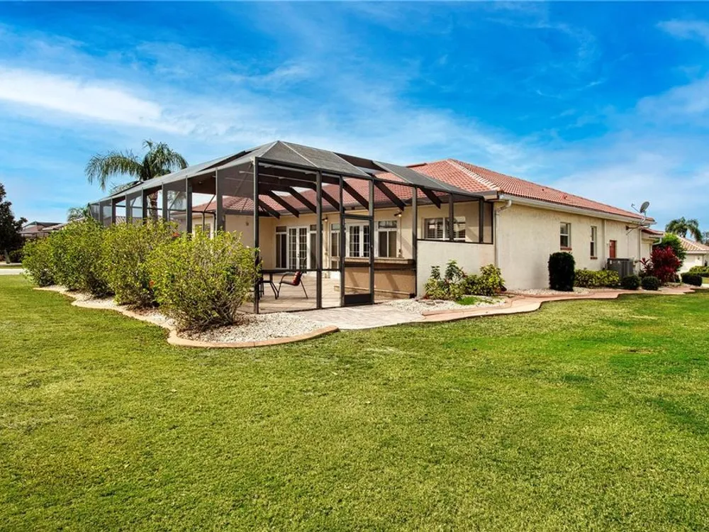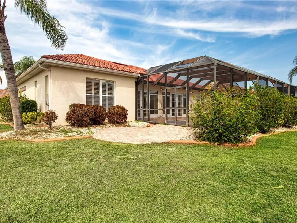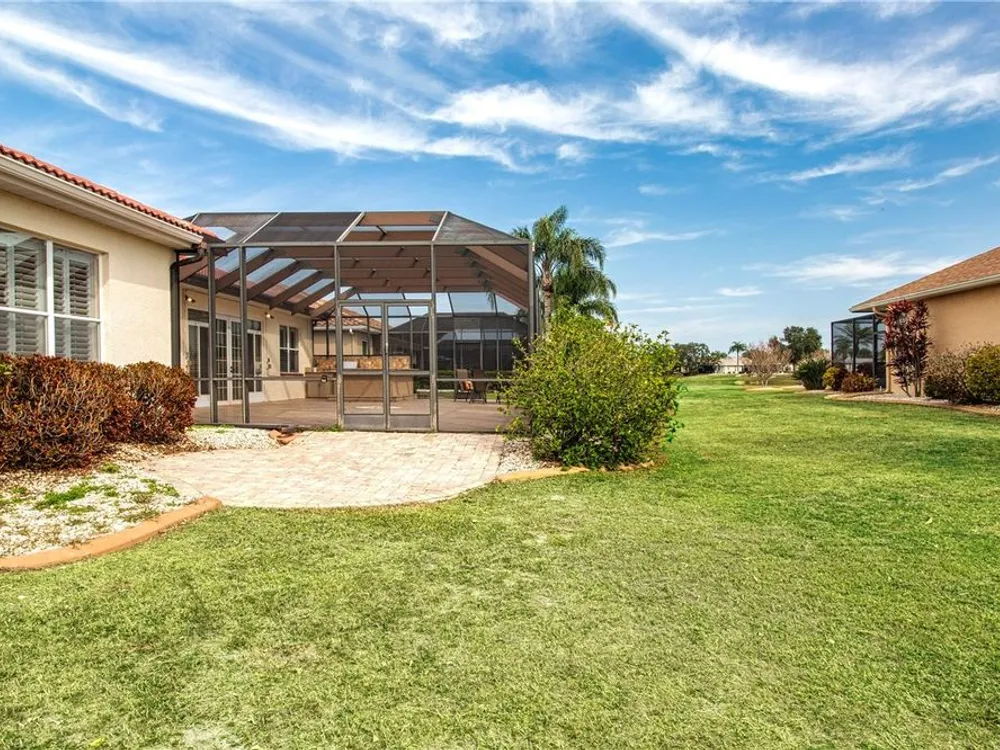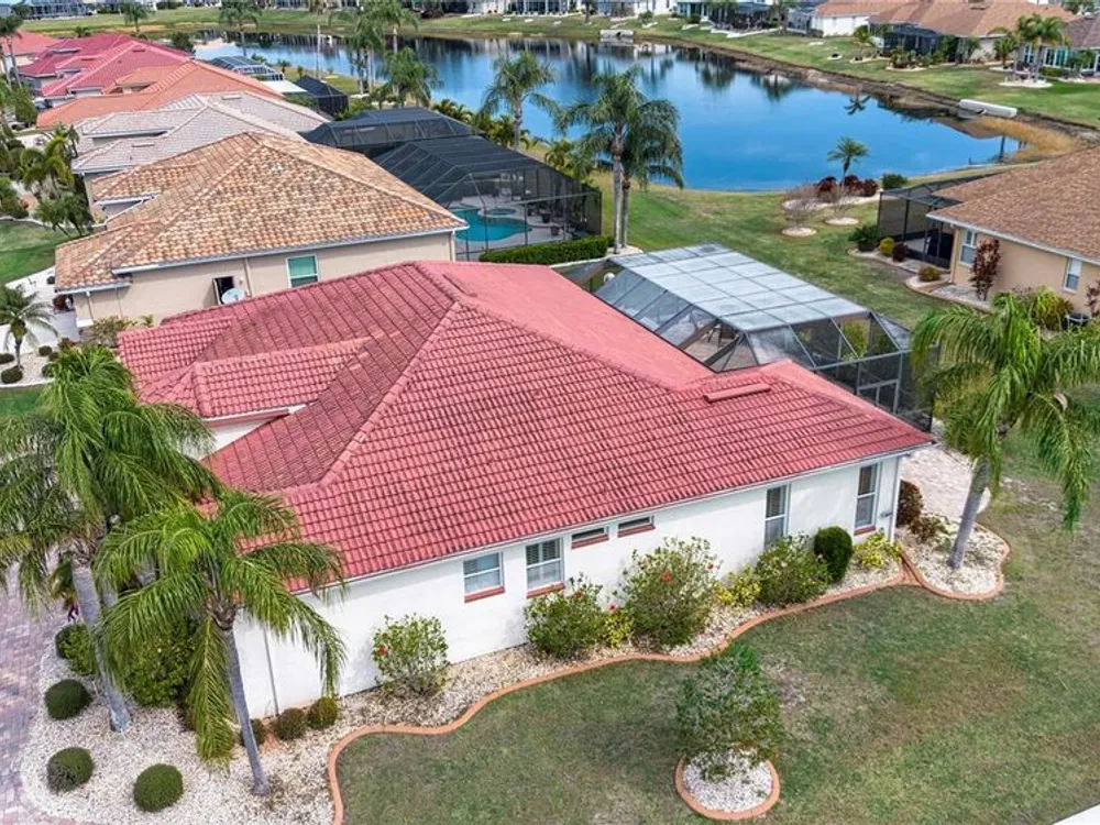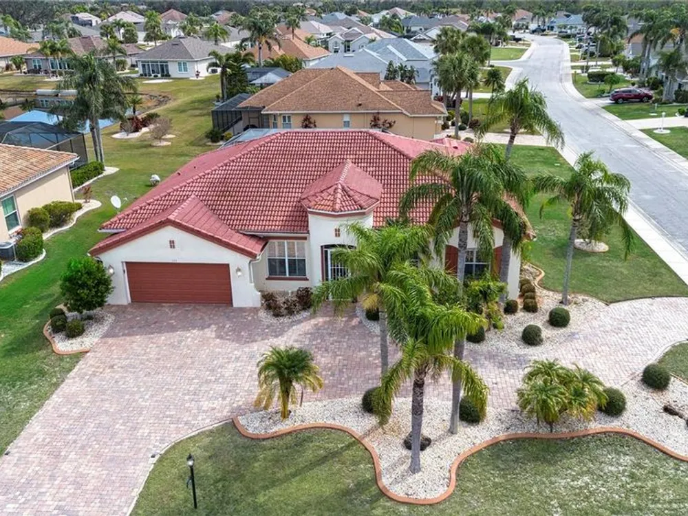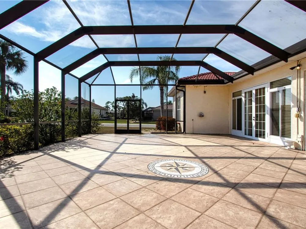 One or more photo(s) has been virtually staged. Discover the Florida lifestyle in this 2,500 sq. ft. home with 3 bedrooms, 3 bathrooms, a 2-car garage, and a 43x27 screened lanai with an outdoor kitchen, all on over a quarter-acre corner lot with a water view. Located in a 55-plus community, this property offers great value in Sun City Center. This Mediterranean-style home features mature landscaping, a circular paver driveway, tile roof, and hurricane-rated windows. Inside, you'll find a formal dining room, wet bar, tray ceilings, Tiffany lighting, and plantation shutters throughout. The open floor plan includes a split bedroom layout and a chef's kitchen with stainless steel appliances, granite countertops, tile back splash with a granite island that has a built in sink and breakfast bar and ample cabinet space. The enclosed Florida room overlooks the large screened lanai, that’s has a outdoor kitchen and bar perfect for entertaining. The master bedroom has tray ceilings, plantation shutters, dual walk-in closets, dual stone vanities, a soaking tub, and a separate shower and water closet. The second bedroom also has plantation shutters is near a full guest bathroom, and the third bedroom includes custom shelving and a desk, suitable for an office or craft room ans also complete with plantation shutters, with another full bathroom nearby. The laundry room features custom cabinets, shelving, and a utility sink. The home also has an irrigation and water softener system. The HOA is reasonable, and the community offers a pool, recreation facility, and restaurant with numerous social clubs to get plugged into. Close to shopping,Hosptals and VA clinic, Easy cummute from I-75 and I-275 to Gulf Beaches and even Orlando and Disney World. Don't miss this opportunity to retire in style. Call for a private showing today!