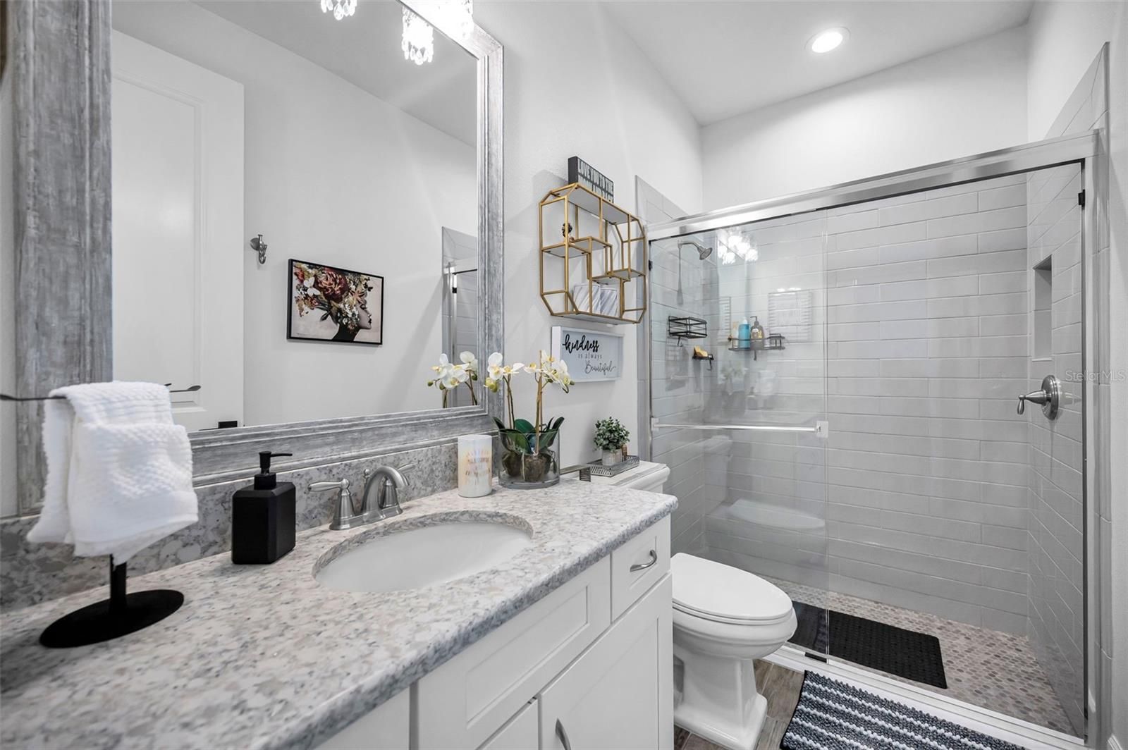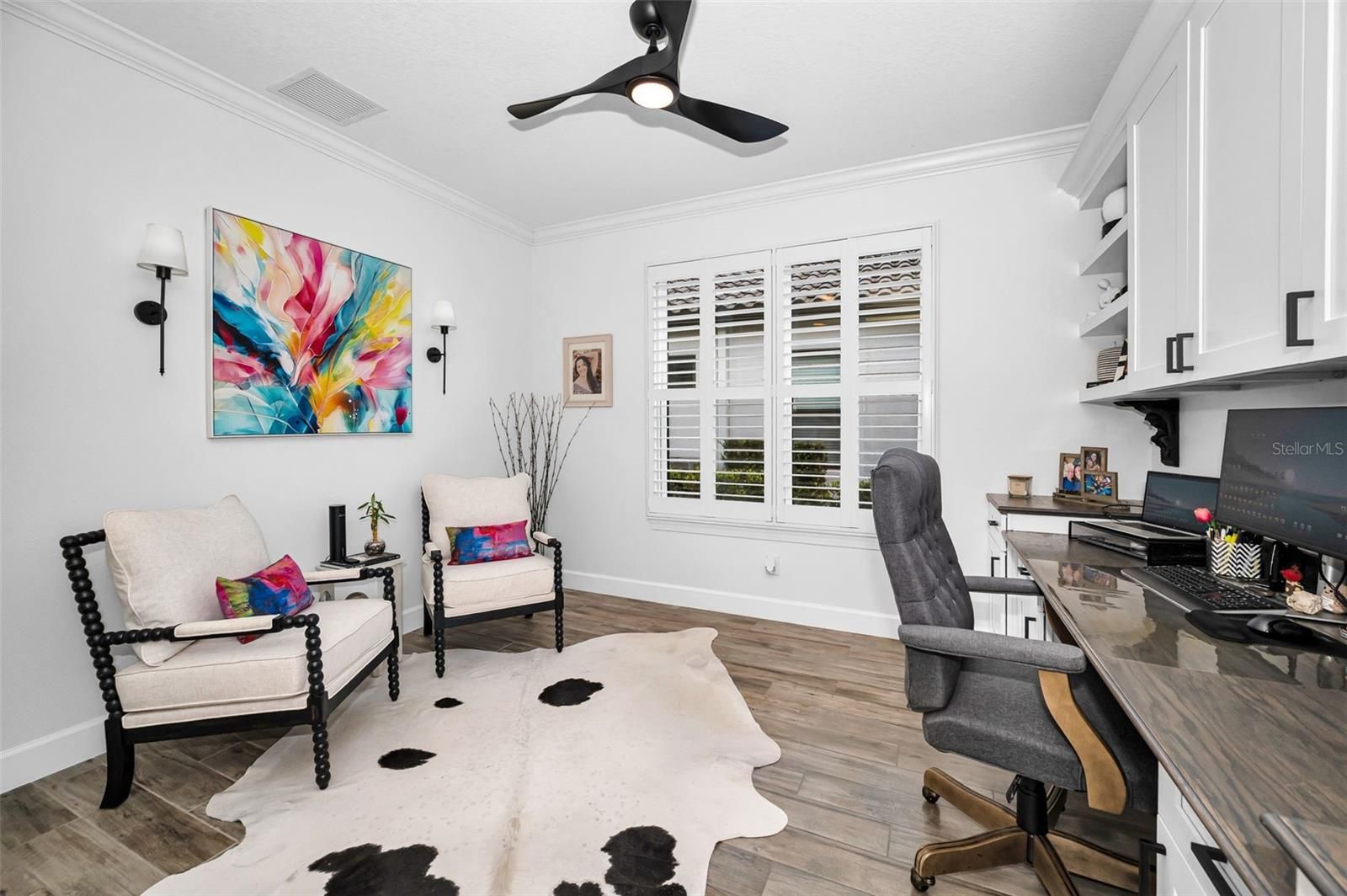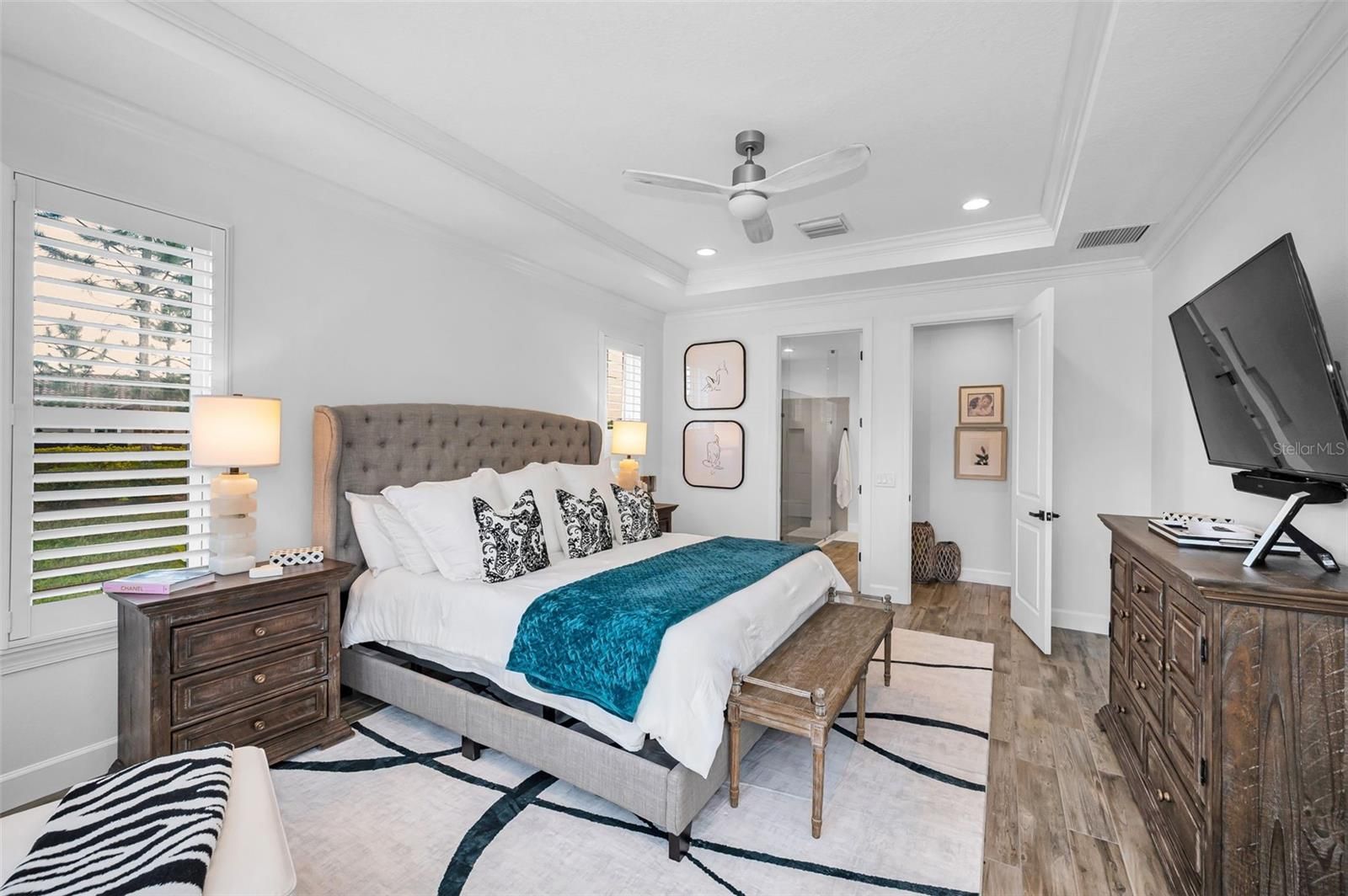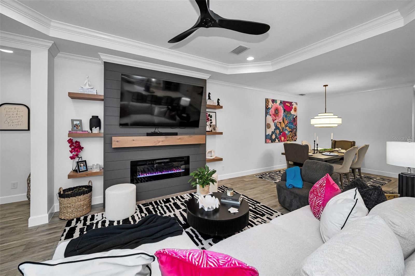 This stunning 3-bedroom, 3-bathroom residence is located within the prestigious gated community of Starkey Ranch-Esplanade and is thoughtfully positioned on an oversized, private corner lot. The home showcases wood-look tile flooring throughout, complemented by elegant tray ceilings, crown molding, and plantation shutters adorning the windows. Custom lighting and ceiling fan fixtures enhance the refined aesthetic found throughout the interior. A separate office, complete with built-in custom shelving, provides a functional and sophisticated workspace. The main living area is anchored by a custom fireplace featuring a shiplap surround and floating mantle and shelves, creating a tasteful focal point. The primary suite offers a tranquil retreat, highlighted by a bay window, an expansive walk-in shower, and a custom-designed closet system. The second bedroom includes an ensuite bathroom and custom closet shelving, while the third bedroom is enhanced by another bay window. Outdoor living is equally well-appointed, with a screened-in patio that has been pre-plumbed for an outdoor kitchen, offering excellent potential for entertaining. This residence exemplifies quality craftsmanship, thoughtful design, and comfortable elegance within a highly desirable community. Esplanade offers light maintenance living which includes individual lawn maintenance, irrigation and trash. Residents can enjoy the private resort style amenities, concierge services, fitness center and classes, an activites director, pool, pickleball. You can also enjoy the adjoining Starkey Ranch Community with pools, splash pad, playgrounds, dog parks, sports fields, a K-8 school and library. The community is close to shopping, restaurants hospitals and medical facilities.