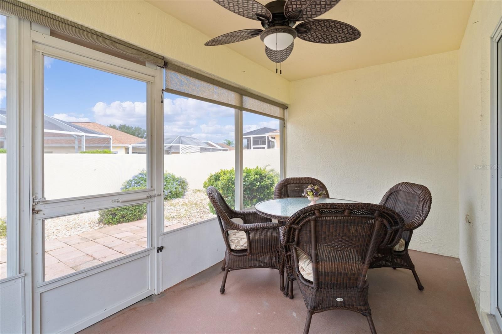 ~NO BOND~ ~ROOF/HVAC 2018~ ~NO CARPET~ ~GRANITE COUNTERTOPS~ ~FURNITURE PACKAGE AVAILABLE SEPARATELY~ This 2/2 BAJA COURTYARD VILLA home is situated in the convenient Village of SANTIAGO, specifically in VILLA SAN LEANDRO. As you approach, the home welcomes you with beautiful rocks and shrubs, setting the tone for its appealing exterior. Step inside through the TILE foyer, and you'll find a spacious living/dining room combo, perfect for entertaining guests. LAMINATE flooring and UPGRADED LIGHTING enhance the beauty of the main living area. The galley kitchen features a TILE floor, GRANITE countertops, STAINLESS-STEEL appliances, and a CLOSET PANTRY creating a stylish and functional space. The primary bedroom features an ensuite bath UPDATED LIGHTING, MIRRORS and HARDWARE plus a convenient WALK-IN CLOSET. Your guests will enjoy privacy in the 2nd bedroom located right next to the guest bath which also features UPDATED LIGHTING, MIRRORS and HARDWARE. Both bedrooms have been updated with LAMINATE flooring. The home is designed for indoor-outdoor living, with a SCREENED-IN LANAI featuring a painted floor and a beautiful PAVER patio, surrounded by rocks and shrubs for a serene atmosphere. Additional features include a 1-1/2 car garage with a painted floor and ATTIC STAIRS for easy storage. The laundry is in the garage. The property is equipped with a WATER SOFTENER and the Hot Water Heater is 2006. The location is ideal, close to SPANISH SPRINGS, GLENVIEW COUNTRY CLUB, the SAVANNAH CENTER, and SOUTHERN TRACE offering a variety of choices in restaurants, entertainment, and medical facilities.