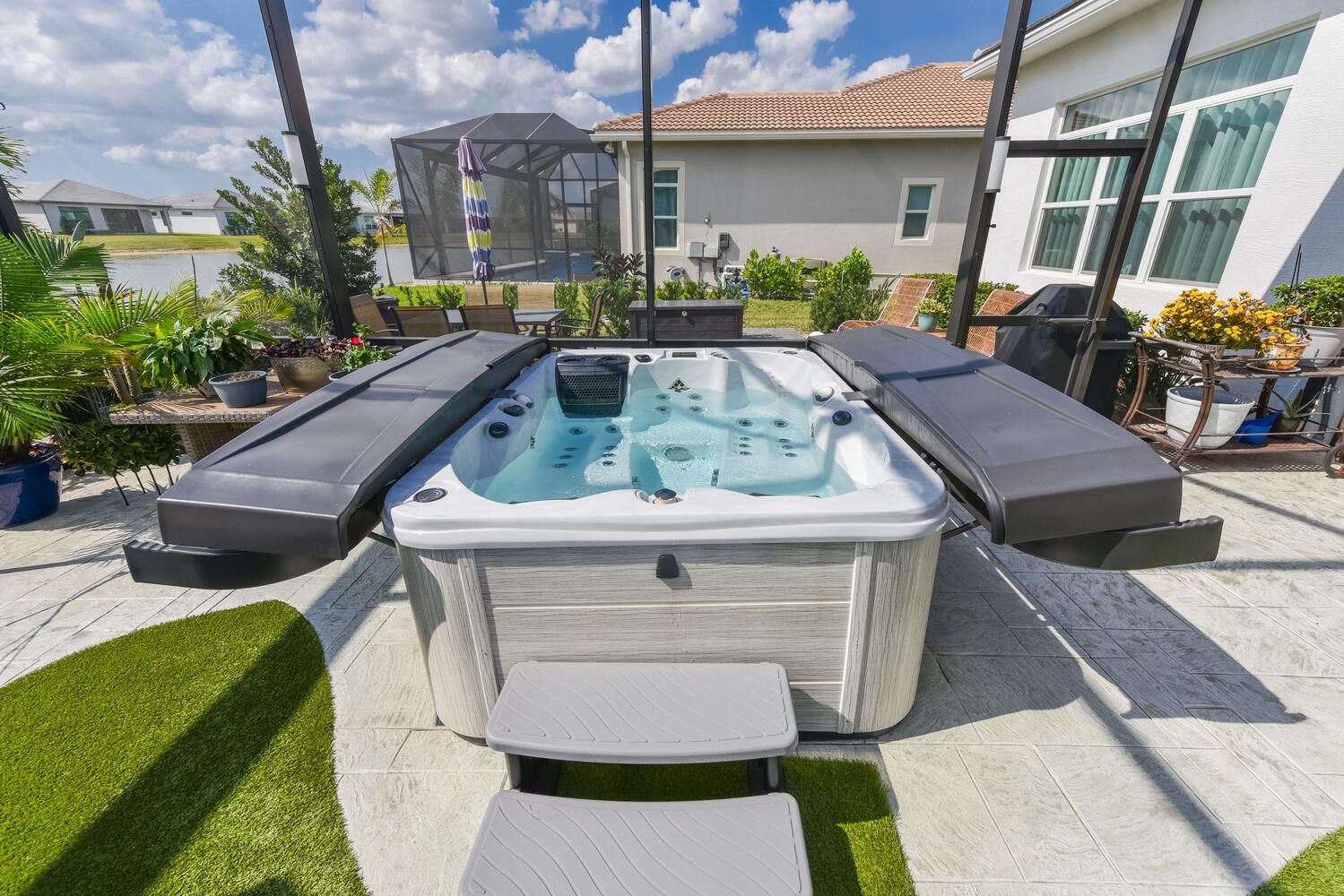 Must-see home - priced to sell and packed with WOW! This show-stopping residence offers $200K+ in luxury interior and exterior upgrades with designer finishes throughout. The desirable open floor plan features a bonus room/3rd bedroom, no carpet, & a stunning quartz kitchen with beautiful cabinetry for a sleek, modern feel. Step into your 1,466 sq. ft. outdoor oasis a beautifully screened lanai with peaceful lake views, designed for year-round living and unforgettable entertaining. This incredible space includes stamped concrete, electric shade, synthetic turf, an immaculately maintained hot tub, a summer kitchen, a Vegepod garden, 360 LED lighting, a TV mount, additional outlets, a lanai hose hookup, a hammock, with an umbrella. Lush landscaping, stone accents, & soaring Christmas Palms