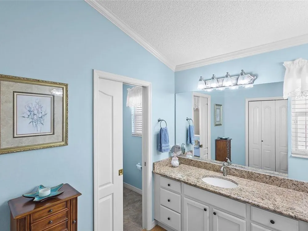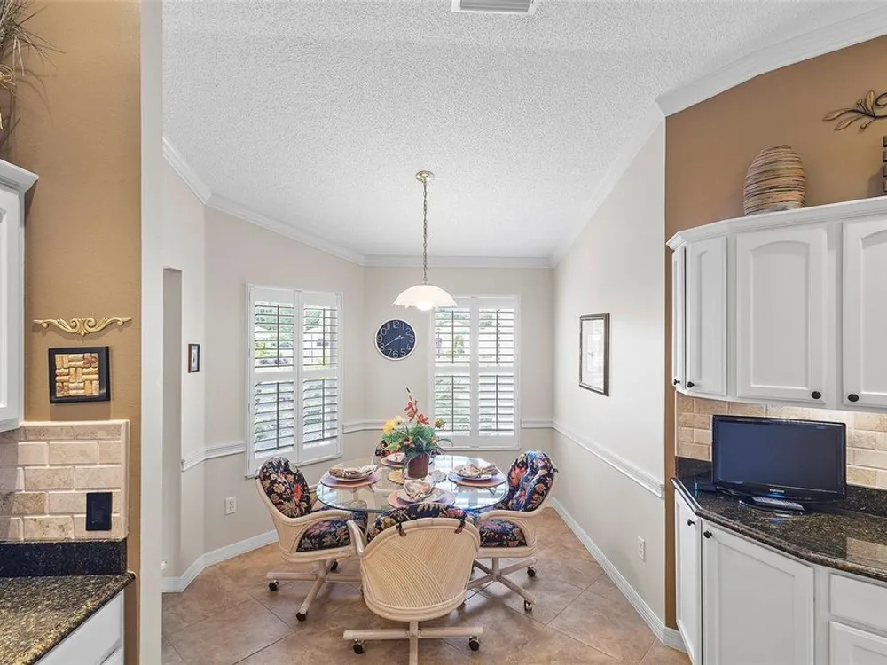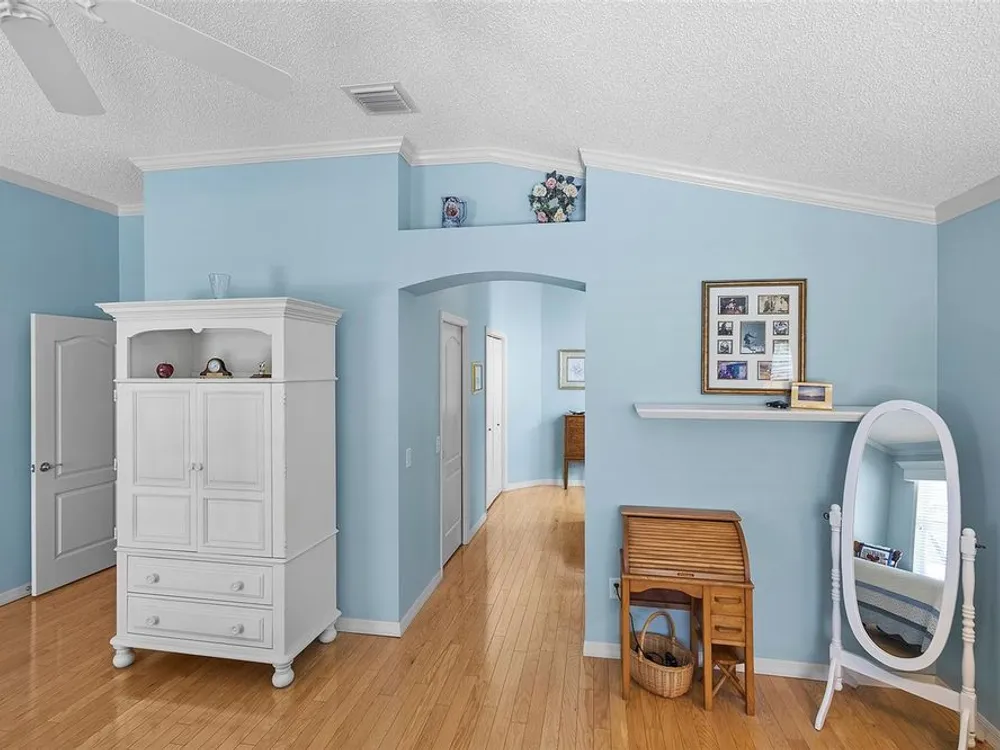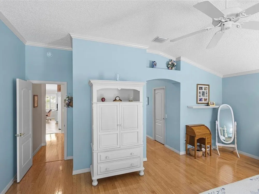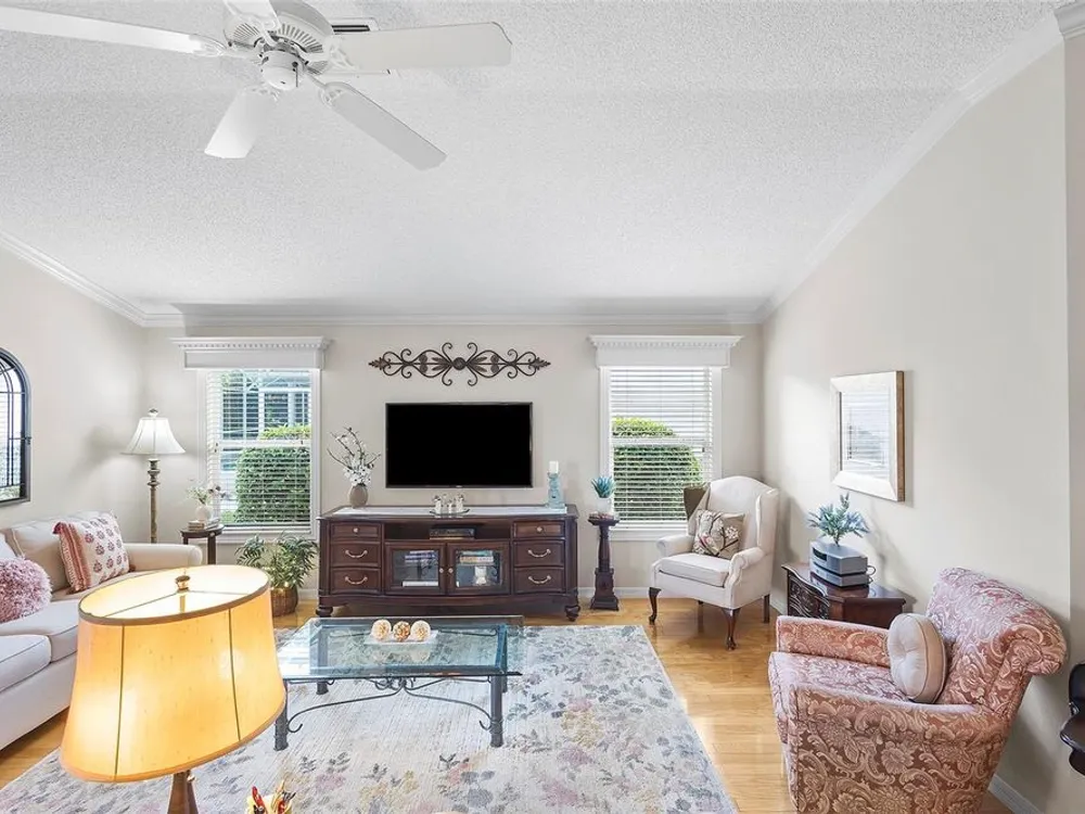 - Ceiling Fan(s), Crown Molding, Eat-in Kitchen, Living/Dining Room, Open Floorplan, Main Level Primary, Split Bedrooms, Stone Counters, Vaulted Ceiling(s), Walk-In Closet(s), Window Treatments