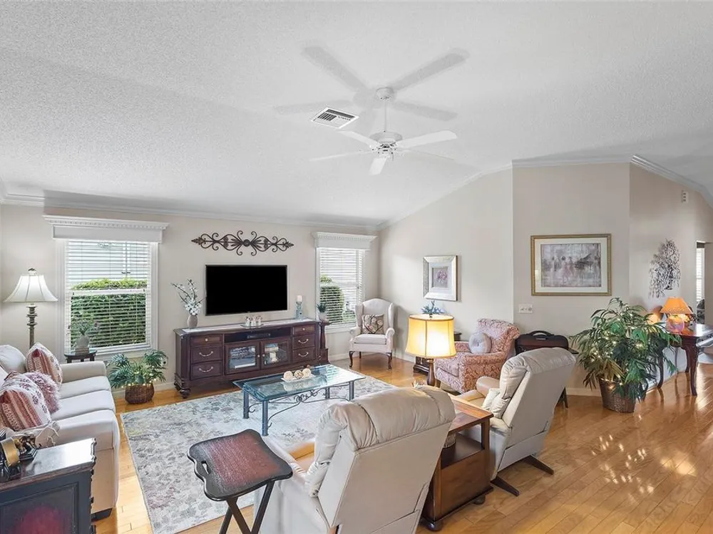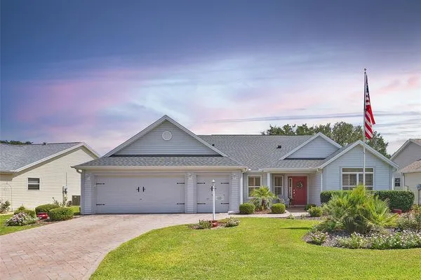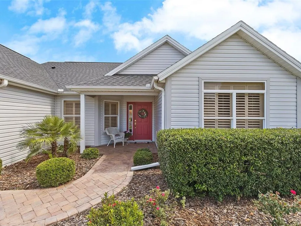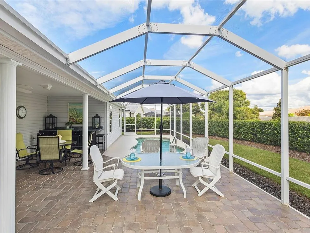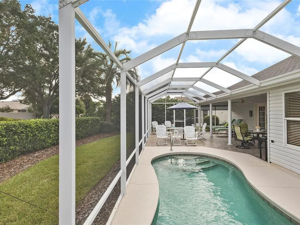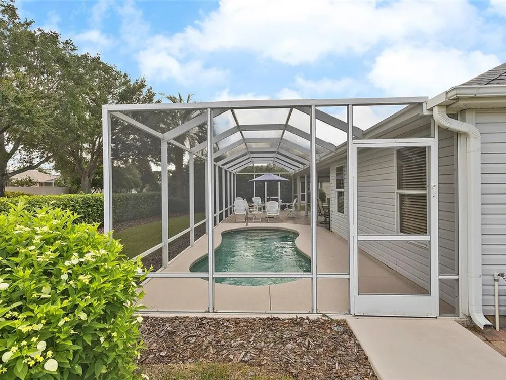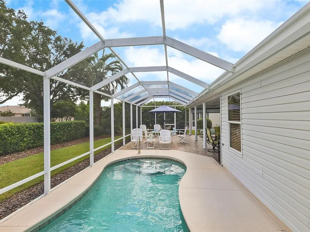 Welcome Home to this beautifully maintained Magnolia (Nueva Rosita) model nestled in the sought-after Village of Santo Domingo. From the moment you arrive, you'll be impressed by the exceptional curb appeal, featuring lush landscaping, concrete curbing, and meticulously manicured flower beds that frame the pavered driveway. NEW PRICE - BRING YOUR OFFER ! Step through the front door and into a home that blends timeless elegance with Florida living. Your eyes will immediately be drawn to the real hardwood flooring that flows seamlessly throughout the main living areas, complemented by crown molding and plantation shutters that elevate the space with sophistication and warmth. To your left, you'll find the spacious kitchen—perfectly appointed with granite countertops, ample cabinetry, and a breakfast nook filled with natural light. The granite continues in both bathrooms, offering a consistent, high-end feel throughout. The formal dining area and large living room create an inviting layout, ideal for hosting friends and family. The split-bedroom floor plan ensures privacy for guests, while the primary suite serves as a true retreat. It features his-and-hers closets, dual vanities, and direct access to the lanai. Both guest bedrooms are generously sized and versatile, ready to accommodate visitors or a home office. Step out back and you’ll feel like you’ve entered your own private resort. The inground pool is surrounded by privacy landscaping, creating a tranquil escape right in your backyard. Enjoy a cocktail at the covered bar area or relax under the expansive screened birdcage lanai, perfect for year-round outdoor living. Additional highlights include: * Roof replaced March 2025 * HVAC replaced September 2015 * Granite countertops in kitchen and both bathrooms * Golf cart garage * Double pull-down attic access * No Bond – balance is fully paid Located just minutes from Spanish Springs and Lake Sumter Landing, you'll enjoy quick access to golf, shopping, dining, and nightly entertainment—all while living in a peaceful, well-established neighborhood. This home offers the best of The Villages lifestyle with luxury, privacy, and unmatched charm. Schedule your private tour today! CHECK OUT THE VIDEO TOUR BY CLICKING ON THE VIDEO TOUR 1 ICON. ENJOY!