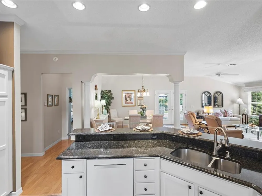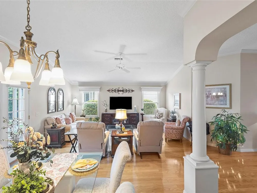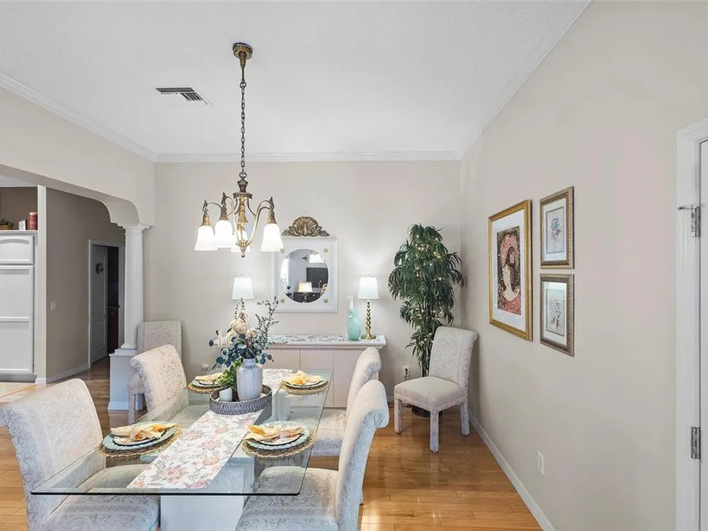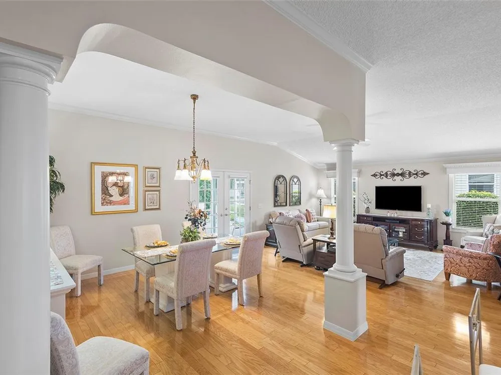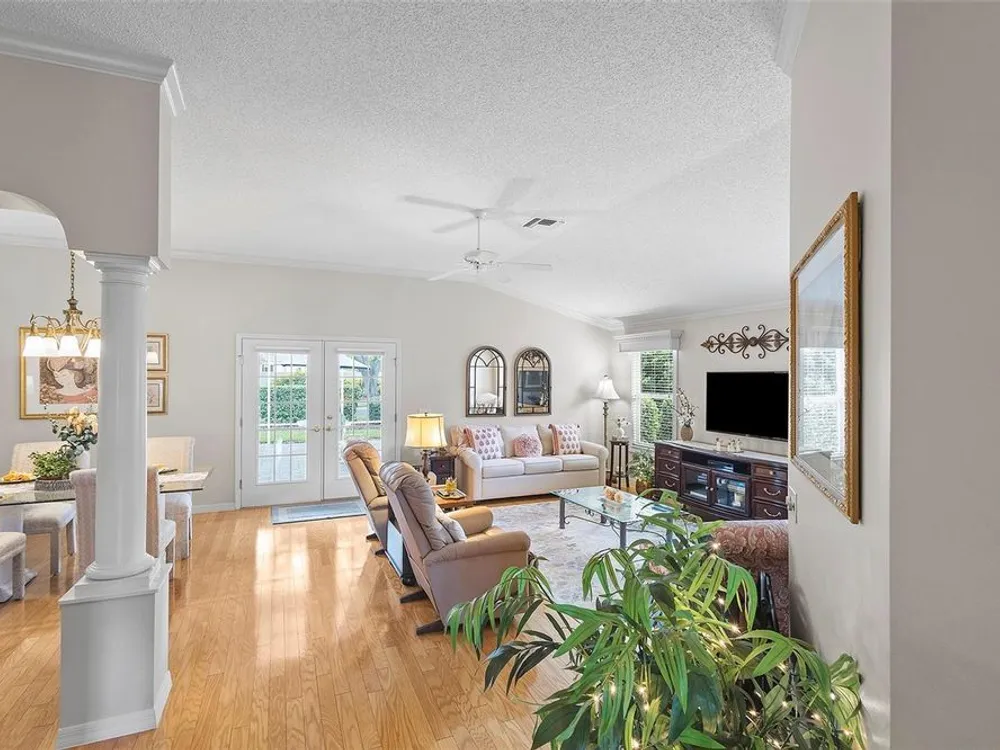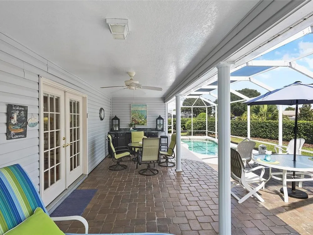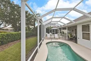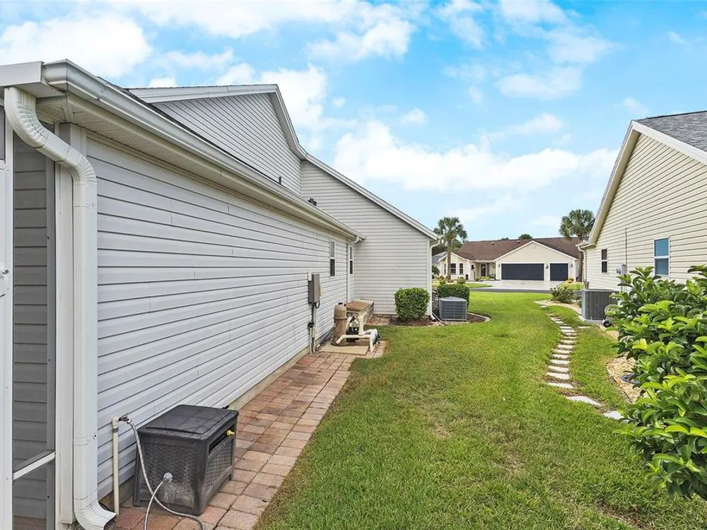 Welcome Home to this beautifully maintained Magnolia (Nueva Rosita) model nestled in the sought-after Village of Santo Domingo. From the moment you arrive, you'll be impressed by the exceptional curb appeal, featuring lush landscaping, concrete curbing, and meticulously manicured flower beds that frame the pavered driveway. NEW PRICE - BRING YOUR OFFER ! Step through the front door and into a home that blends timeless elegance with Florida living. Your eyes will immediately be drawn to the real hardwood flooring that flows seamlessly throughout the main living areas, complemented by crown molding and plantation shutters that elevate the space with sophistication and warmth. To your left, you'll find the spacious kitchen—perfectly appointed with granite countertops, ample cabinetry, and a breakfast nook filled with natural light. The granite continues in both bathrooms, offering a consistent, high-end feel throughout. The formal dining area and large living room create an inviting layout, ideal for hosting friends and family. The split-bedroom floor plan ensures privacy for guests, while the primary suite serves as a true retreat. It features his-and-hers closets, dual vanities, and direct access to the lanai. Both guest bedrooms are generously sized and versatile, ready to accommodate visitors or a home office. Step out back and you’ll feel like you’ve entered your own private resort. The inground pool is surrounded by privacy landscaping, creating a tranquil escape right in your backyard. Enjoy a cocktail at the covered bar area or relax under the expansive screened birdcage lanai, perfect for year-round outdoor living. Additional highlights include: * Roof replaced March 2025 * HVAC replaced September 2015 * Granite countertops in kitchen and both bathrooms * Golf cart garage * Double pull-down attic access * No Bond – balance is fully paid Located just minutes from Spanish Springs and Lake Sumter Landing, you'll enjoy quick access to golf, shopping, dining, and nightly entertainment—all while living in a peaceful, well-established neighborhood. This home offers the best of The Villages lifestyle with luxury, privacy, and unmatched charm. Schedule your private tour today! CHECK OUT THE VIDEO TOUR BY CLICKING ON THE VIDEO TOUR 1 ICON. ENJOY!
