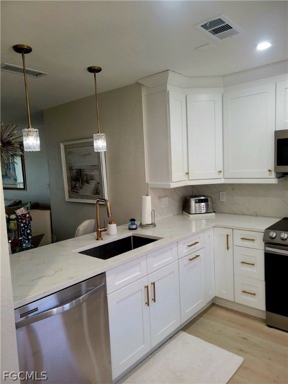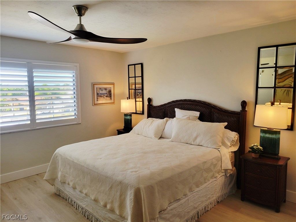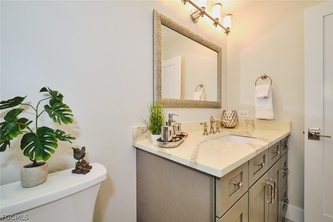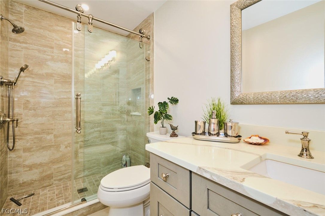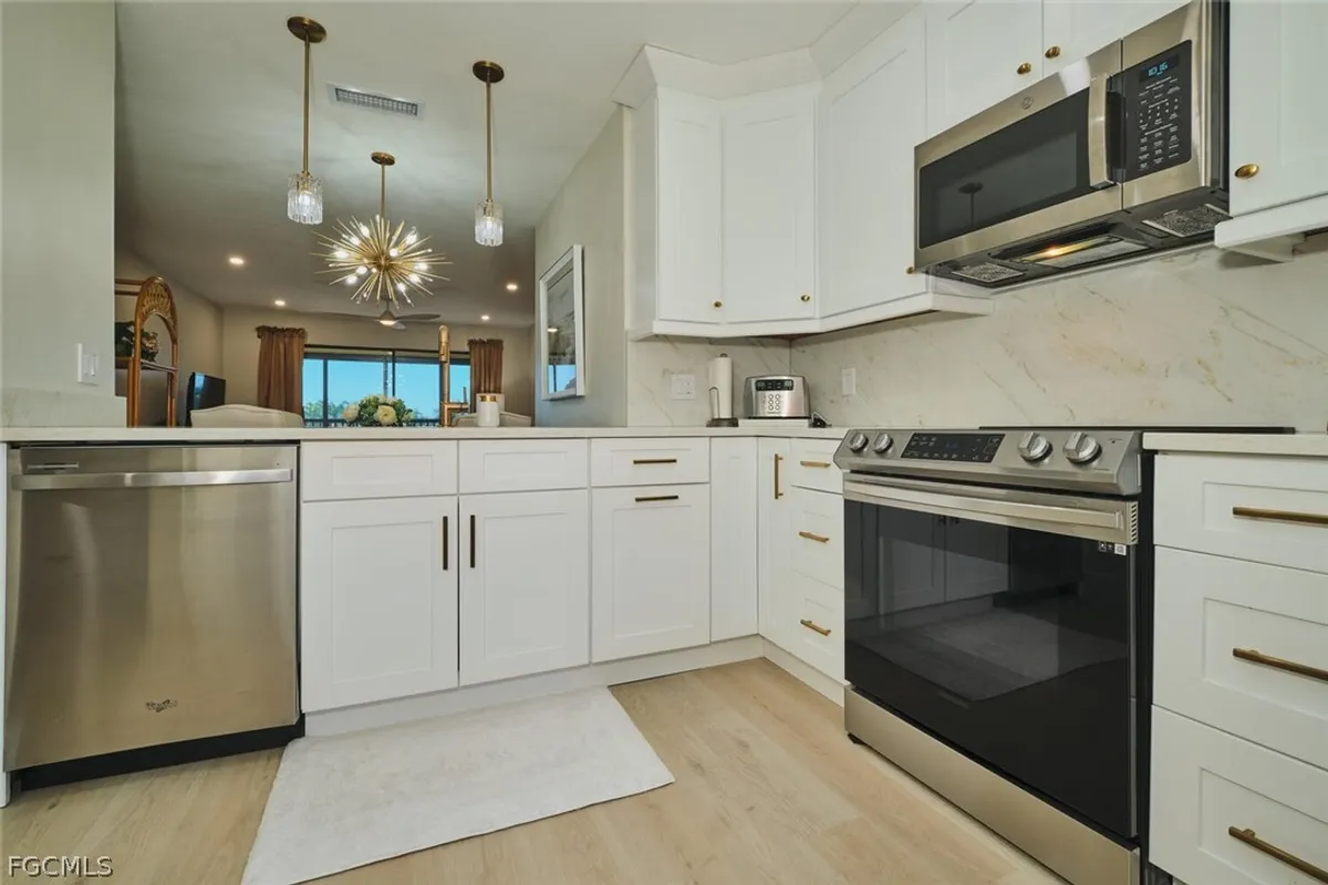 Stunning, Fully Renovated Condo with High-End Finishes Throughout. Experience luxury living in this completely updated condo featuring premium upgrades from top to bottom. The Gourmet kitchen boasts custom cabinetry, stylish quartz countertops and backsplash and Stainless steel appliances. Beautiful luxury vinyl flooring flows throughout the home, complemented by new baseboards and interior doors/frames. Both full bathrooms have been impeccably renovated with imported wall and floor tile, quartz countertops, Kohler Artifacts shower doors, polished nickel fixtures, upgraded lighting, new ventilation fans and modern toilets. Additional enhancements include 3 new remote controlled ceiling fans, recessed lighting in the living room, kitchen and guest bedroom. Premium Elfa closet systems in a sleek stainless steel finish. Enjoy the elegance of all-wood planation shutters and the convenience of a new storm/screen door. The fully enclosed lanai offers upgraded sliders with No-see-um screens and a newly installed railing system. Perfect for relaxing year-round. A newer A/C unit provides added comfort and efficiency. This move in ready home combines style, quality and thoughtful upgrades in every detail.