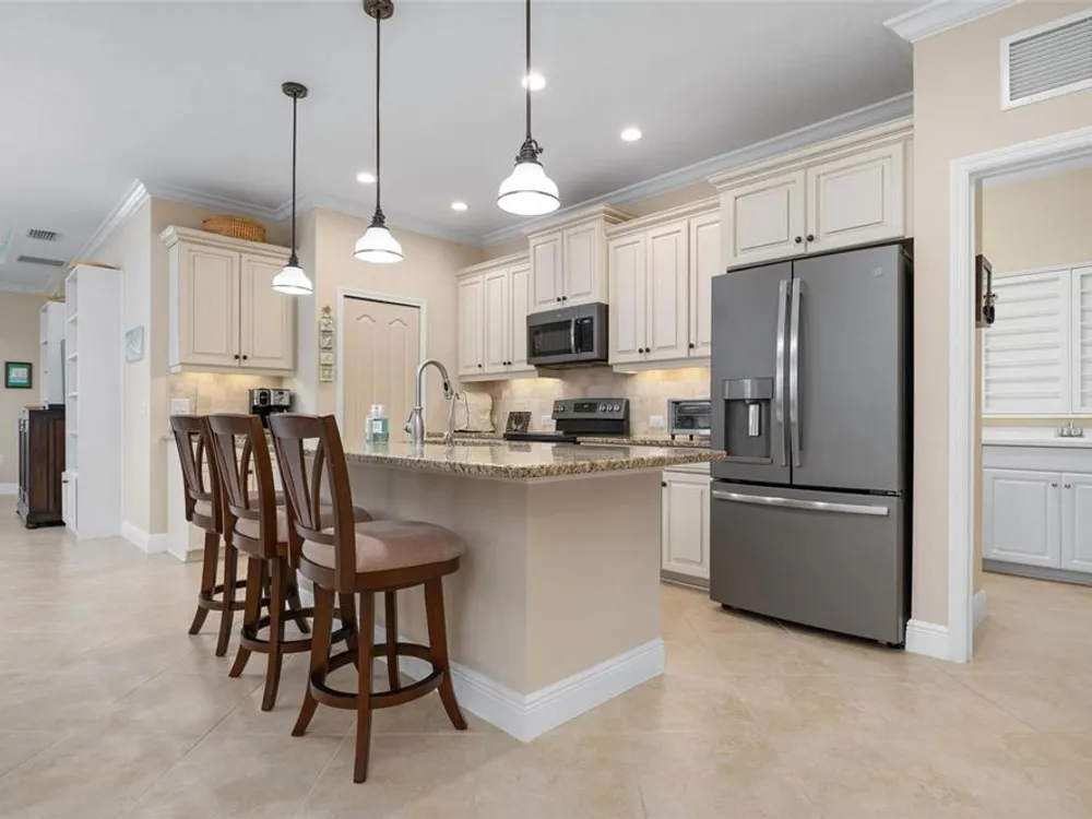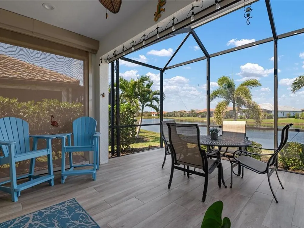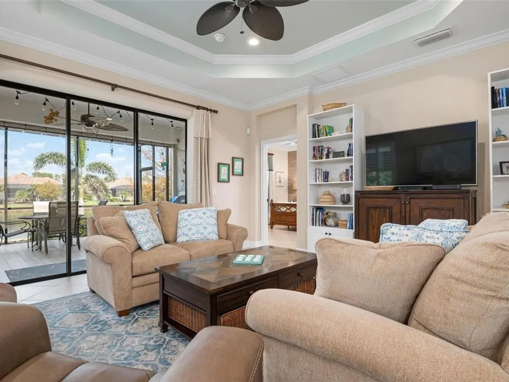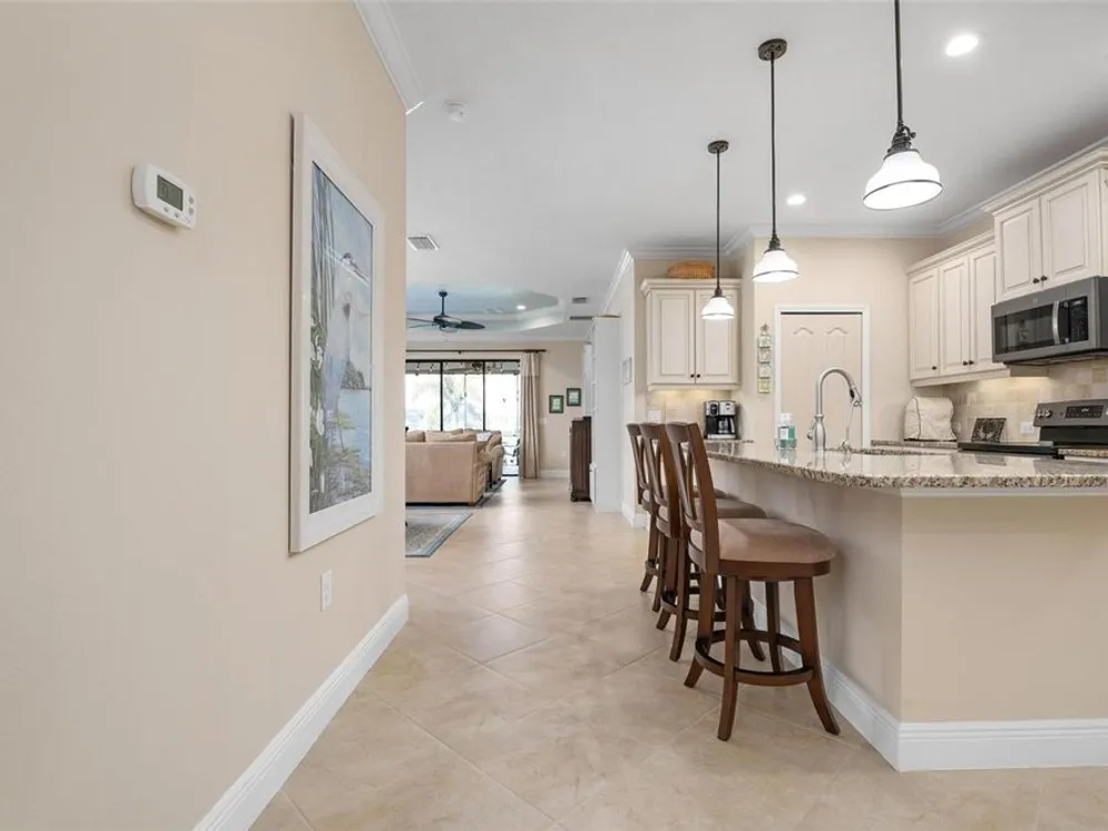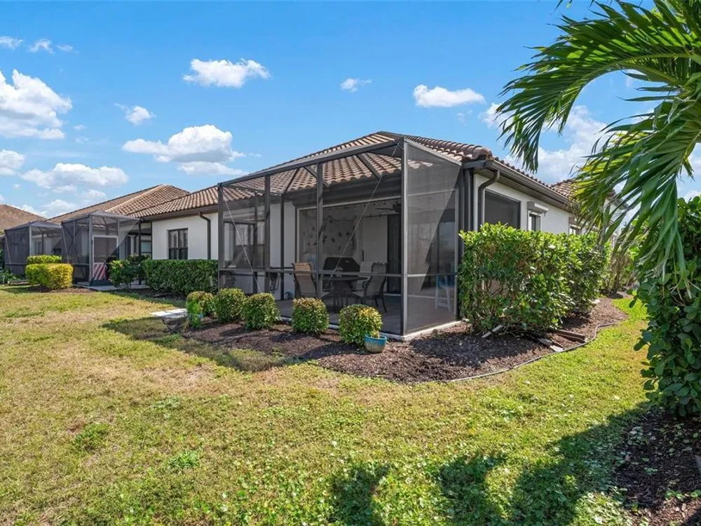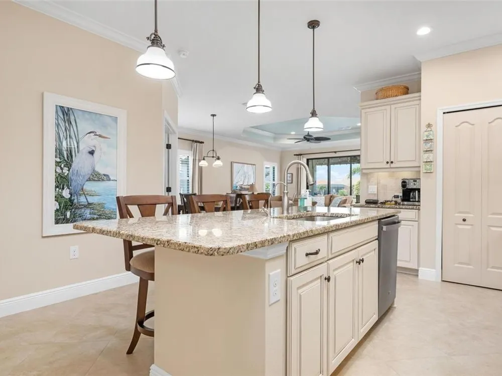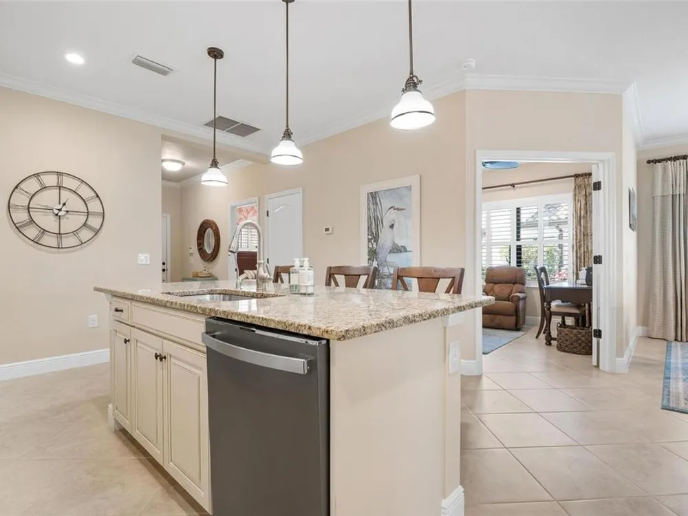 This amazing Villa truly has it all...3 bed/2 bath plus den, showcasing attention to every detail. Inside, the home is adorned with plantation shutters and closet systems to offer organized storage. The elegance continues with crown molding and coffered ceilings. While the kitchen boasts roll out drawers, under cabinet lighting, pantry and granite countertops. Tiled floors span the entire house, providing an elegant look. This look is complemented by the outside tiled, extended lanai that looks out to the beautiful full view of pond. The hurricane shades provide extra protection against harsh weather. Additional amenities include water softener, reverse osmosis and a hot water recirculation system. Ceiling fans throughout for optimal cooling. The laundry is equipped with cupboards, stationary tub and drying rack. This home features a whole house generator, and a whole house surge protector to ensure uninterrupted power. The garage is a standout with epoxy floors, insulated ceiling and doors, ample storage racks and cabinets and best of all...It has an AC unit to keep your treasures intact from the heat. The home has been freshly painted inside and out, and a new dishwasher was added in 2023.