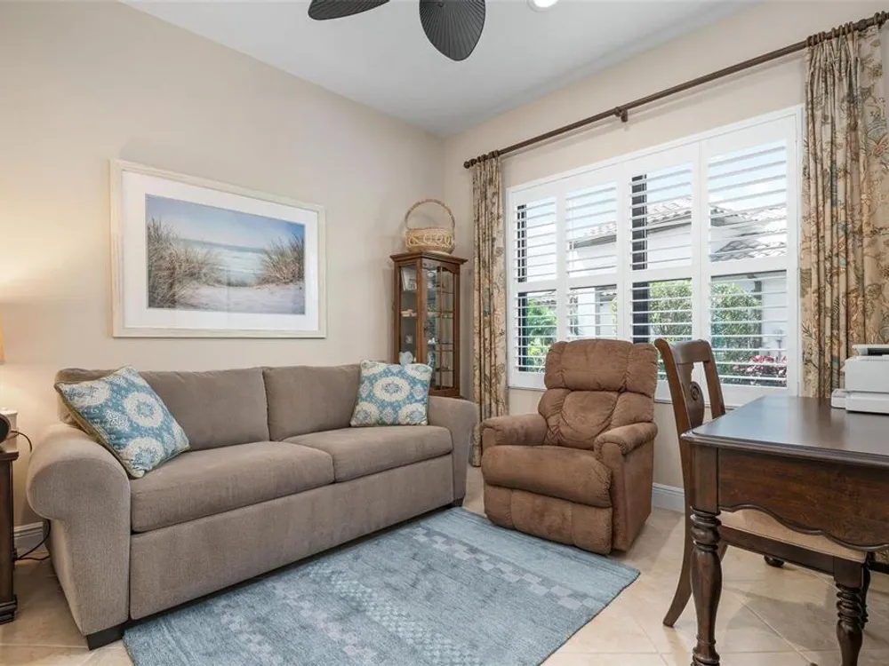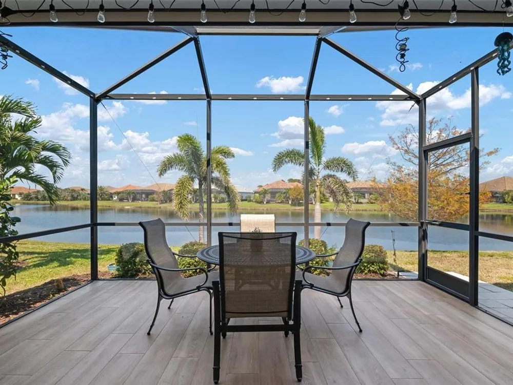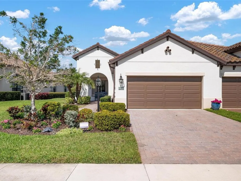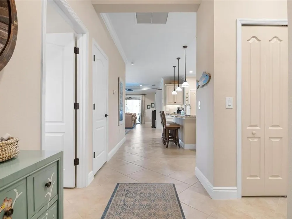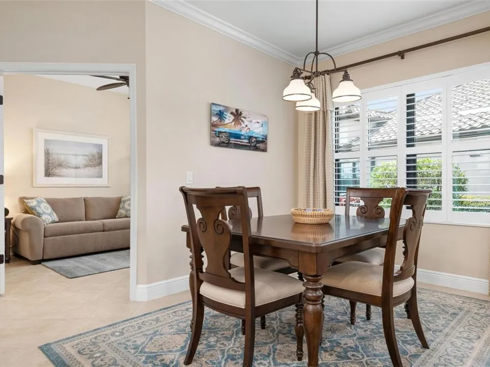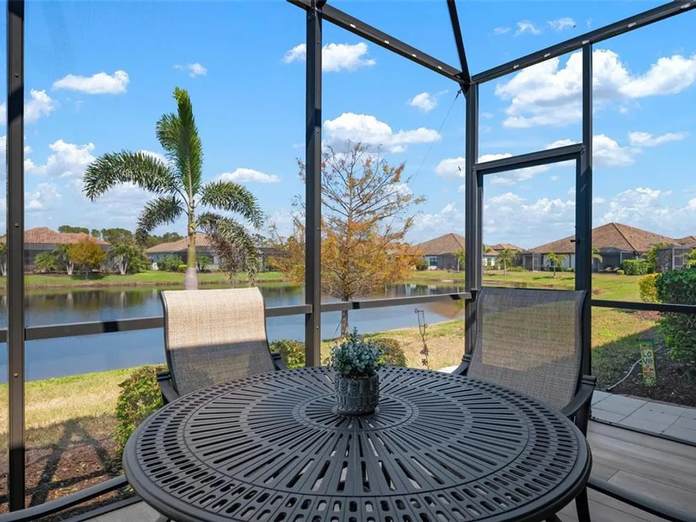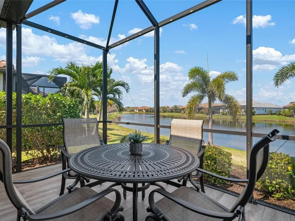 This amazing Villa truly has it all...3 bed/2 bath plus den, showcasing attention to every detail. Inside, the home is adorned with plantation shutters and closet systems to offer organized storage. The elegance continues with crown molding and coffered ceilings. While the kitchen boasts roll out drawers, under cabinet lighting, pantry and granite countertops. Tiled floors span the entire house, providing an elegant look. This look is complemented by the outside tiled, extended lanai that looks out to the beautiful full view of pond. The hurricane shades provide extra protection against harsh weather. Additional amenities include water softener, reverse osmosis and a hot water recirculation system. Ceiling fans throughout for optimal cooling. The laundry is equipped with cupboards, stationary tub and drying rack. This home features a whole house generator, and a whole house surge protector to ensure uninterrupted power. The garage is a standout with epoxy floors, insulated ceiling and doors, ample storage racks and cabinets and best of all...It has an AC unit to keep your treasures intact from the heat. The home has been freshly painted inside and out, and a new dishwasher was added in 2023.