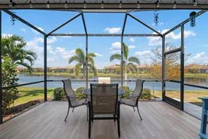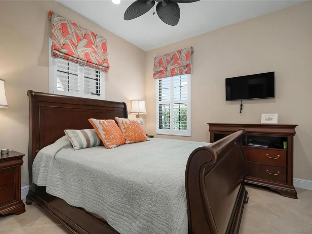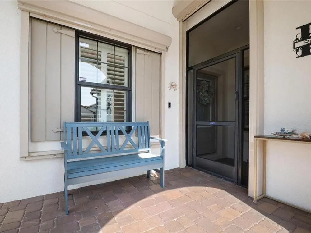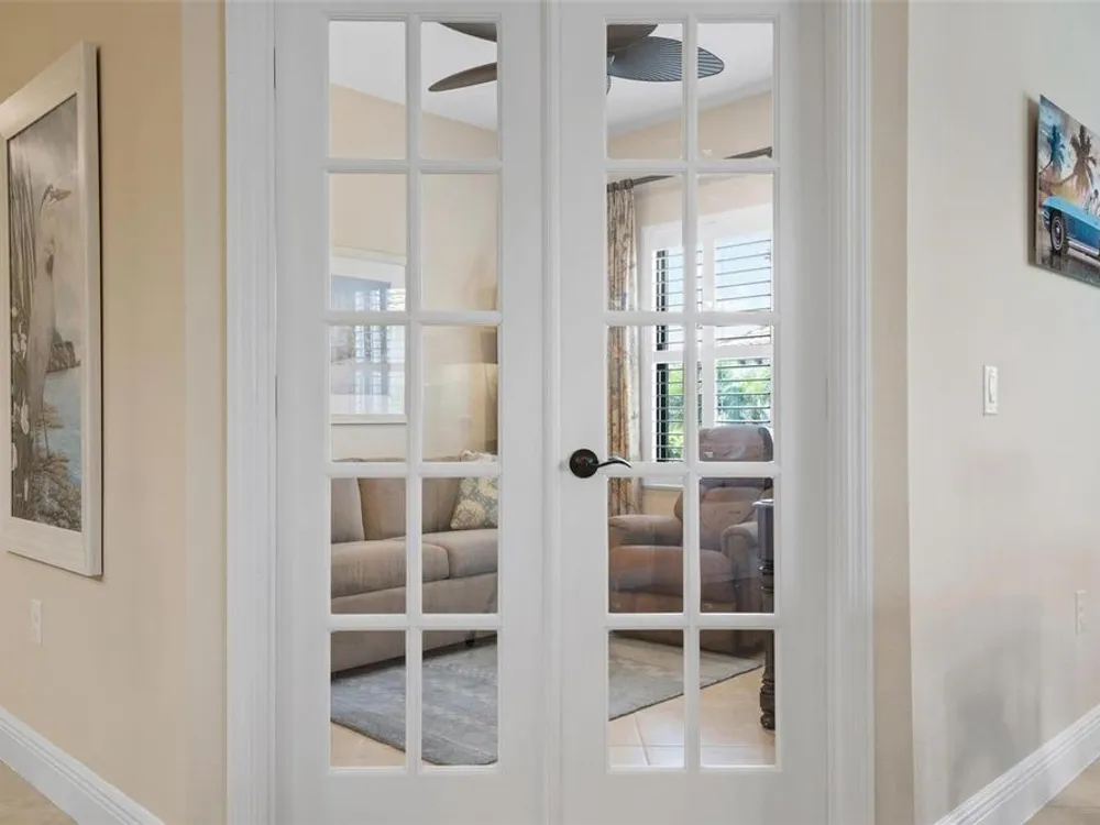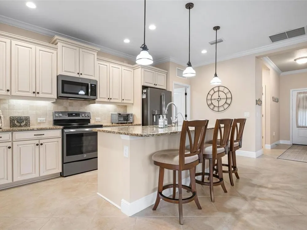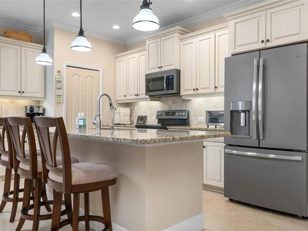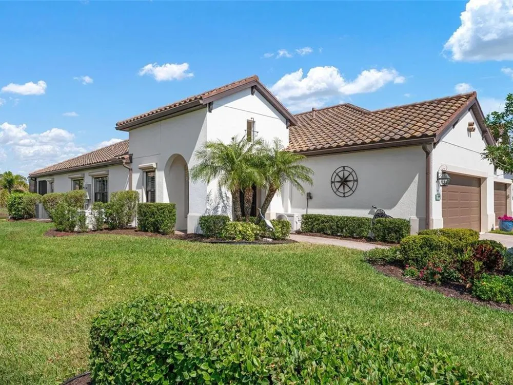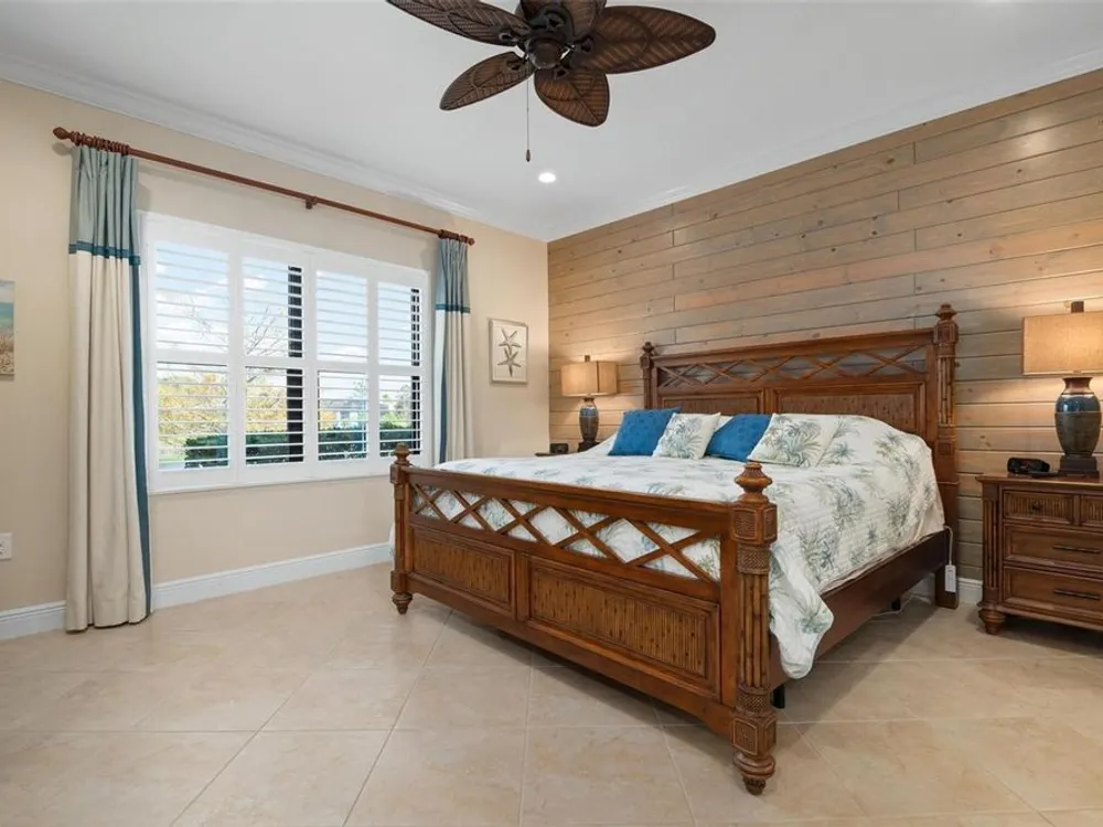 This amazing Villa truly has it all...3 bed/2 bath plus den, showcasing attention to every detail. Inside, the home is adorned with plantation shutters and closet systems to offer organized storage. The elegance continues with crown molding and coffered ceilings. While the kitchen boasts roll out drawers, under cabinet lighting, pantry and granite countertops. Tiled floors span the entire house, providing an elegant look. This look is complemented by the outside tiled, extended lanai that looks out to the beautiful full view of pond. The hurricane shades provide extra protection against harsh weather. Additional amenities include water softener, reverse osmosis and a hot water recirculation system. Ceiling fans throughout for optimal cooling. The laundry is equipped with cupboards, stationary tub and drying rack. This home features a whole house generator, and a whole house surge protector to ensure uninterrupted power. The garage is a standout with epoxy floors, insulated ceiling and doors, ample storage racks and cabinets and best of all...It has an AC unit to keep your treasures intact from the heat. The home has been freshly painted inside and out, and a new dishwasher was added in 2023.