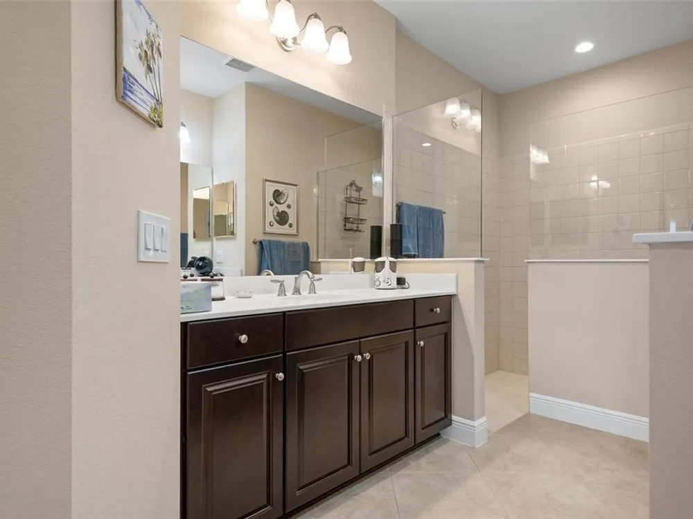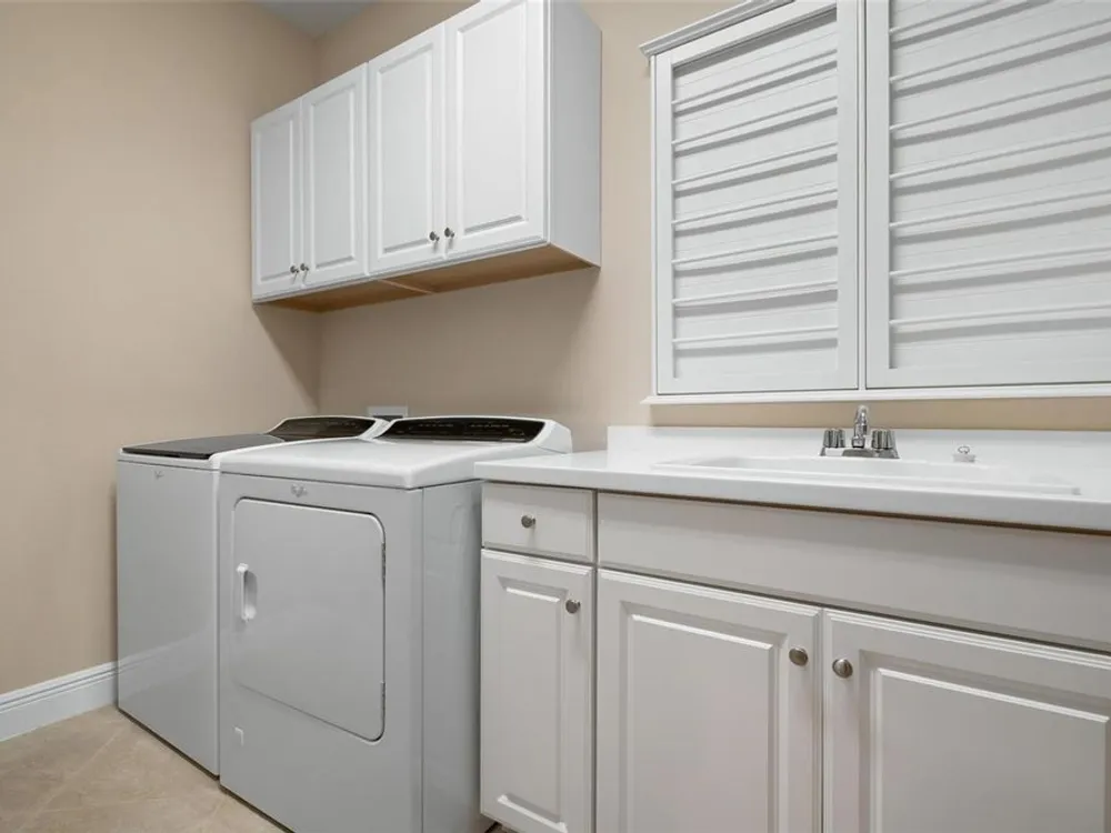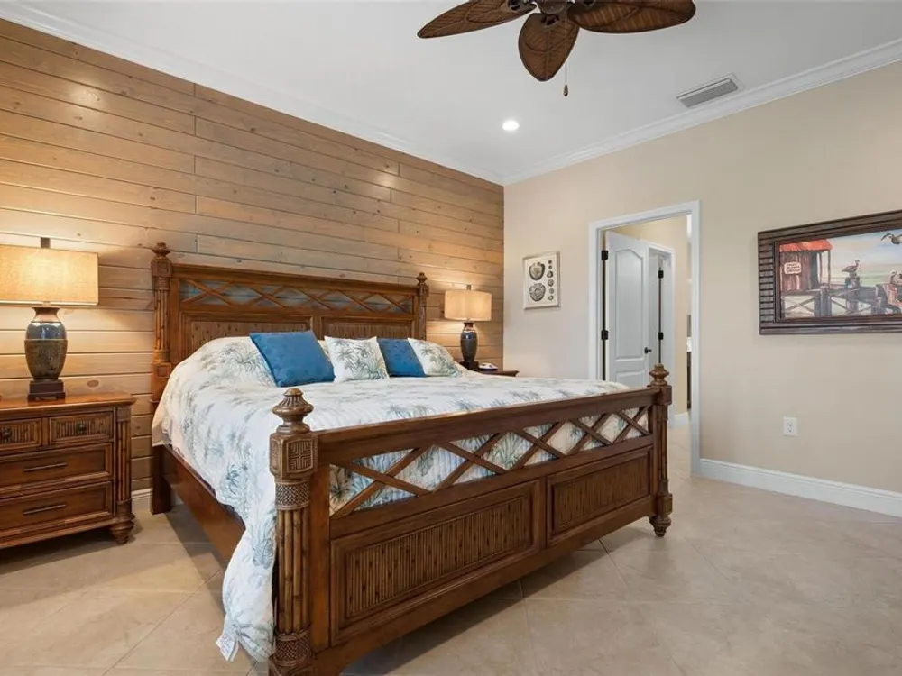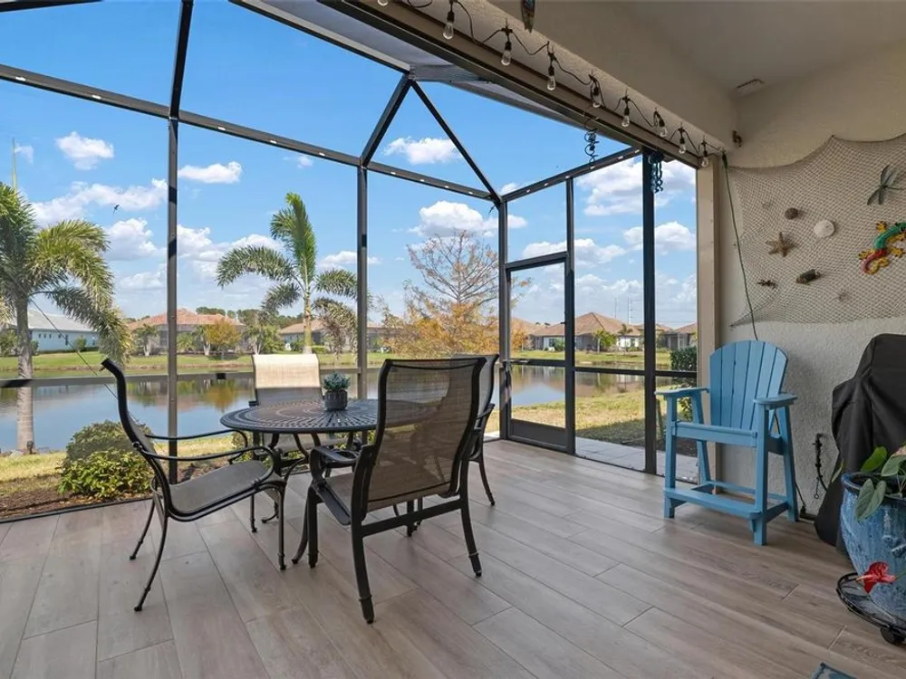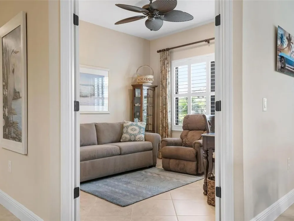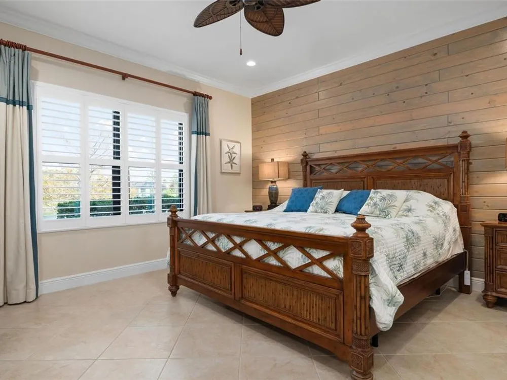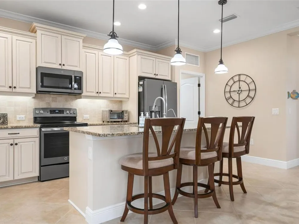 This amazing Villa truly has it all...3 bed/2 bath plus den, showcasing attention to every detail. Inside, the home is adorned with plantation shutters and closet systems to offer organized storage. The elegance continues with crown molding and coffered ceilings. While the kitchen boasts roll out drawers, under cabinet lighting, pantry and granite countertops. Tiled floors span the entire house, providing an elegant look. This look is complemented by the outside tiled, extended lanai that looks out to the beautiful full view of pond. The hurricane shades provide extra protection against harsh weather. Additional amenities include water softener, reverse osmosis and a hot water recirculation system. Ceiling fans throughout for optimal cooling. The laundry is equipped with cupboards, stationary tub and drying rack. This home features a whole house generator, and a whole house surge protector to ensure uninterrupted power. The garage is a standout with epoxy floors, insulated ceiling and doors, ample storage racks and cabinets and best of all...It has an AC unit to keep your treasures intact from the heat. The home has been freshly painted inside and out, and a new dishwasher was added in 2023.