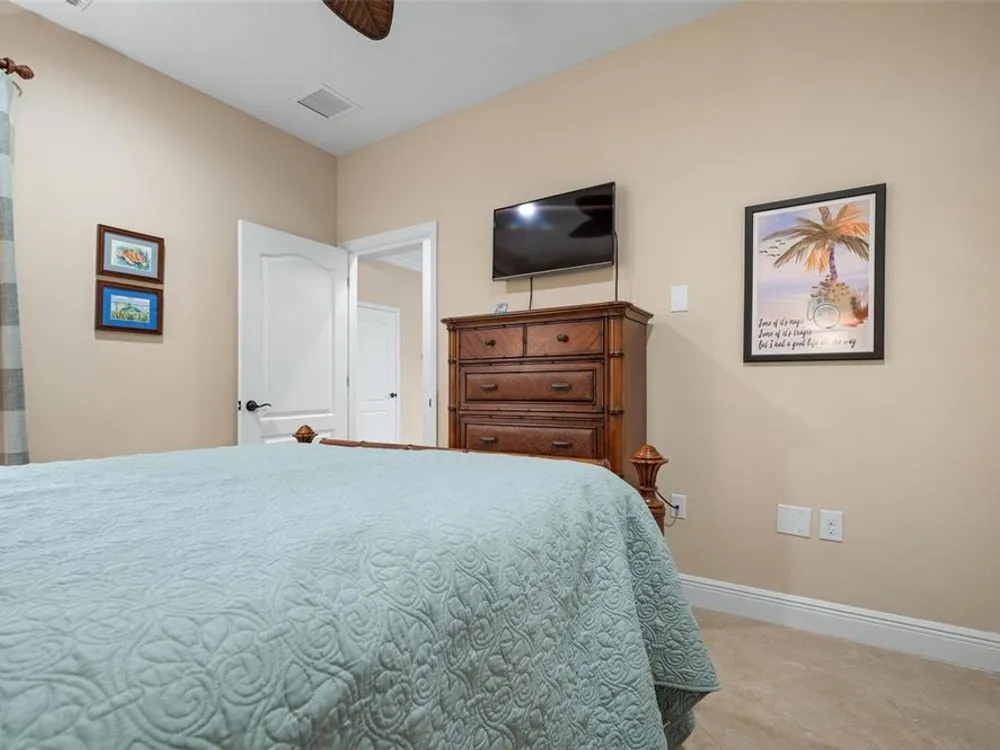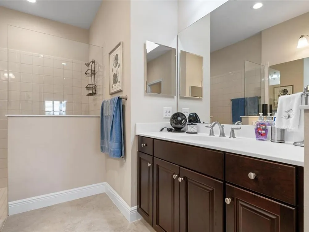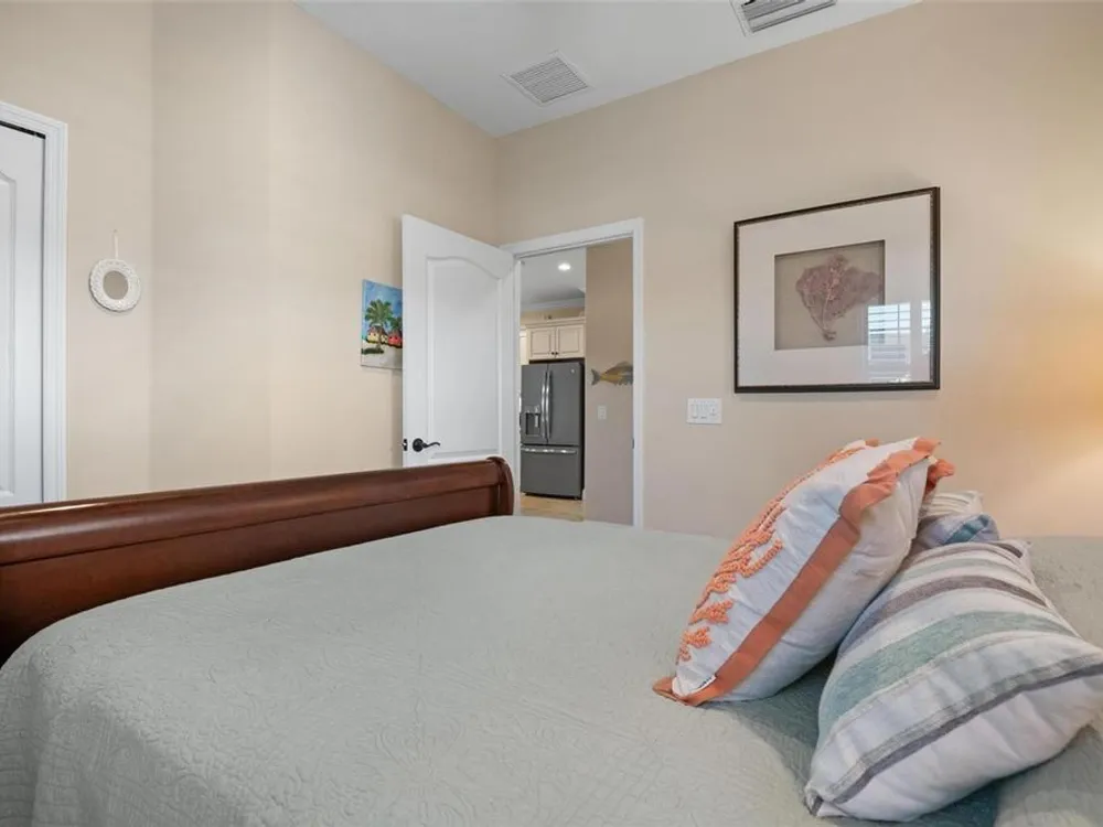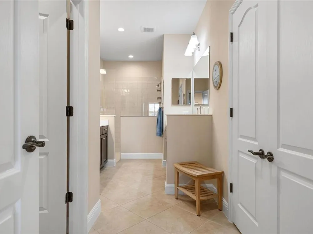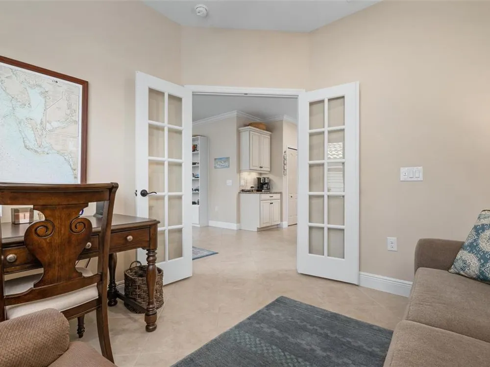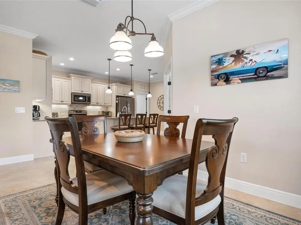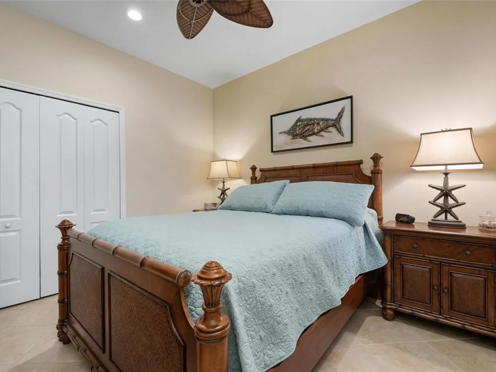 This amazing Villa truly has it all...3 bed/2 bath plus den, showcasing attention to every detail. Inside, the home is adorned with plantation shutters and closet systems to offer organized storage. The elegance continues with crown molding and coffered ceilings. While the kitchen boasts roll out drawers, under cabinet lighting, pantry and granite countertops. Tiled floors span the entire house, providing an elegant look. This look is complemented by the outside tiled, extended lanai that looks out to the beautiful full view of pond. The hurricane shades provide extra protection against harsh weather. Additional amenities include water softener, reverse osmosis and a hot water recirculation system. Ceiling fans throughout for optimal cooling. The laundry is equipped with cupboards, stationary tub and drying rack. This home features a whole house generator, and a whole house surge protector to ensure uninterrupted power. The garage is a standout with epoxy floors, insulated ceiling and doors, ample storage racks and cabinets and best of all...It has an AC unit to keep your treasures intact from the heat. The home has been freshly painted inside and out, and a new dishwasher was added in 2023.