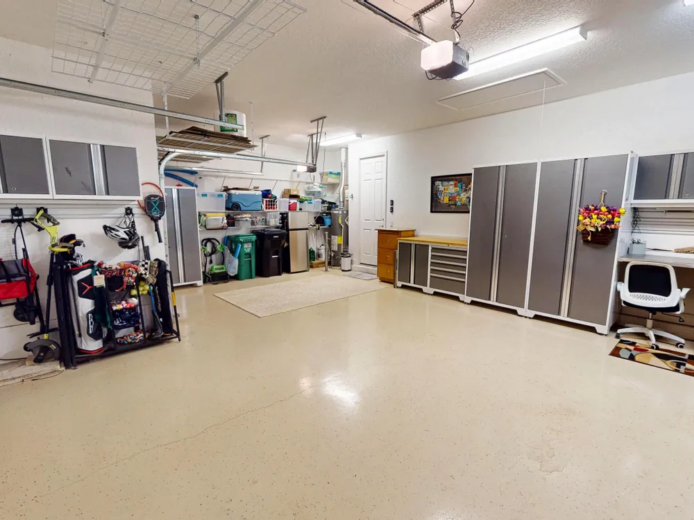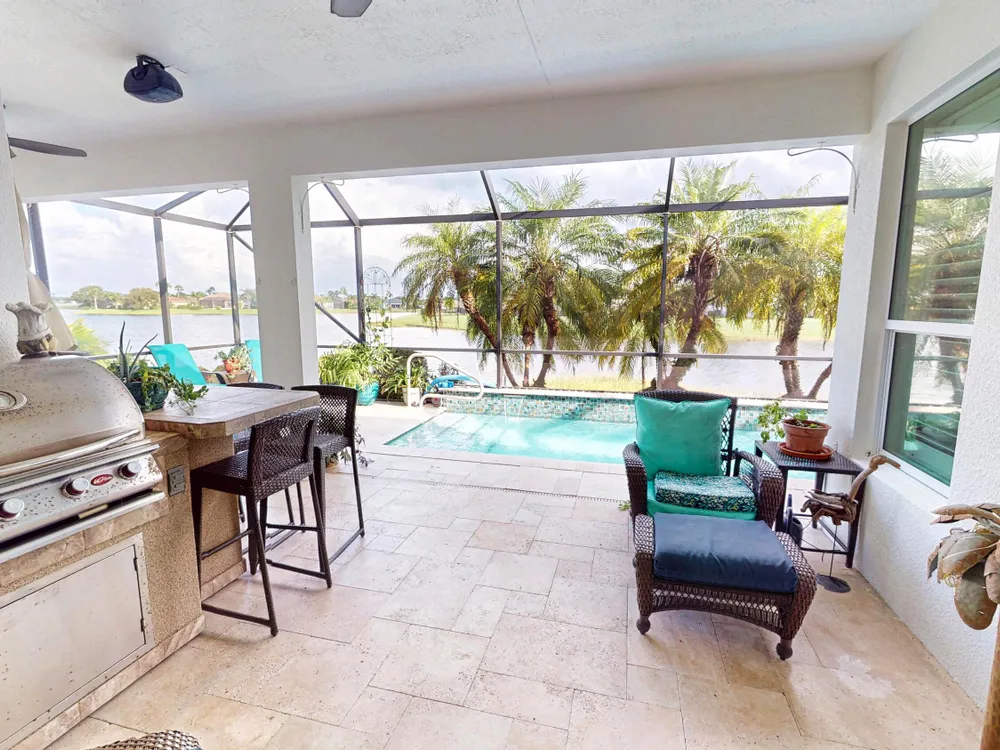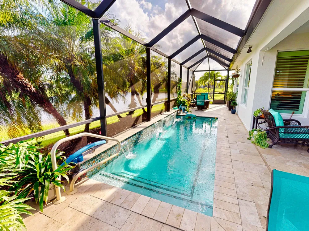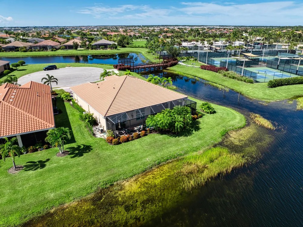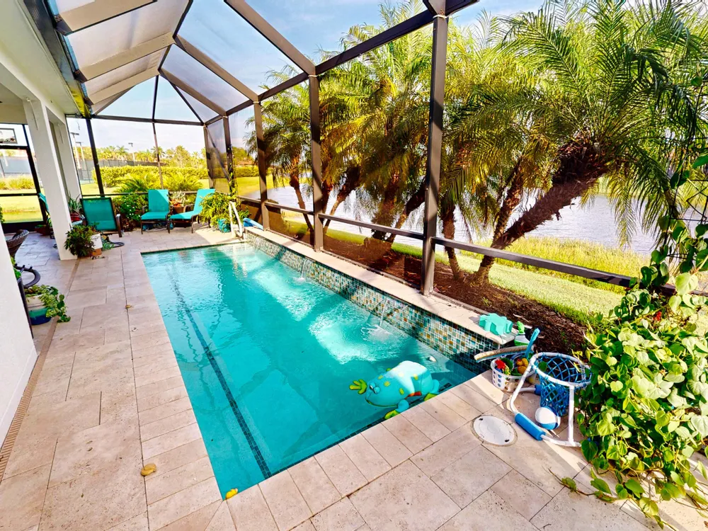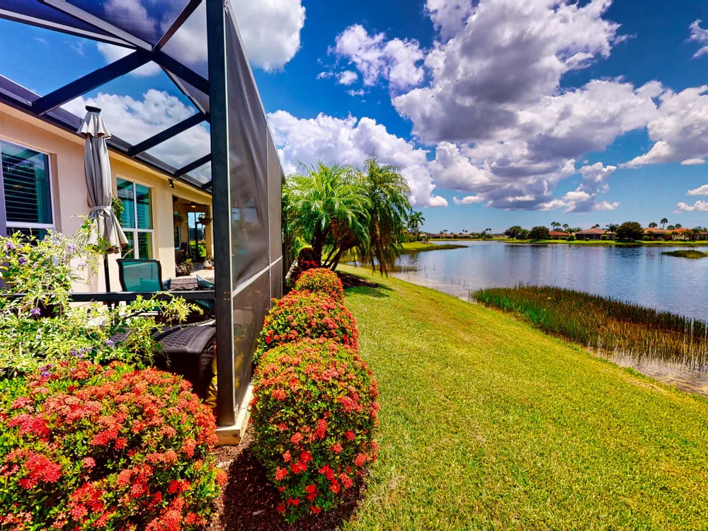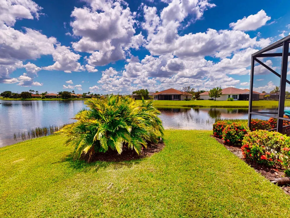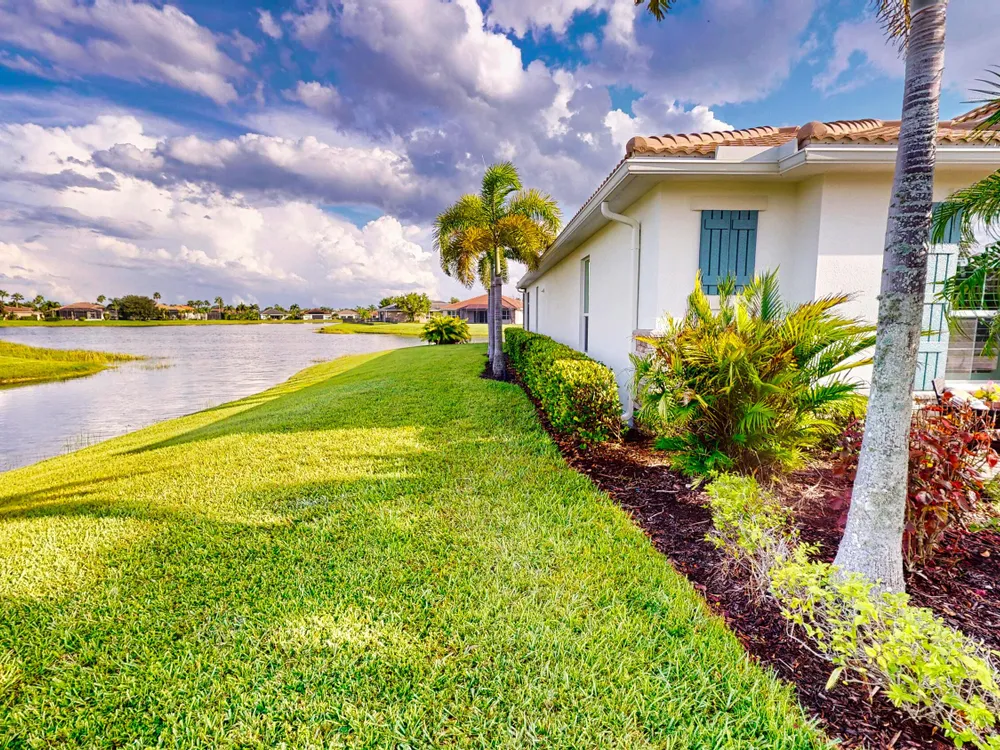 This stunning upgraded 3-bedroom, 2.5-bath home with office is set on a prime quiet cul-de-sac lot, offering over 2,400 sqft of beautifully living space. Throughout the home, you'll find crown molding, tray ceilings, upgraded lighting & fans plus built-in speakers in both the living room and lanai. The GARAGE is a standout with a 4-foot extension, golf cart garage, premium NewAge 24'' deep steel cabinets, shelving, HyLoft storage racks, & a floored attic with a elec pulley for safe access. Recent updates: new AC, dishwasher, & hot water heater, for long term use. Two guest bedrooms share a full bath, while a stylish half bath is perfect for guests. Enjoy open 180 lake views from your 24x54' travertine lanai complete with a 7x20.5' heated fountain saltwater POOL, gas firepit & BBQ. w b