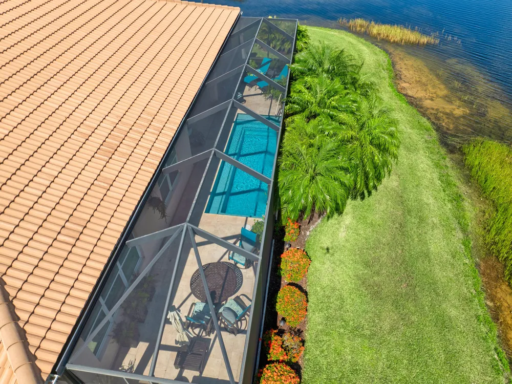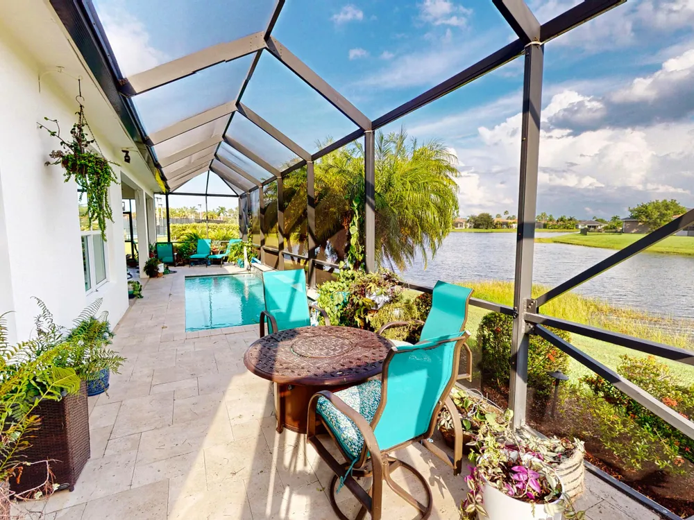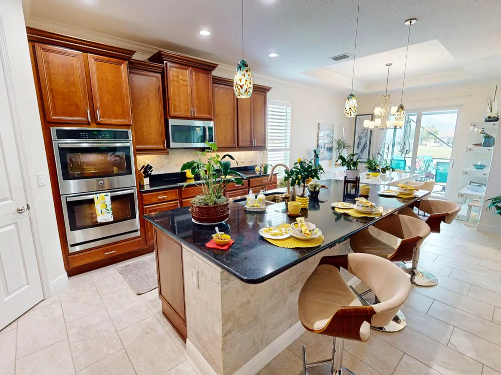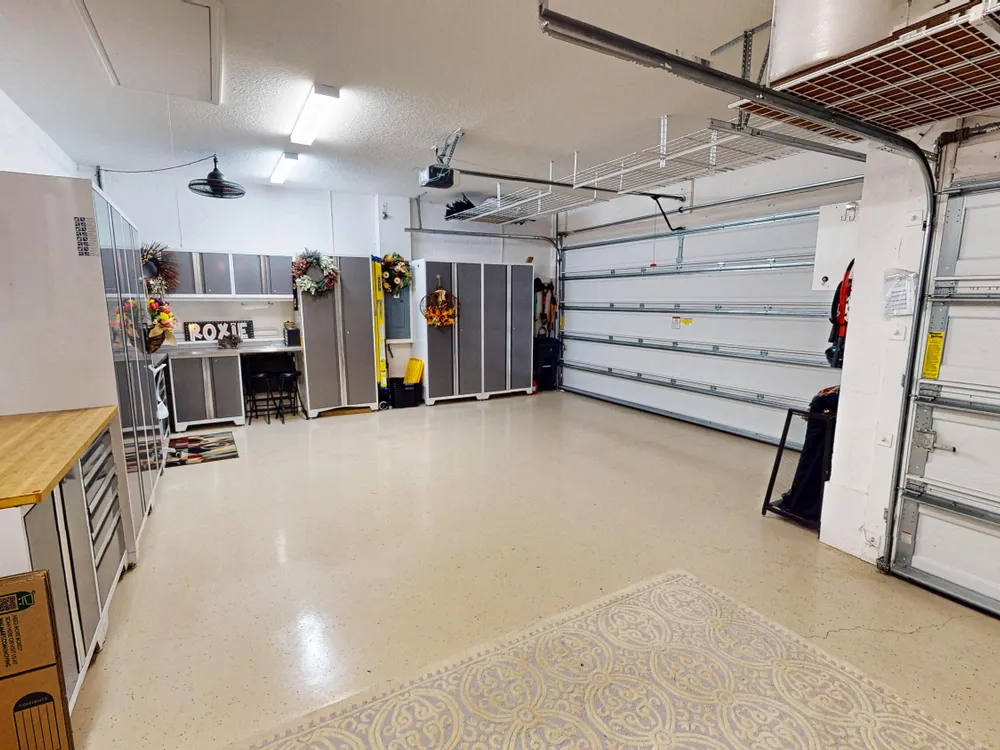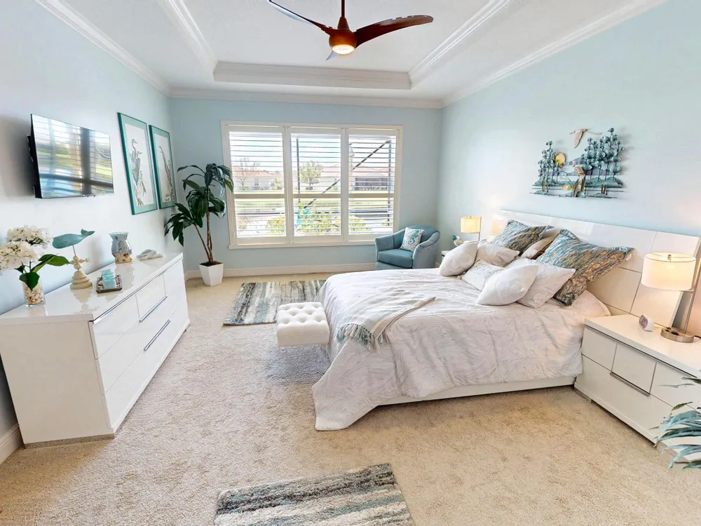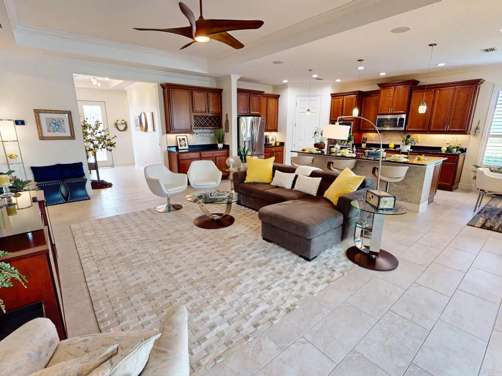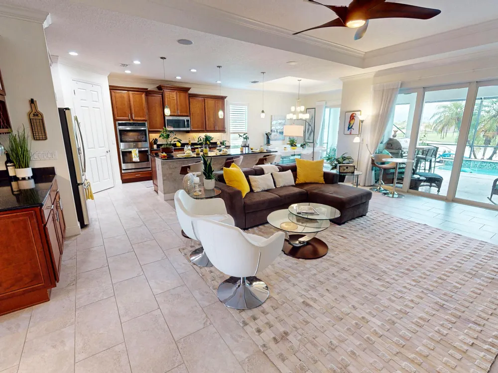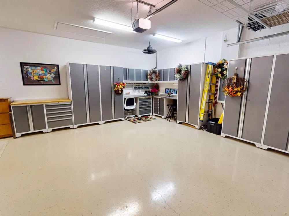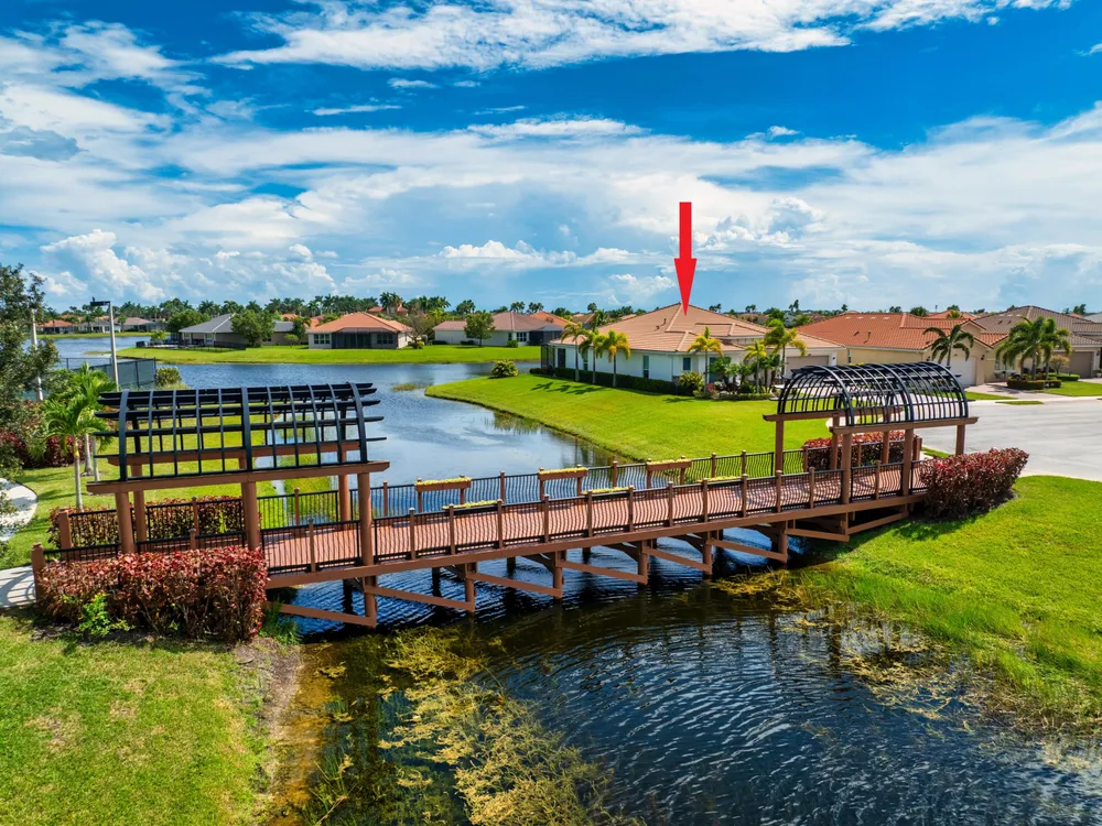 This stunning upgraded 3-bedroom, 2.5-bath home with office is set on a prime quiet cul-de-sac lot, offering over 2,400 sqft of beautifully living space. Throughout the home, you'll find crown molding, tray ceilings, upgraded lighting & fans plus built-in speakers in both the living room and lanai. The GARAGE is a standout with a 4-foot extension, golf cart garage, premium NewAge 24'' deep steel cabinets, shelving, HyLoft storage racks, & a floored attic with a elec pulley for safe access. Recent updates: new AC, dishwasher, & hot water heater, for long term use. Two guest bedrooms share a full bath, while a stylish half bath is perfect for guests. Enjoy open 180 lake views from your 24x54' travertine lanai complete with a 7x20.5' heated fountain saltwater POOL, gas firepit & BBQ. w b