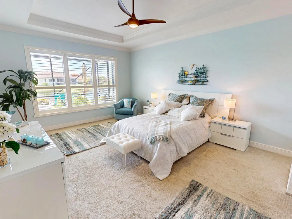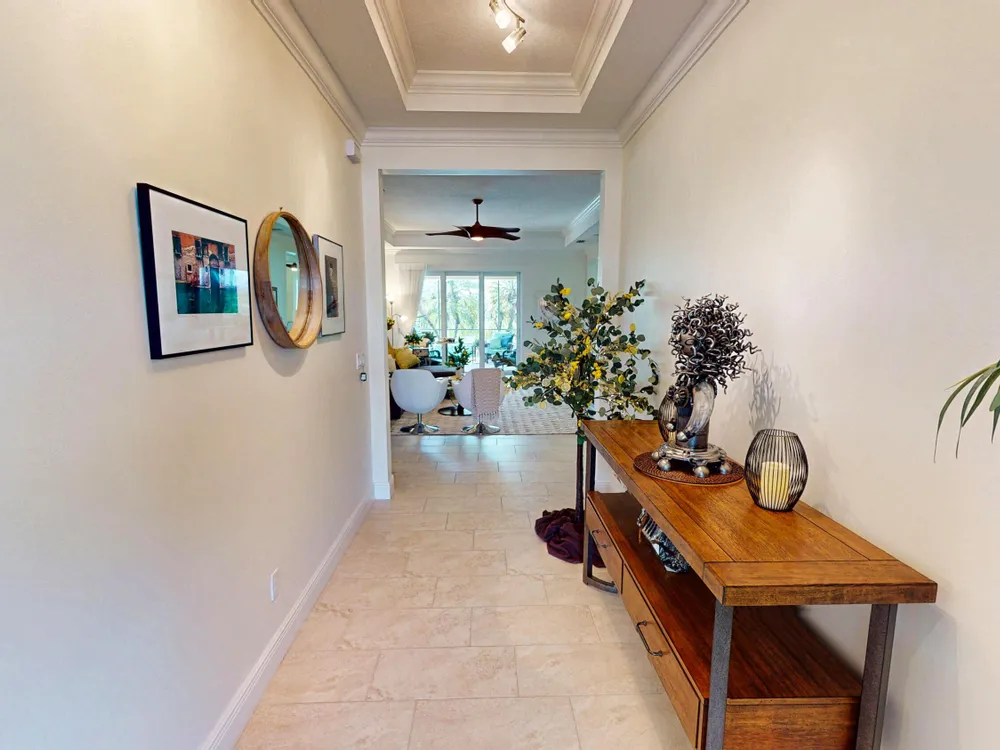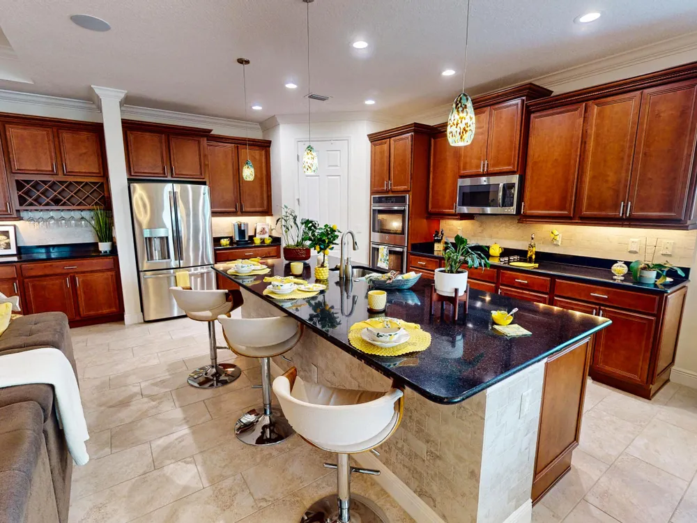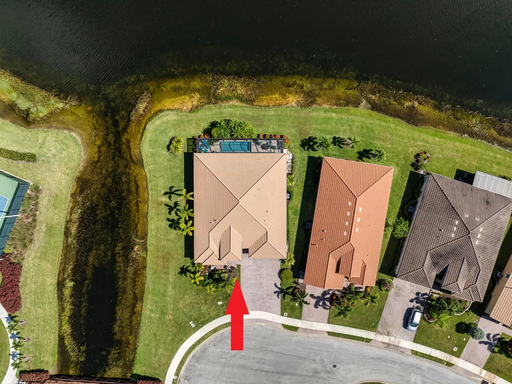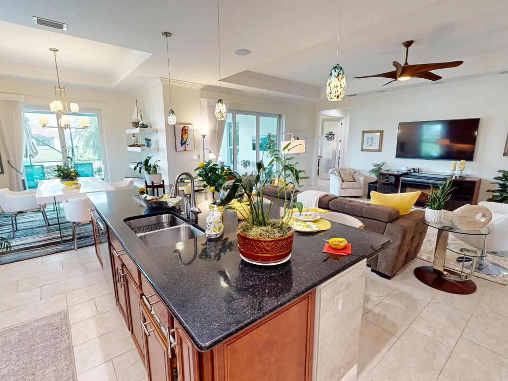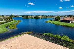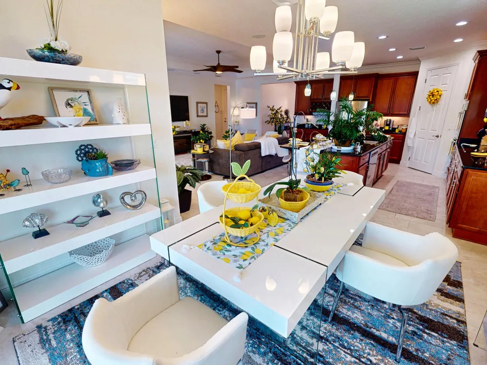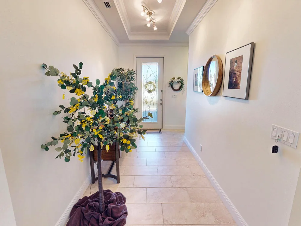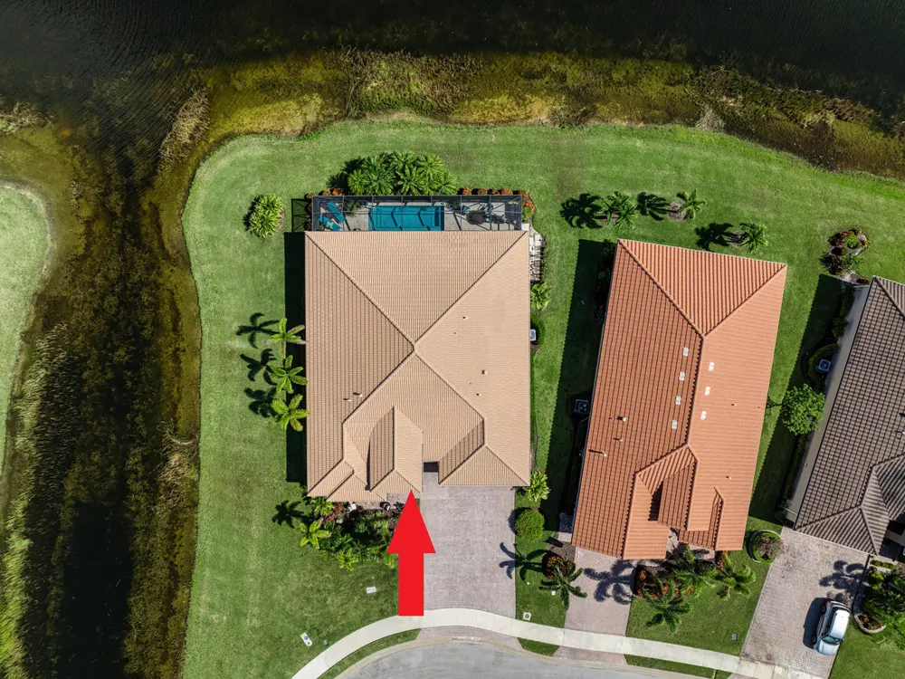 This stunning upgraded 3-bedroom, 2.5-bath home with office is set on a prime quiet cul-de-sac lot, offering over 2,400 sqft of beautifully living space. Throughout the home, you'll find crown molding, tray ceilings, upgraded lighting & fans plus built-in speakers in both the living room and lanai. The GARAGE is a standout with a 4-foot extension, golf cart garage, premium NewAge 24'' deep steel cabinets, shelving, HyLoft storage racks, & a floored attic with a elec pulley for safe access. Recent updates: new AC, dishwasher, & hot water heater, for long term use. Two guest bedrooms share a full bath, while a stylish half bath is perfect for guests. Enjoy open 180 lake views from your 24x54' travertine lanai complete with a 7x20.5' heated fountain saltwater POOL, gas firepit & BBQ. w b