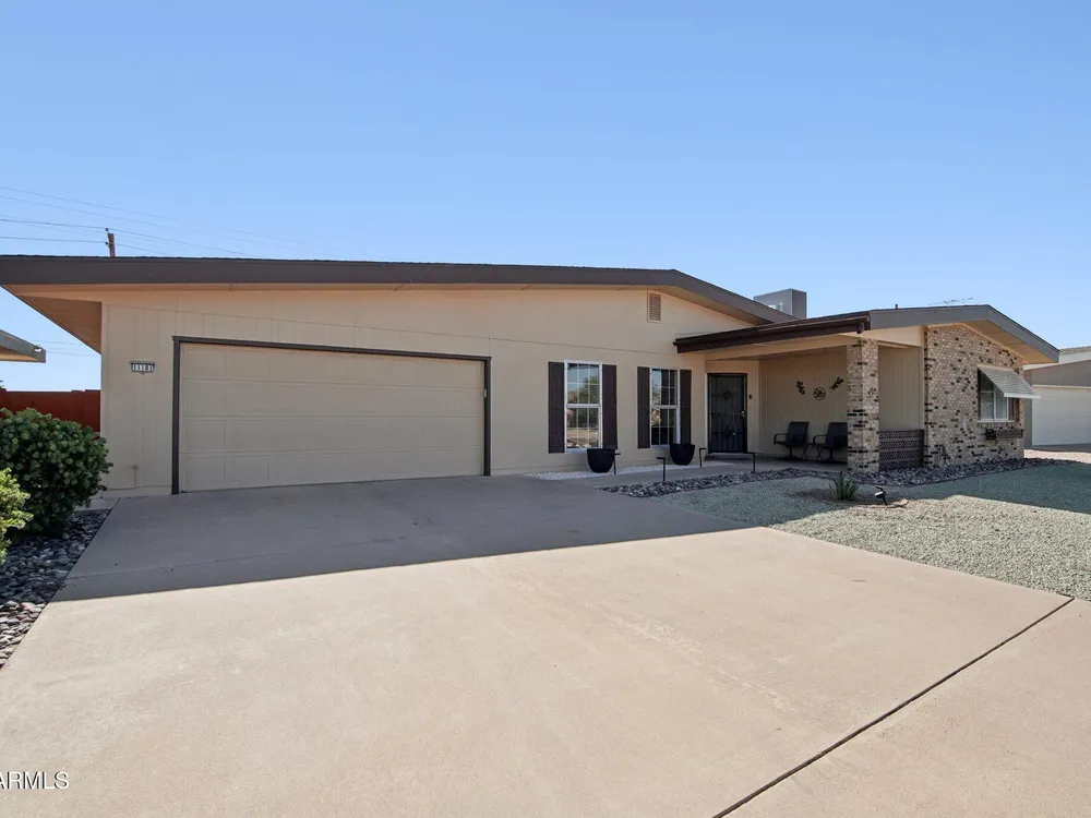 Welcome to this charming 3-bedroom, 2-bath home featuring a private, completely fenced backyard with views of the White Tank Mountains. Enjoy Arizona's famous sunsets from the covered back patio, or sip your morning coffee on the inviting front porch. Inside, you'll find high ceilings, a formal dining room, and walk-in closets in all three bedrooms. The extended-depth garage easily accommodates two vehicles plus a golf cart, along with the third bedroom this home is a rare and desirable find in this community.