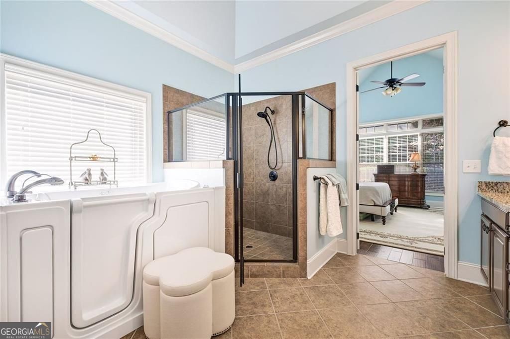 - Bookcases, Double Vanity, High Ceilings, Main Level Primary, Separate Shower, Tile Bath, Vaulted Ceiling(s), Walk-In Closet(s), Storm Window(s), Bonus Room, Home Office, Sunroom