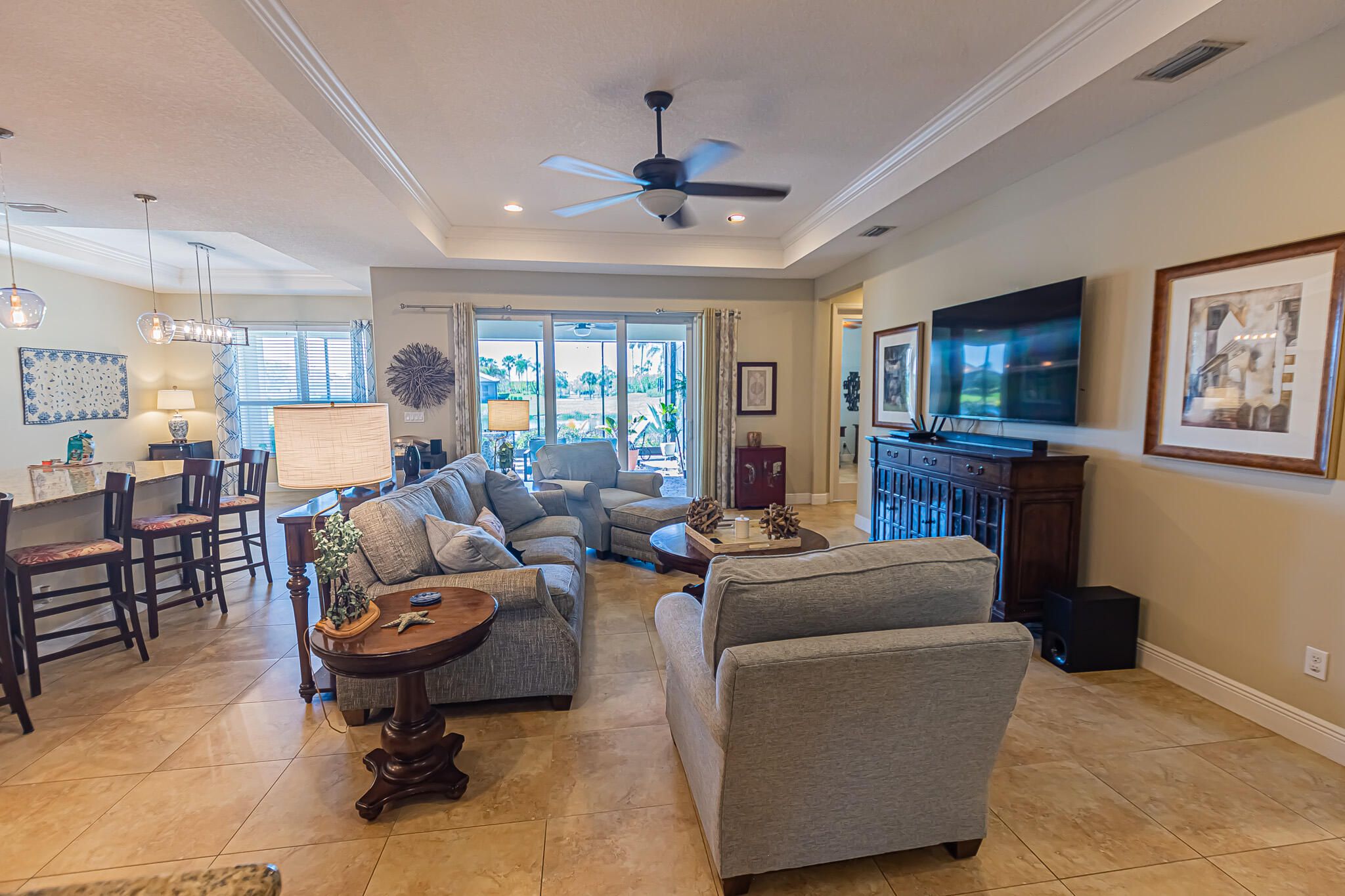 Enjoy refined waterfront living in Vitalia in this beautifully maintained Perdido Key model offering 3 bedrooms + den, 2.5 baths, & a 2.5-car extended garage. Designed for comfort & durability, the home features impact glass, tray ceilings, tile flooring in main areas & laminate in the primary suite. The gourmet kitchen shines with granite countertops, 42" wood cabinetry, stainless appliances, gas cooking & a spacious pantry. The open living area flows to an extended screened paver patio & covered lanai—perfect for year-round relaxation or entertaining. The exterior was painted in 2024 & features upgraded landscaping front & back for added curb appeal & privacy. Located in a premier 55+ community with resort-style amenities, all just minutes from shopping & dining at Tradition Town Center.