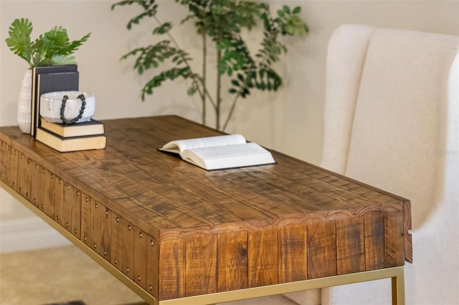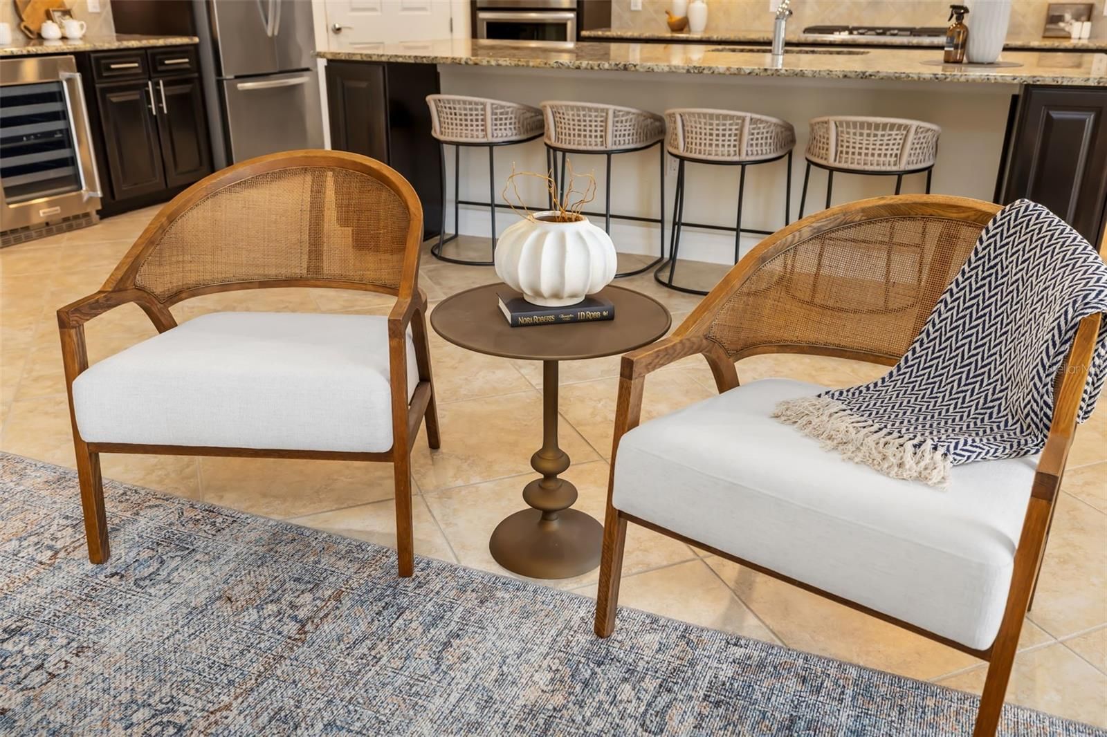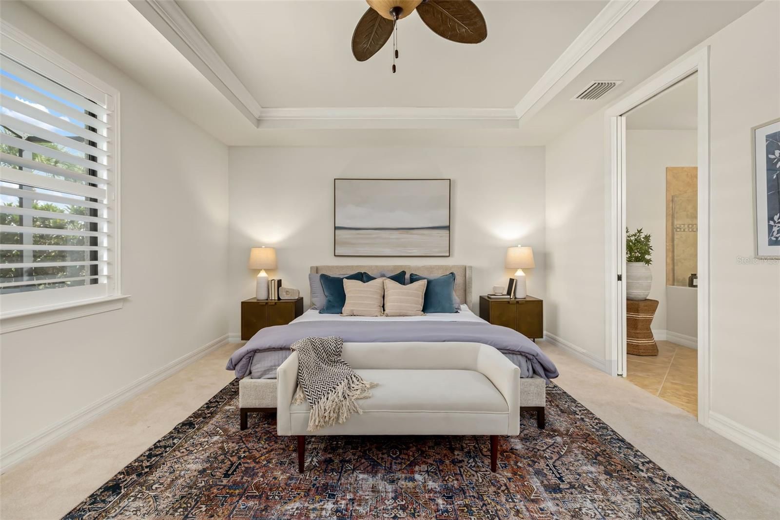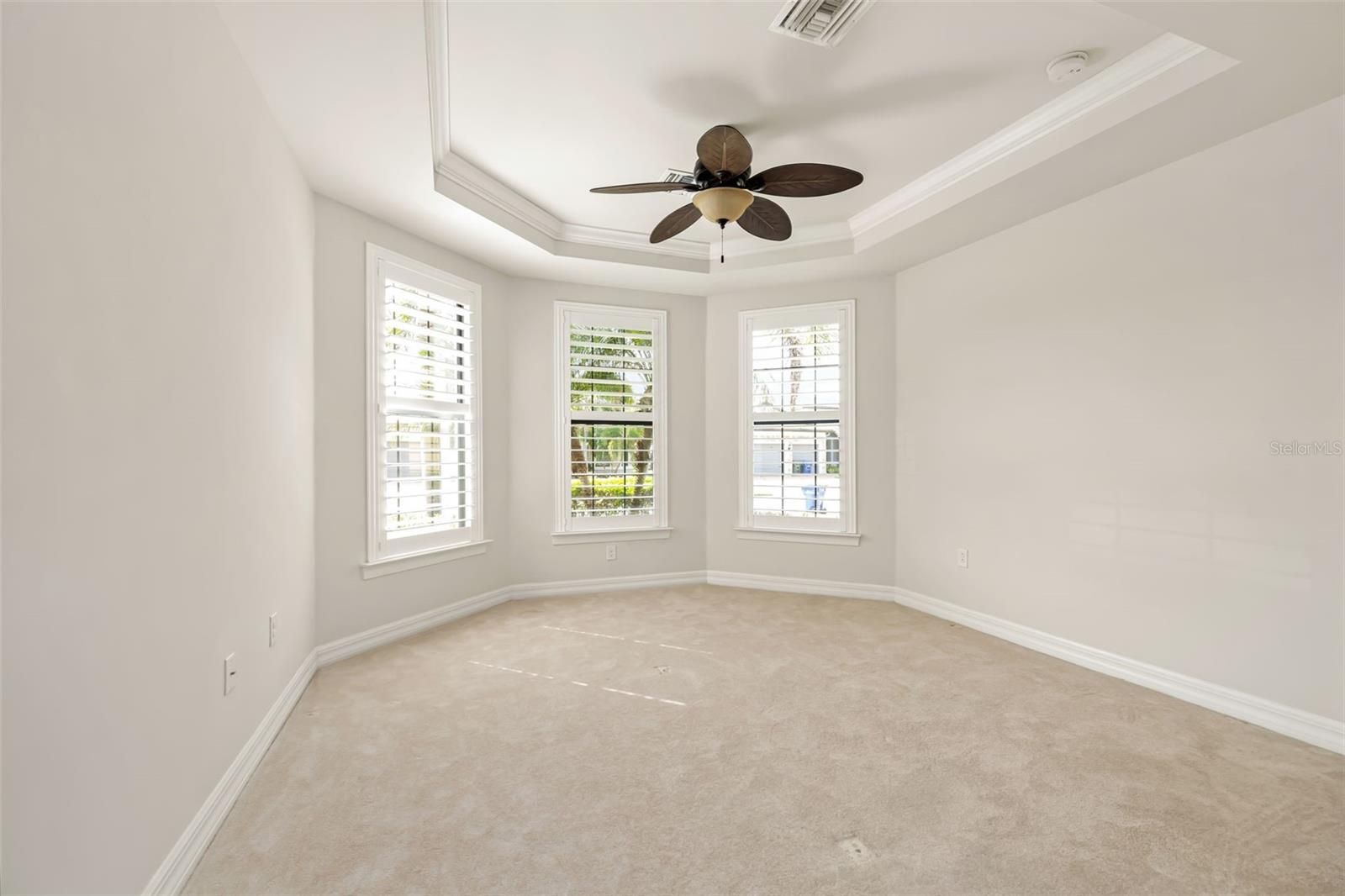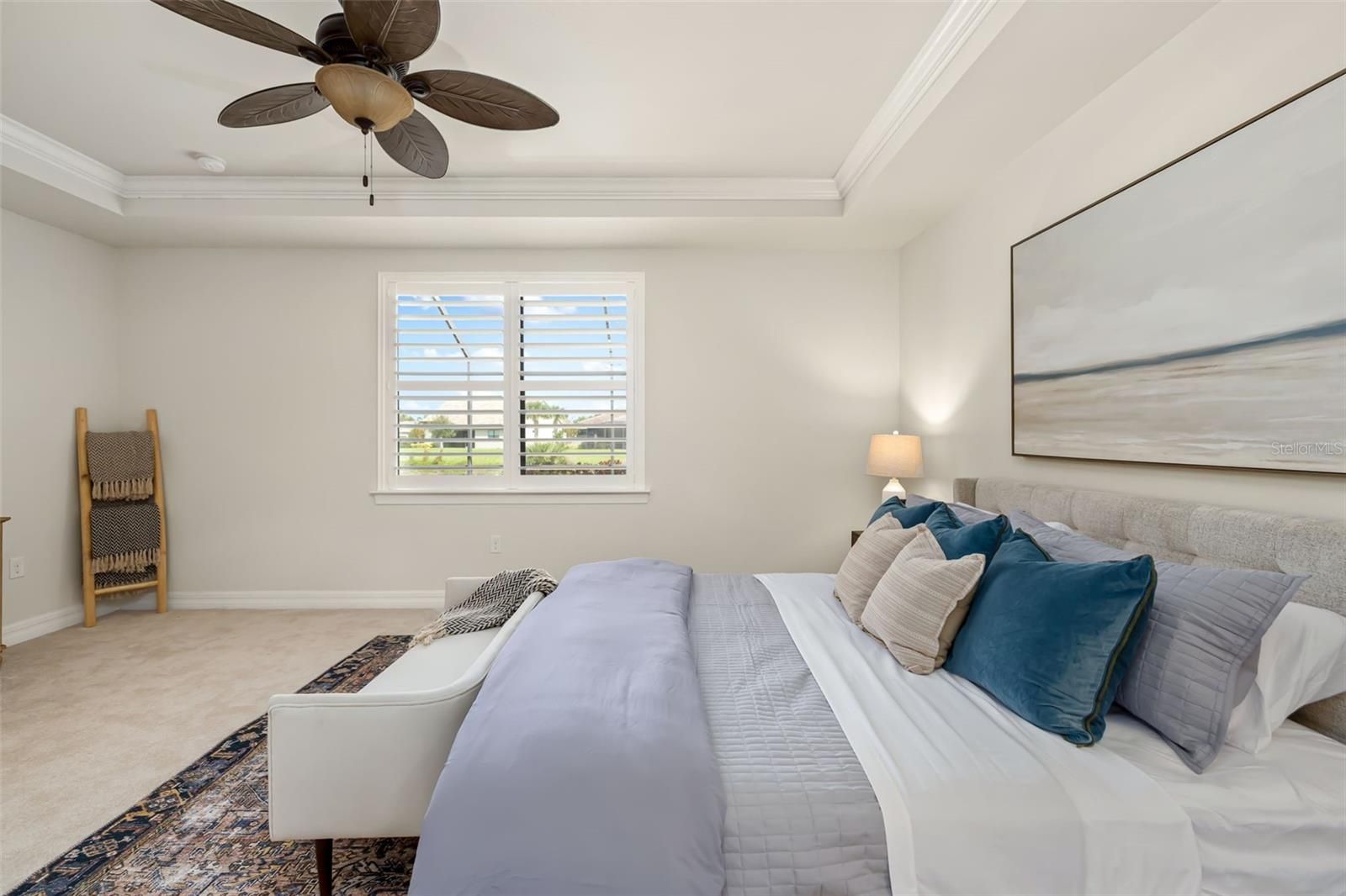 - Ceiling Fan(s), Coffered Ceiling(s), High Ceilings, Kitchen/Family Room Combo, Open Floorplan, Main Level Primary, Solid Surface Counters, Split Bedrooms, Tray Ceiling(s), Walk-In Closet(s), Window Treatments