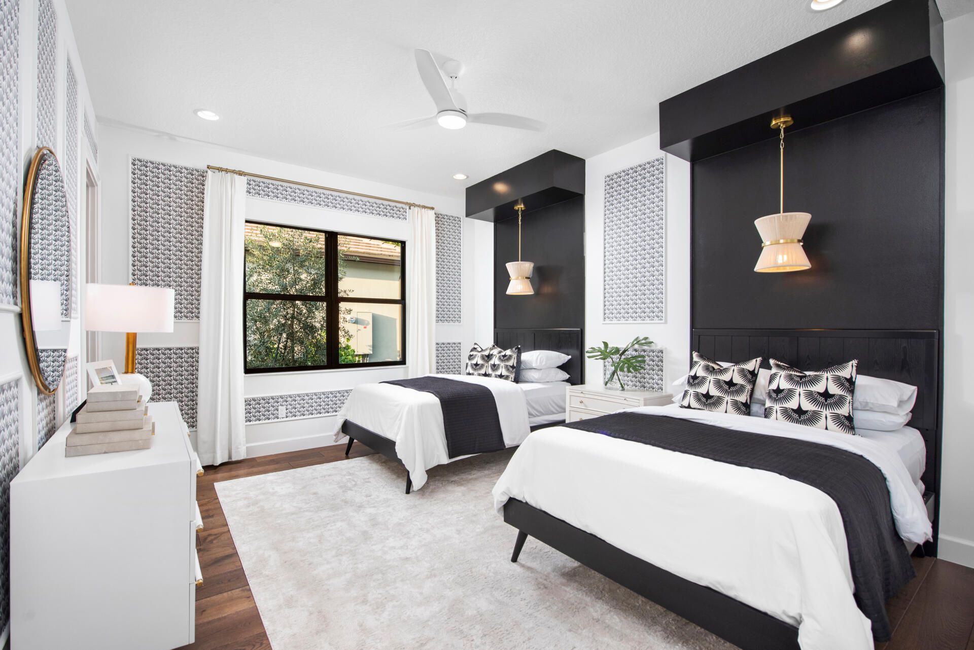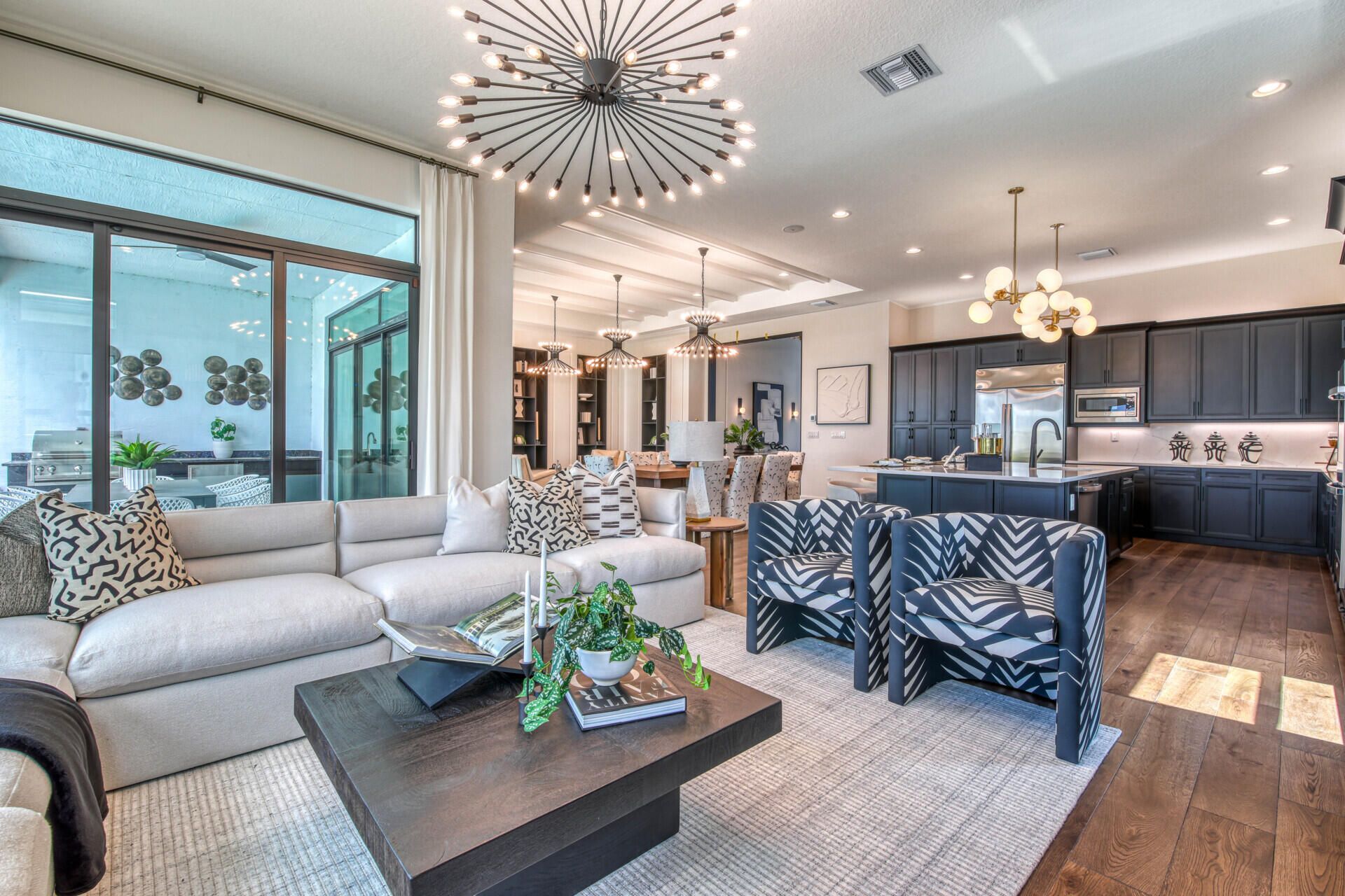 Fully-Furnished & Designer-Decorated Model Home with 3 Bedrooms, a Club Room, Family Room, Living Room, 3.5 Baths, Split 3-Car Garage, a Pool w/Sheer Descent and a Summer Kitchen on a stunning lakefront lot. The Sonoma model features 14-foot ceilings, rich engineered wood floors, a gourmet kitchen, with sleek matte black cabinetry, glass accents, a custom wood hood, and a 42'' built-in refrigerator. The primary suite features a floor-to-ceiling upholstered headboard, designer lighting, and a spa-style bath with a soaking tub. A stylish club room with custom built-ins and multiple TVs offers the perfect space for entertaining. Amenities include a full service restaurant, Indoor pickleball, 44,000 square foot clubhouse with a spa and salon, indoor/outdoor bar, multiple pools, tennis & more.
