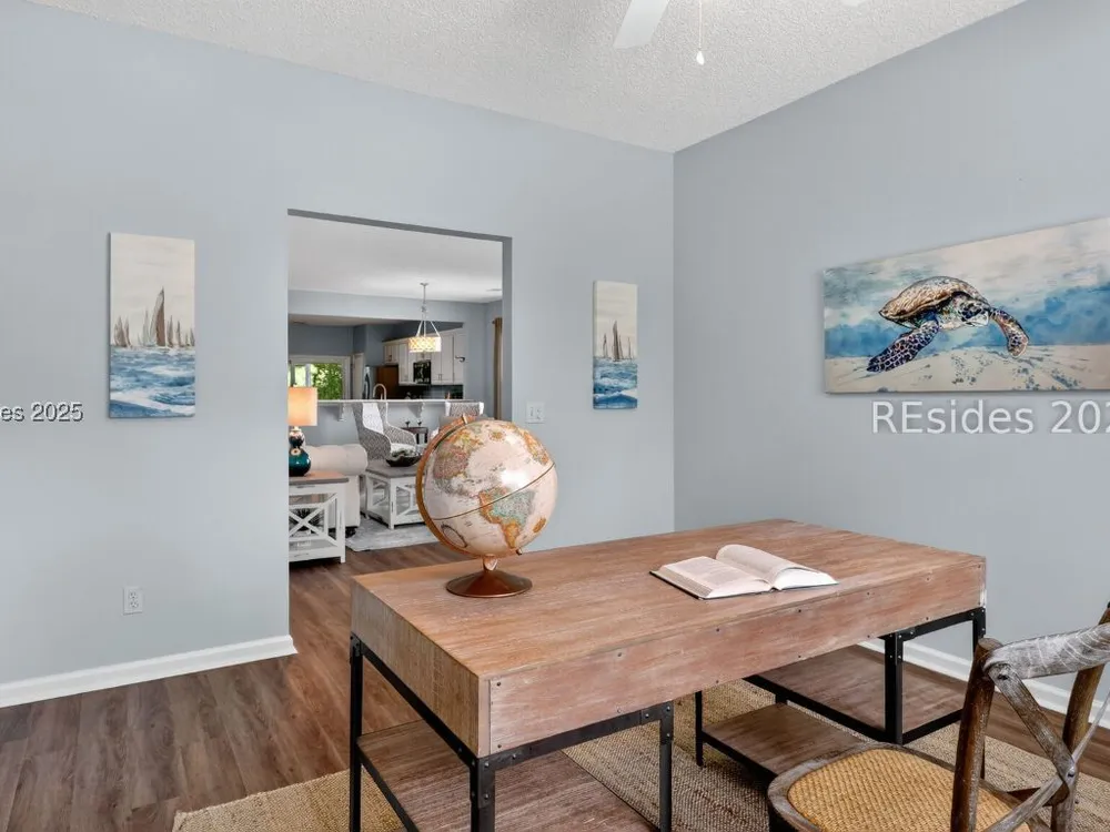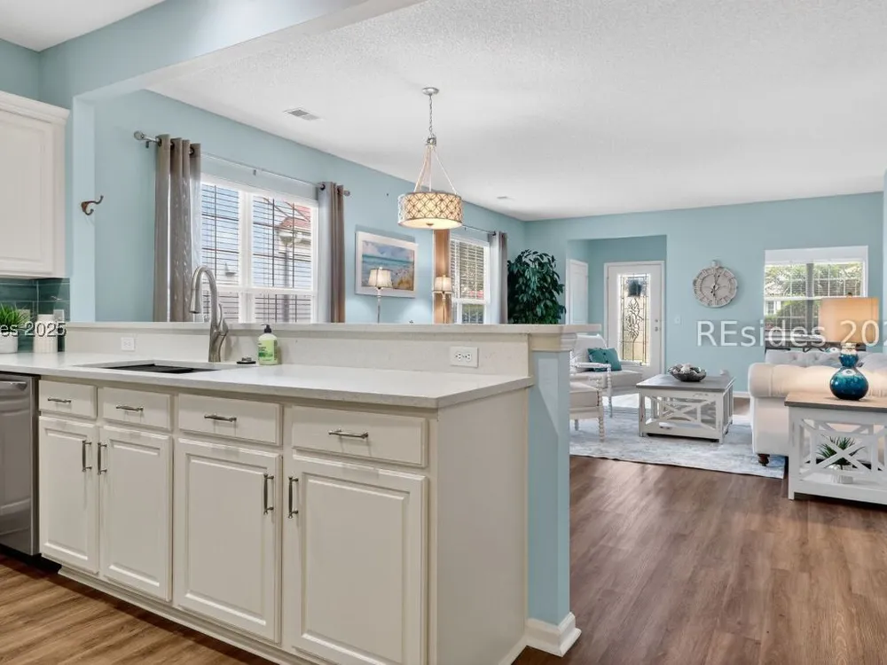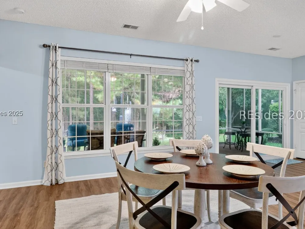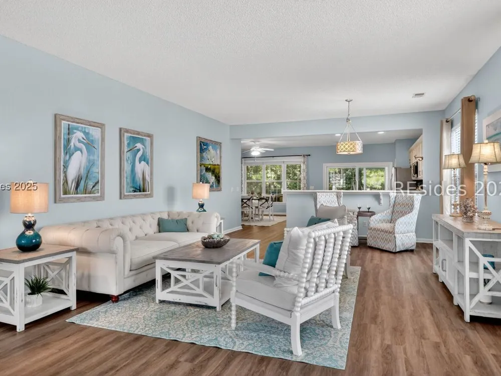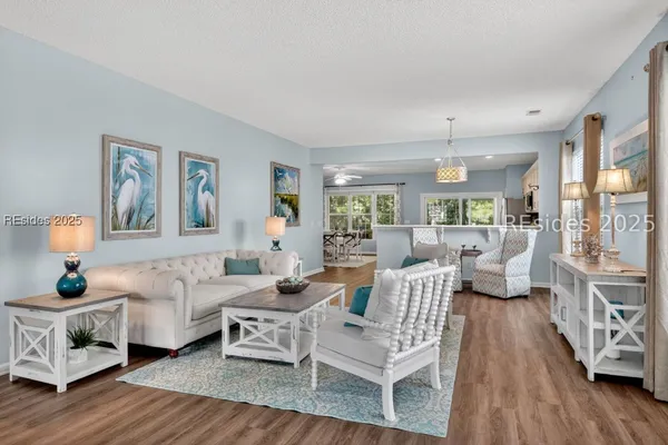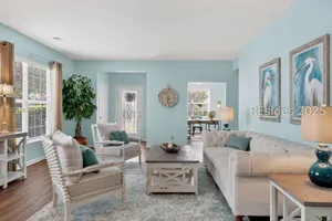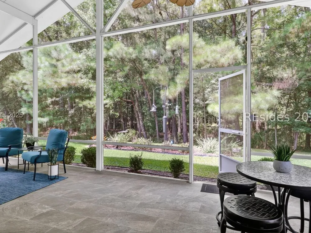 Beautifully updated, rarely seen, Teal model in Sun City Hilton Head featuring a Great rm, Carolina rm & lg office w/updated flooring, two bed, two bath, fresh int & ext paint, blinds, light fixtures, & fans. The kitchen features newer appls, countertops, sink, faucet, & painted cabinets. The primary bath has been fully renovated w/ gorgeous vanities, tile shower & floors. The guest bath is also beautifully remodeled. Enjoy the abundant closet space! The sliding glass door was replaced leading to the 12'x20' screened porch overlooking a private, wooded lot. Roof 2022, AC 2024, Leaf Filter Gutter Guards, & fresh landscaping. Move-in ready!