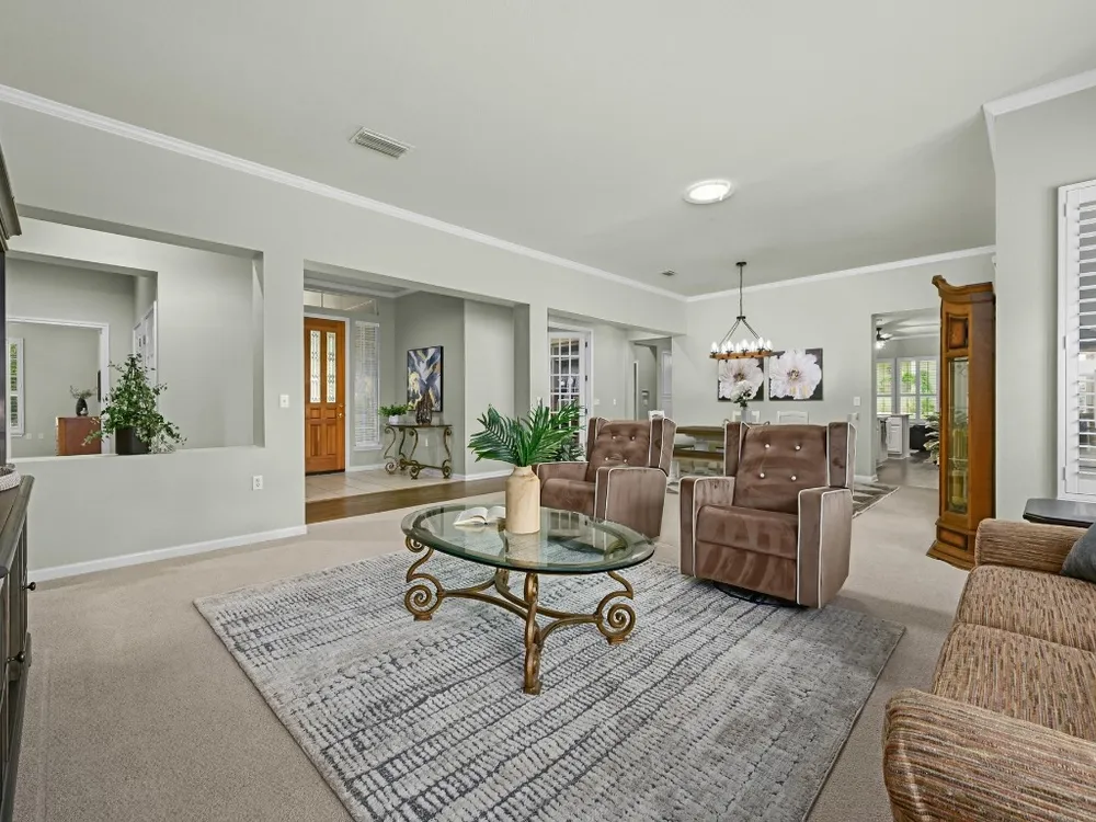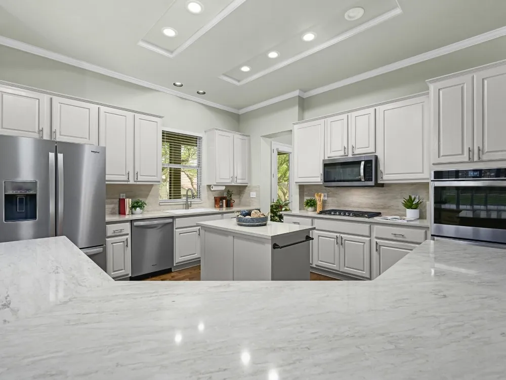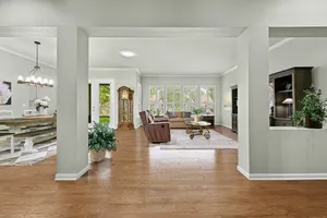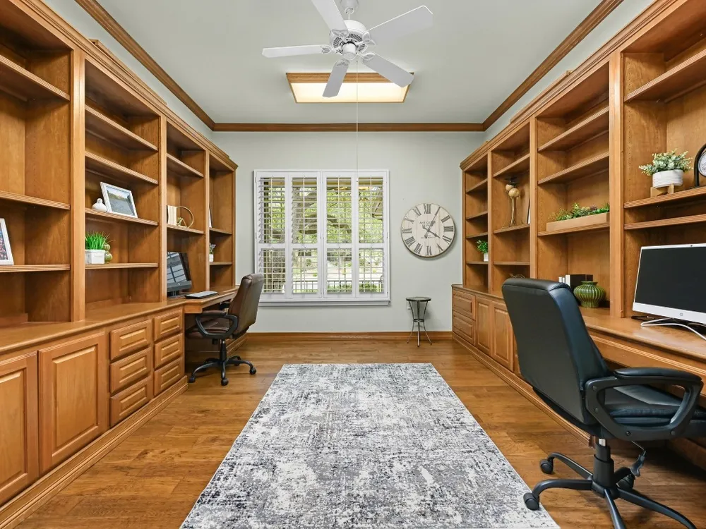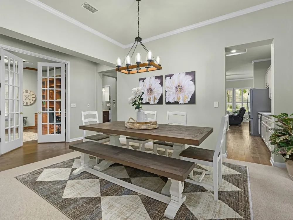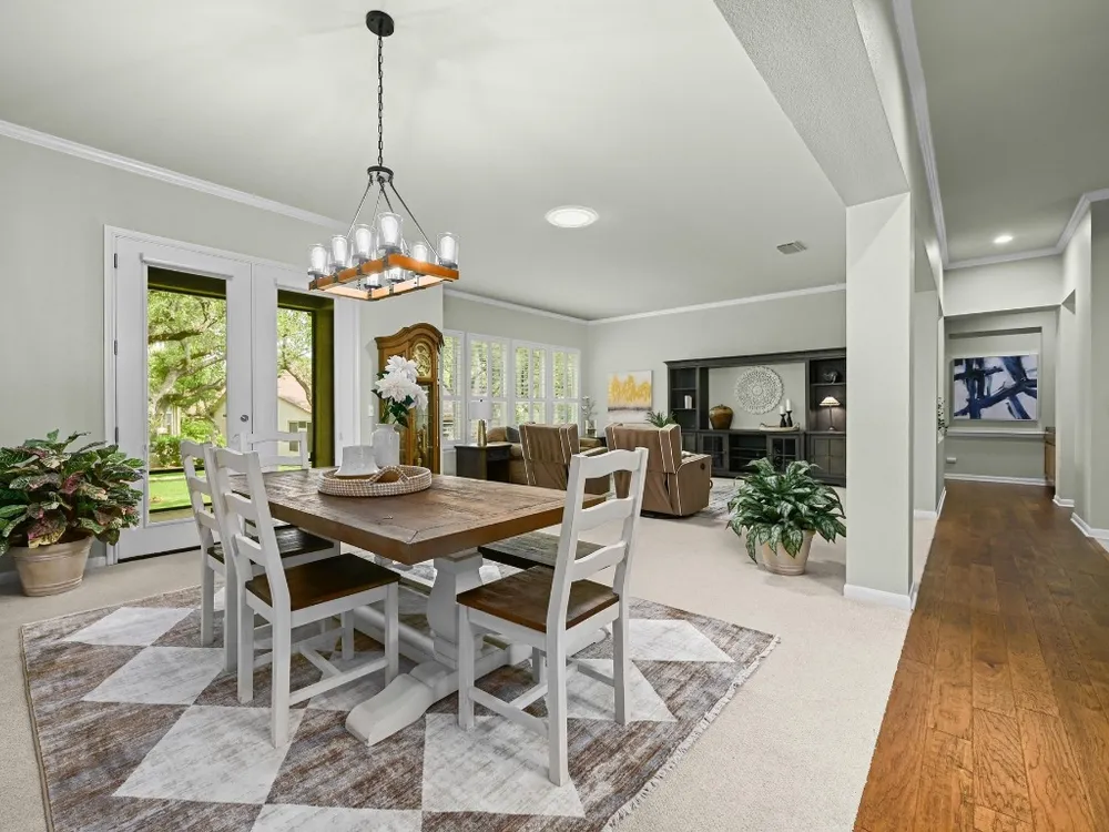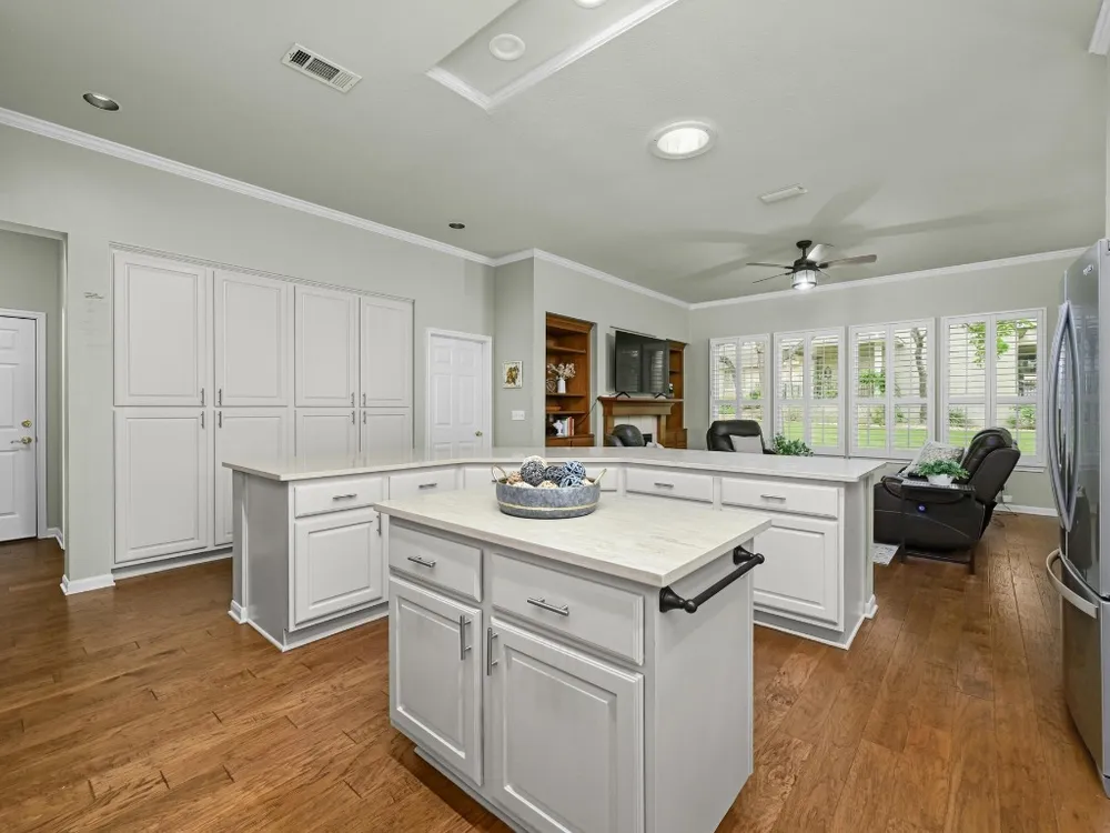 - Bookcases, Built-in Features, Ceiling Fan(s), Chandelier, Crown Molding, Separate/Formal Dining Room, Double Vanity, French Door(s)/Atrium Door(s), High Ceilings, High Speed Internet, Kitchen Island, Multiple Living Areas, Multiple Dining Areas, Main Level Primary, NoInteriorSteps, Pantry, Quartz Countertops, Recessed Lighting, Natural Woodwork, Walk-In Closet(s)