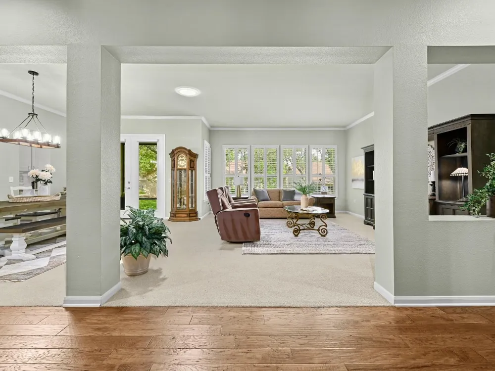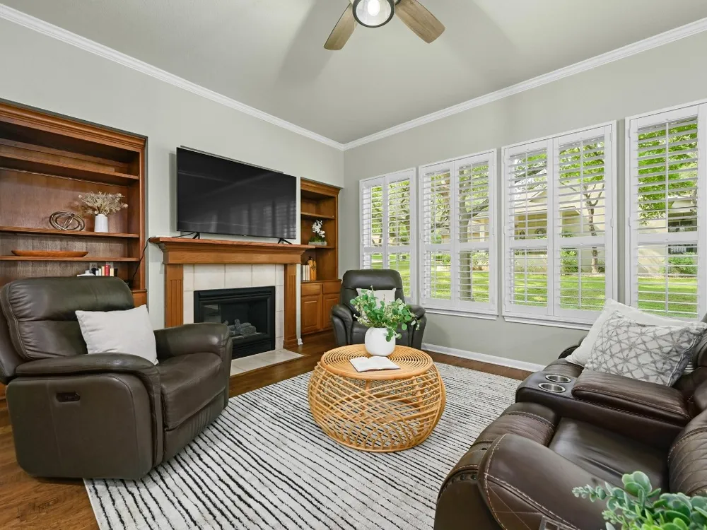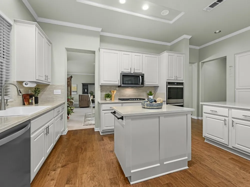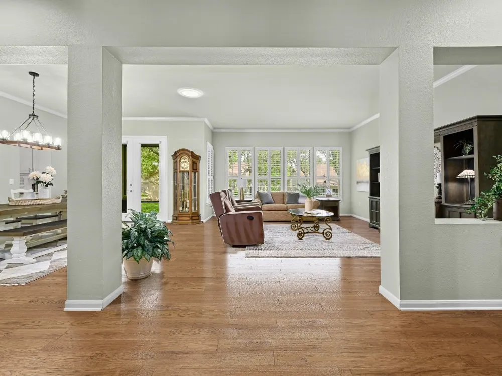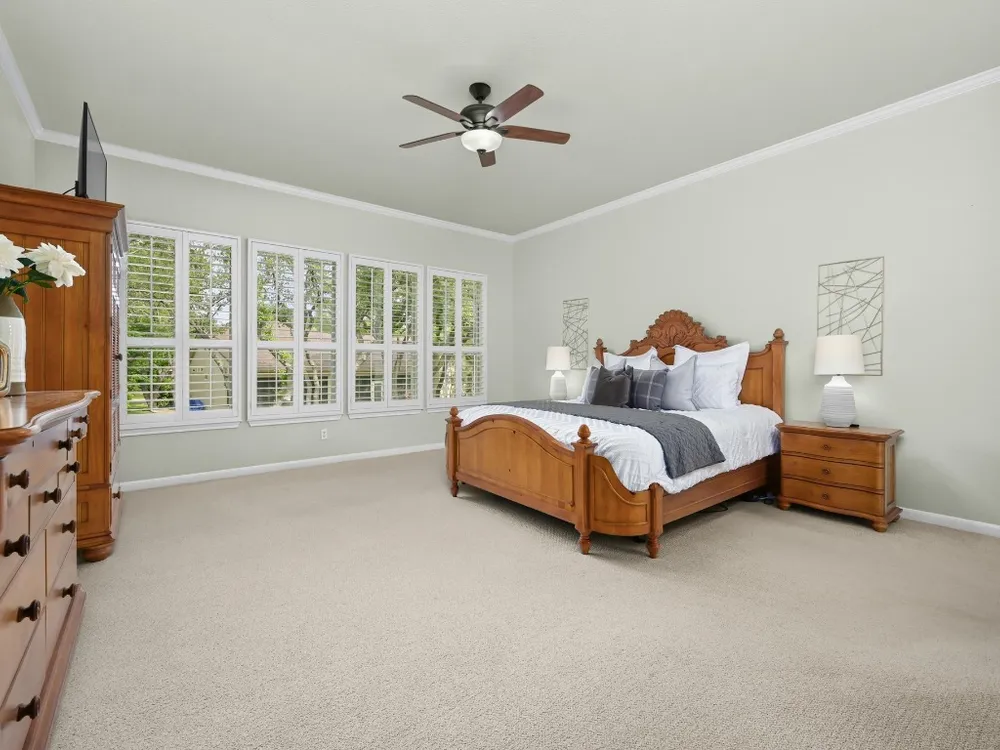 - Bookcases, Built-in Features, Ceiling Fan(s), Chandelier, Crown Molding, Separate/Formal Dining Room, Double Vanity, French Door(s)/Atrium Door(s), High Ceilings, High Speed Internet, Kitchen Island, Multiple Living Areas, Multiple Dining Areas, Main Level Primary, NoInteriorSteps, Pantry, Quartz Countertops, Recessed Lighting, Natural Woodwork, Walk-In Closet(s)