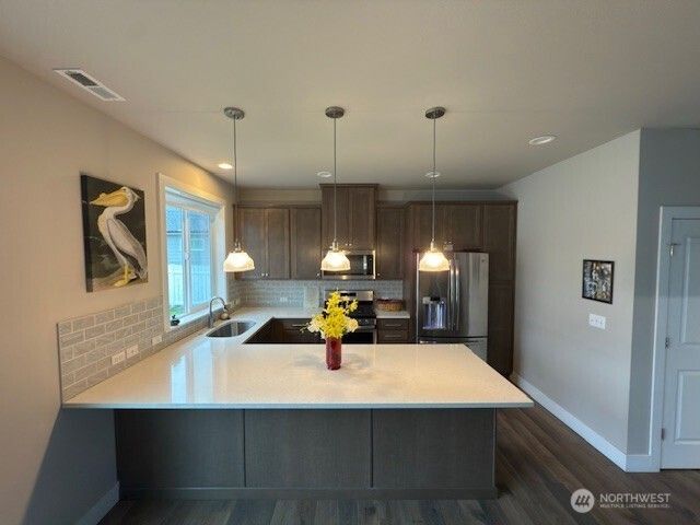 Stunning 2 bed, 1.75 bath, with an office/den in the desirable 55+ community of Majestic View Estates. Enjoy the open-concept layout between kitchen, dining, & living rm, perfect for entertaining. Double door entry leads to the office/den area off entry. Kitchen features quartz counters w/large bar & plenty of seating. SS appliances, gas cook-top, high-end cabinets, & tile bask splash. Beautiful LVP flooring throughout living space. Relax in your large primary bedroom w/ensuite bath & walk-in closet or cozy up to the gas fireplace in the living area. Upgrades include tankless water heater, sprinkler system, & secure wall safe. Enjoy the clubhouse w/pool, exercise room, and Low HOA dues. All near downtown Orting w/trails & amenities.
