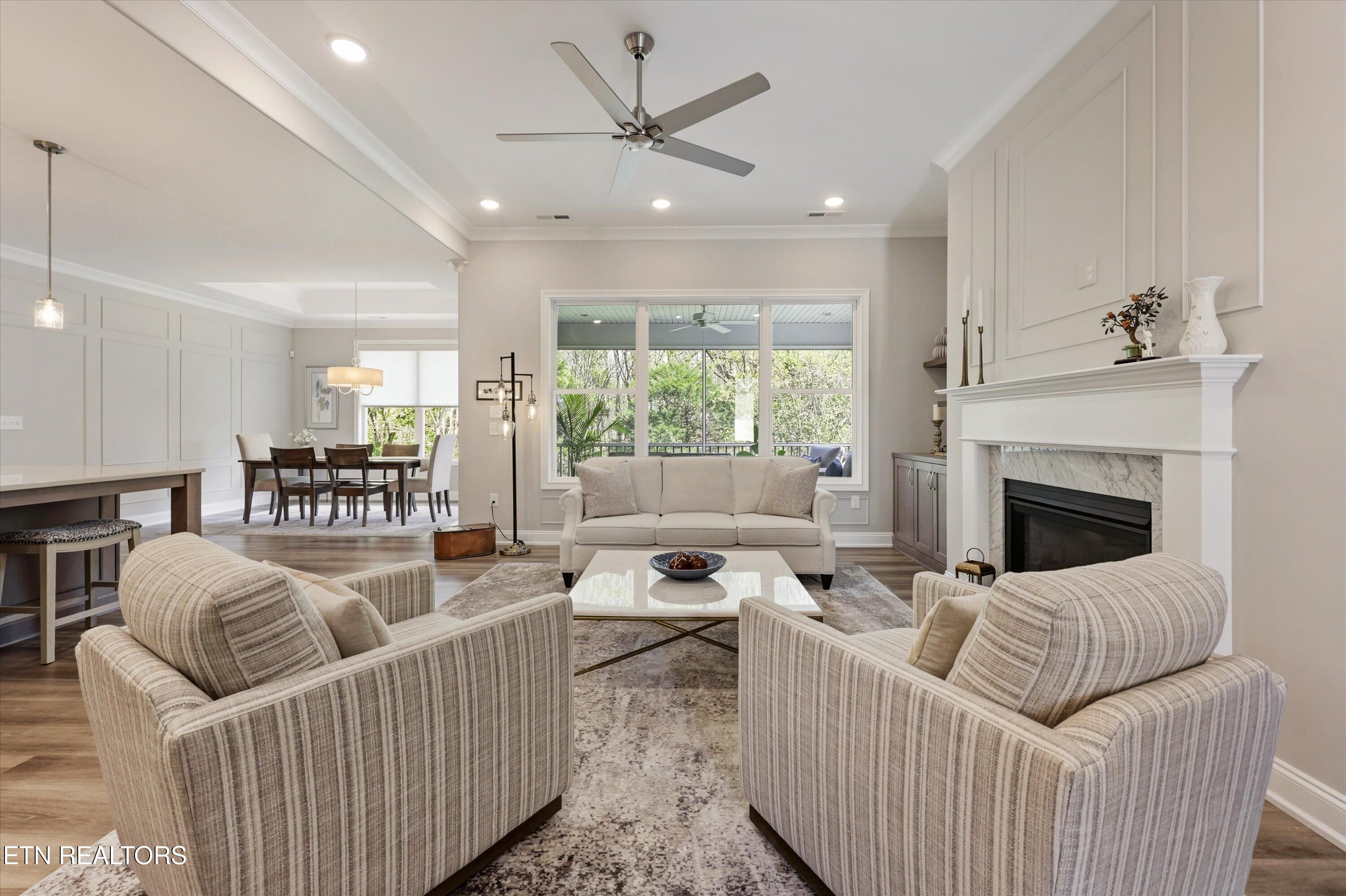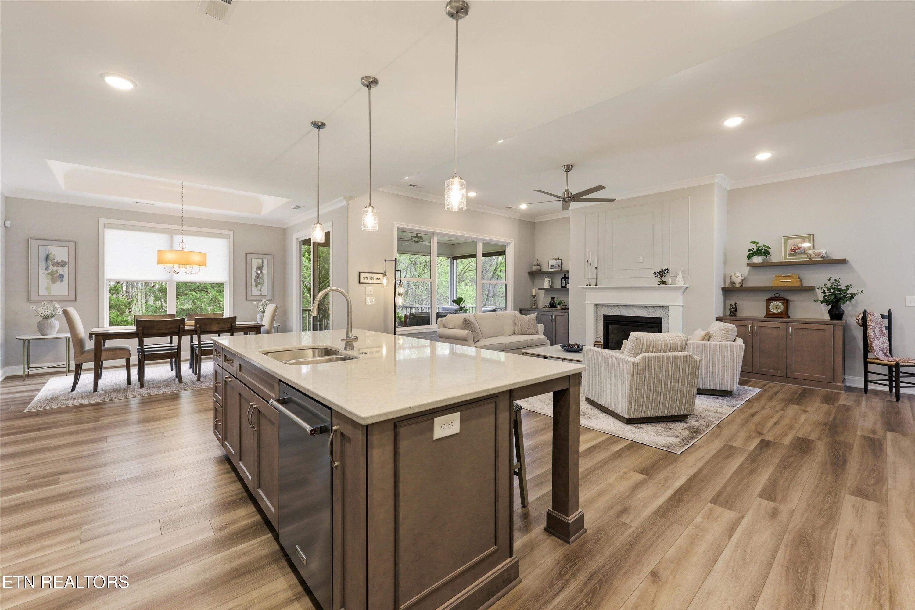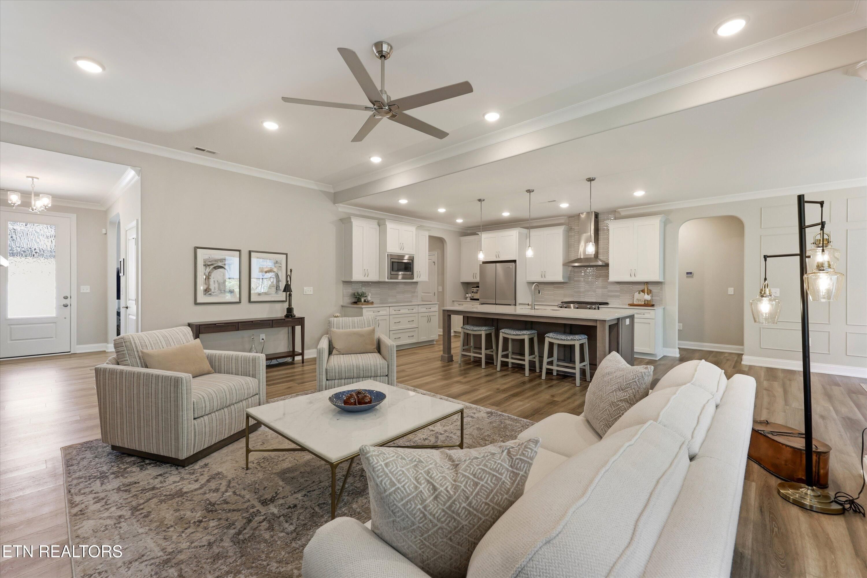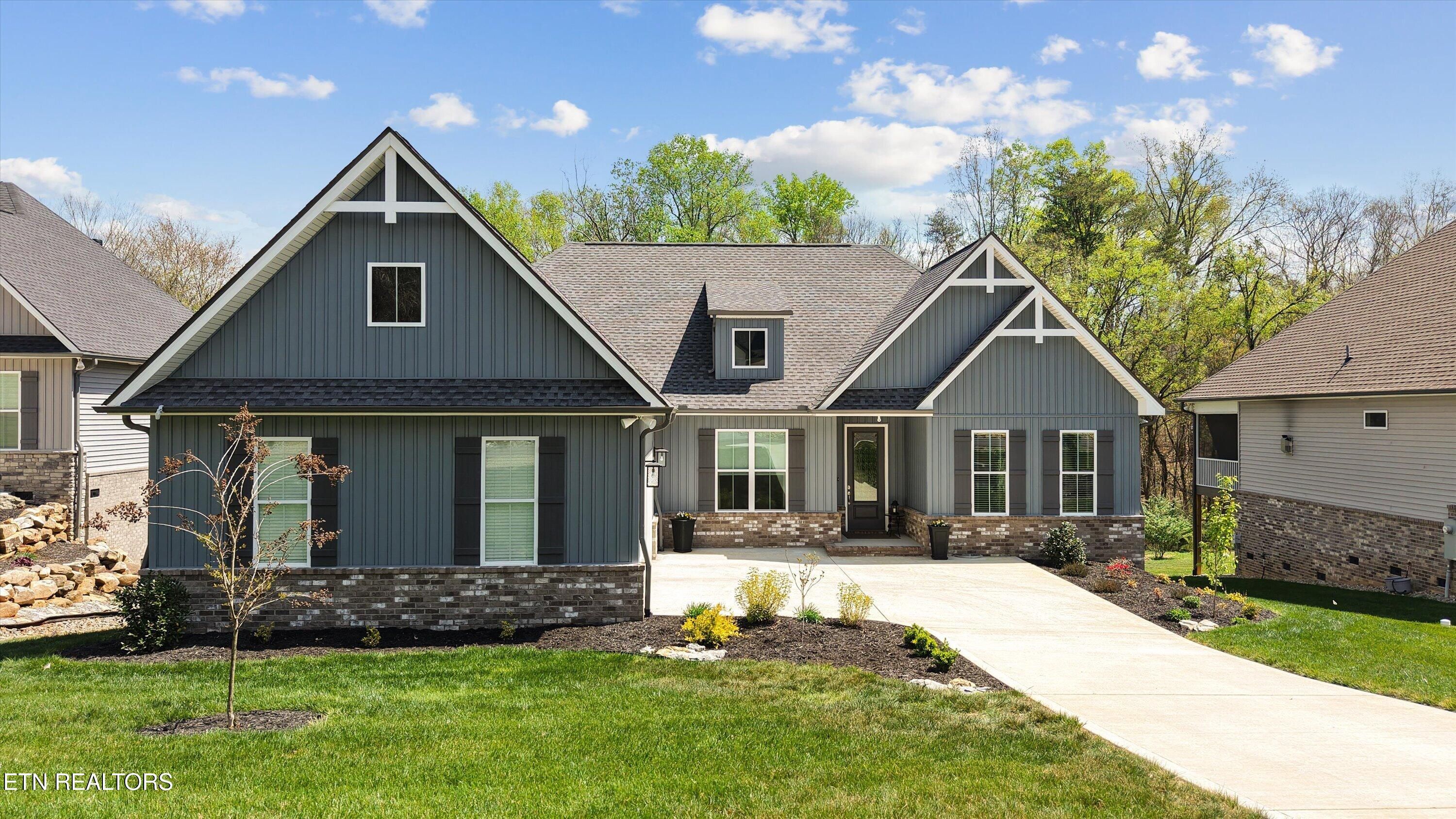 Welcome to this beautifully built 2024 Modern Craftsman-style home located in the highly sought-after Tellico Village community, offering true one-level living with a clean, functional layout and upscale finishes throughout. This home features 3 bedrooms, 2.5 bathrooms, and a versatile flex room, offering a highly convenient and functional layout for everyday living. The open-concept design seamlessly connects the living room and kitchen, creating an ideal space for living and entertaining, with a gas fireplace and abundant windows that fill the space with natural light for a bright, airy feel. The kitchen is thoughtfully designed with luxury cabinetry, quartz countertops, and KitchenAid appliances, including the refrigerator, gas range, and dishwasher. The primary suite features a spacious bedroom with tray ceilings, complemented by a well-appointed bathroom with dual vanities, quartz countertops, a large tile walk-in shower with seating, and an oversized walk-in closet. The additional bedrooms and flex room provide flexibility for guests, an office, or hobbies. Highlighted features include 10' ceilings, custom wall moldings, and tray ceilings in the primary bedroom and dining room. Enjoy outdoor living in a private, tree-lined setting on the screened-in deck with composite decking, offering a low-maintenance space to relax year-round. Additional features include an oversized 2-car garage with attic storage above, a tall crawl space for ample storage, and a full irrigation system. Homes like this don't come available often--schedule your showing today.