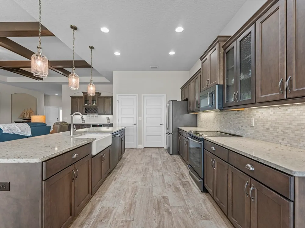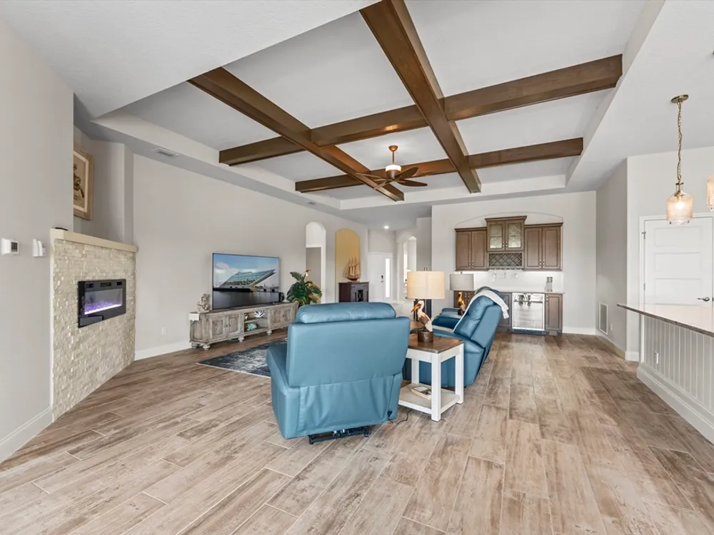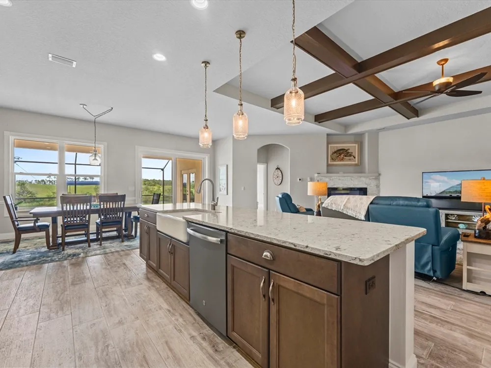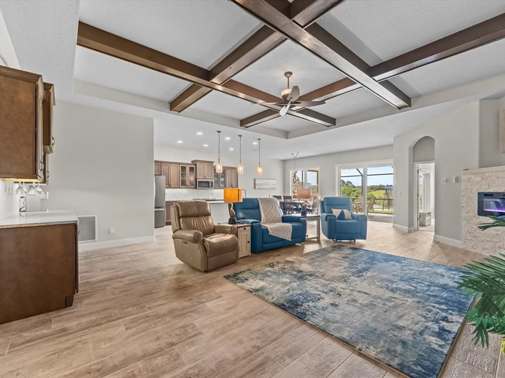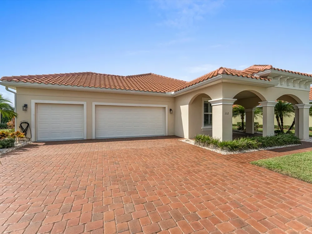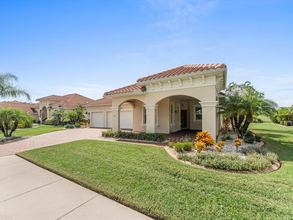 Welcome to Portofino Reserve in Venetian Bay, New Smyrna Beach's premier gated golf course community. This custom Paytas Home blends Mediterranean charm with modern luxury—featuring a 3-car garage, coffered ceilings, and a designer kitchen with rich cabinetry, matte stainless appliances, and beverage center. The great room's stacked-stone fireplace creates warmth and style, while the primary suite offers French doors to the lanai, oversized shower, and custom walk-in. Flexible parlor space suits a home office, gym, or library. Outside, enjoy tranquil views from the extended screened lanai, enhanced landscaping, and plantation shutters throughout. Venetian Bay delivers resort living: championship golf, spa, dining, coffee shop, fitness center, pickleball, bike trails, and weekly community events. A rare chance to own a move-in ready, upgraded home in one of Florida's most sought-after neighborhoods—schedule your private showing today!