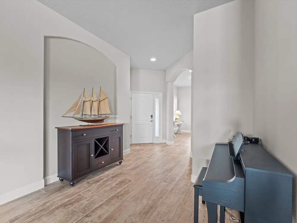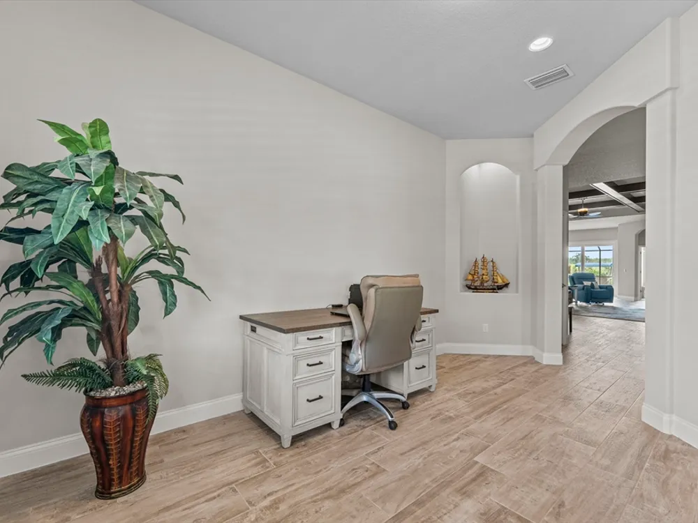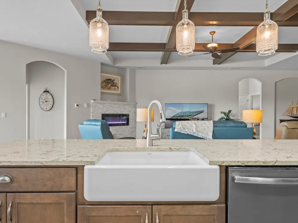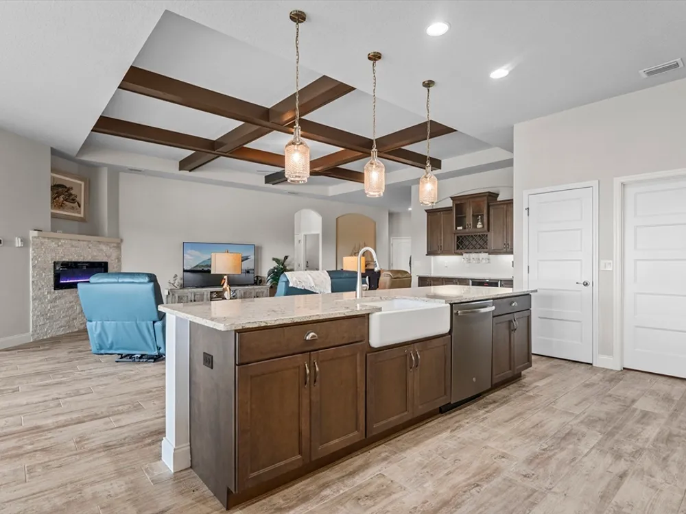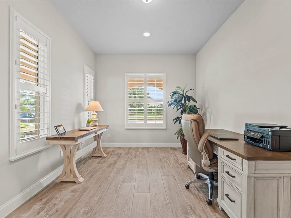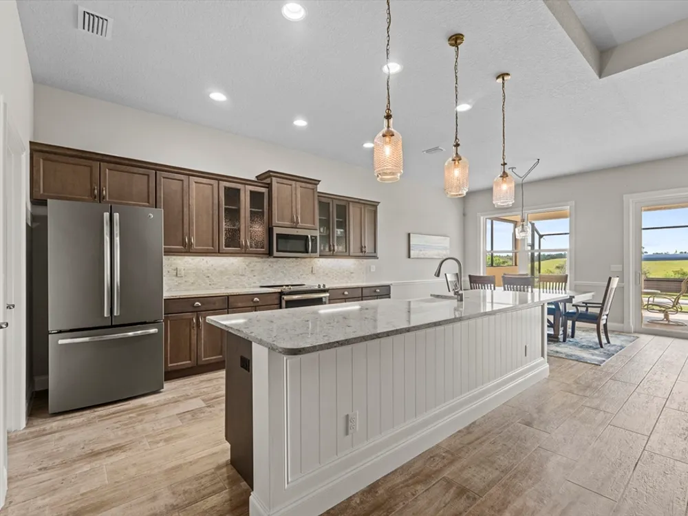 Welcome to Portofino Reserve in Venetian Bay, New Smyrna Beach's premier gated golf course community. This custom Paytas Home blends Mediterranean charm with modern luxury—featuring a 3-car garage, coffered ceilings, and a designer kitchen with rich cabinetry, matte stainless appliances, and beverage center. The great room's stacked-stone fireplace creates warmth and style, while the primary suite offers French doors to the lanai, oversized shower, and custom walk-in. Flexible parlor space suits a home office, gym, or library. Outside, enjoy tranquil views from the extended screened lanai, enhanced landscaping, and plantation shutters throughout. Venetian Bay delivers resort living: championship golf, spa, dining, coffee shop, fitness center, pickleball, bike trails, and weekly community events. A rare chance to own a move-in ready, upgraded home in one of Florida's most sought-after neighborhoods—schedule your private showing today!