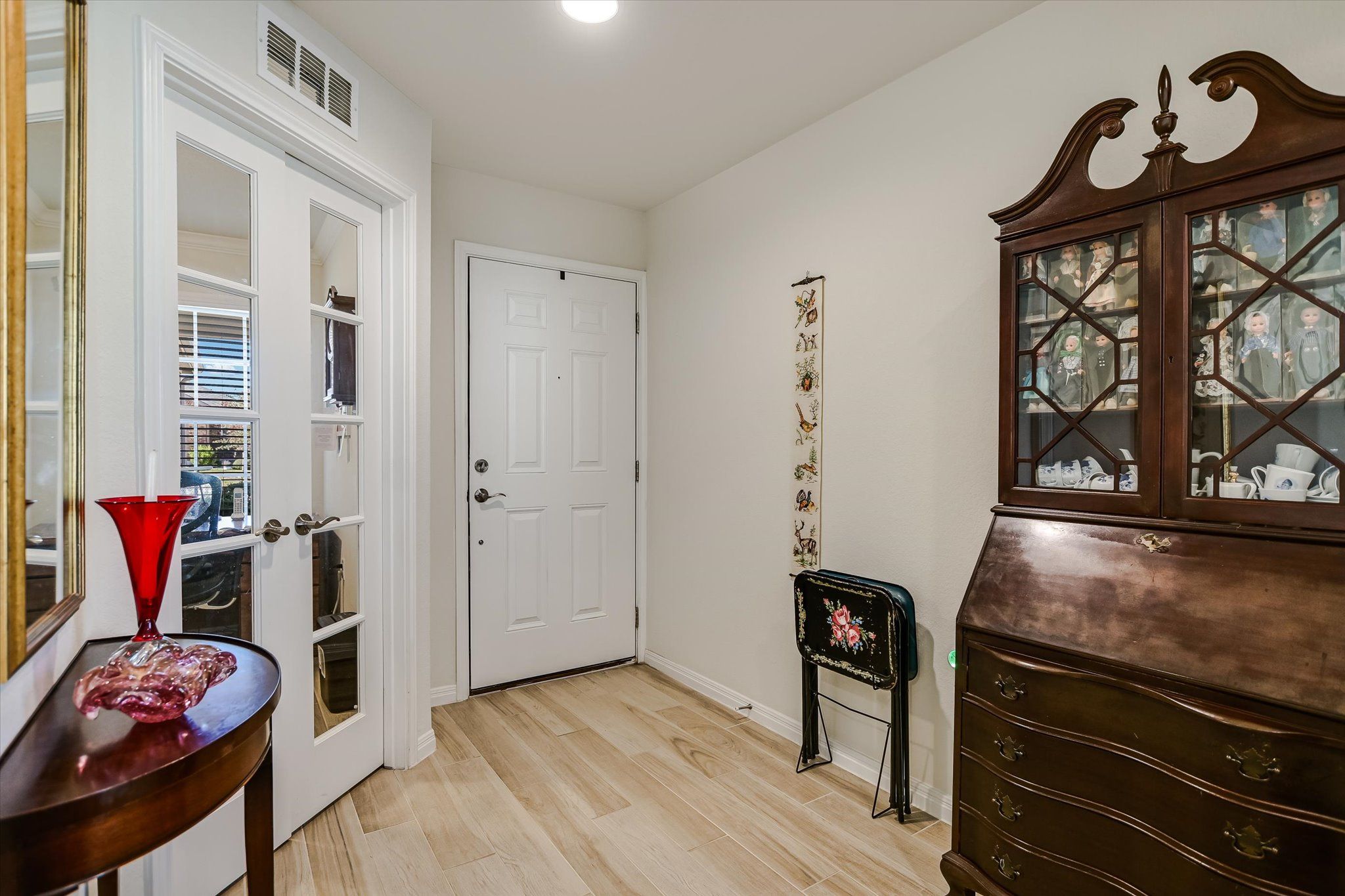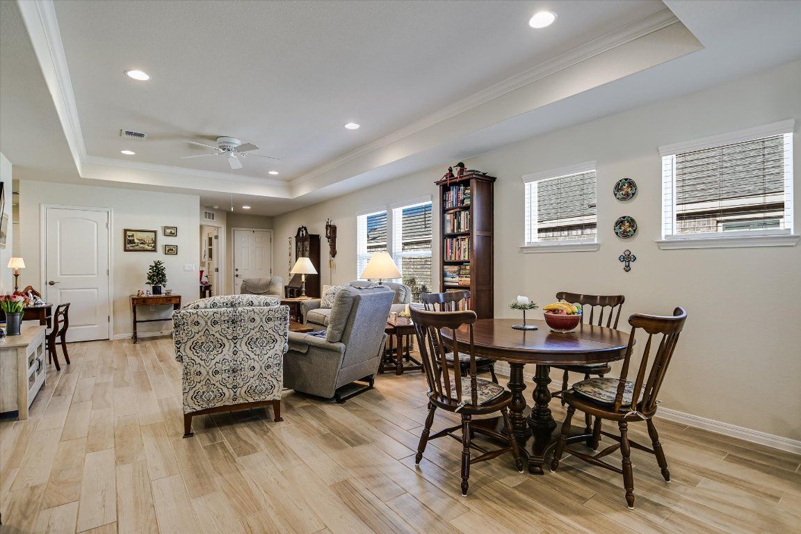Beautifully maintained single-story Taft Street garden home in Sun City Georgetown with an open, light-filled layout and excellent indoor-outdoor living. Durable tile flooring runs through the main living areas, complemented by neutral finishes, crown molding, recessed lighting, and abundant natural light. The spacious kitchen features white shaker cabinetry, quartz countertops, subway tile backsplash, stainless steel appliances with gas range, and an oversized center island with seating. The kitchen opens seamlessly to the living and dining areas, highlighted by a tray ceiling, ceiling fan, and large windows. The private primary suite offers a peaceful retreat with a generous bedroom and a well-appointed bath featuring an extended dual-sink vanity, ample storage, and a walk-in shower. A separate study with French doors provides an ideal space for a home office or hobbies. The guest bedroom and full bath are thoughtfully positioned for privacy. Enjoy outdoor living on the covered patio overlooking a fenced backyard with mature trees and greenbelt view. Additional highlights include a dedicated laundry room, a two-car garage, and low-maintenance landscaping. Conveniently located near Sun City amenities, golf, trails, and community centers.