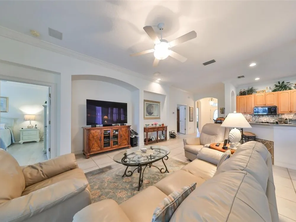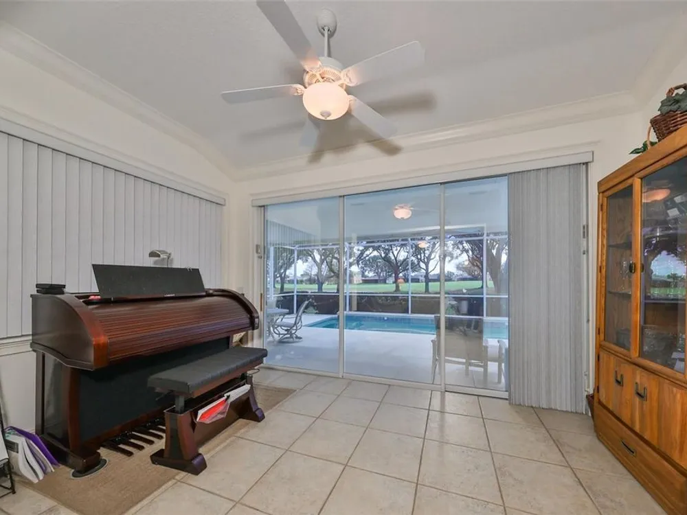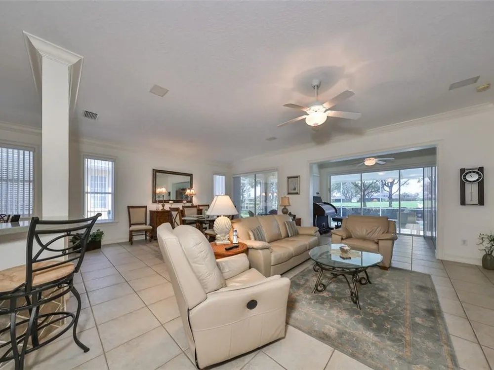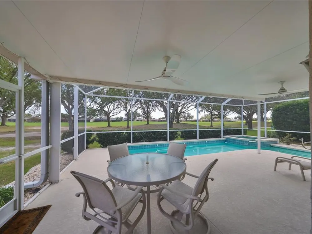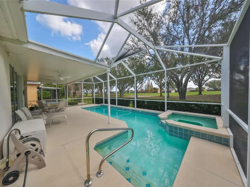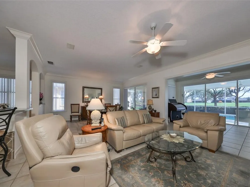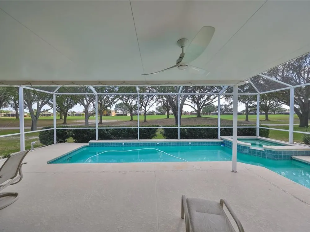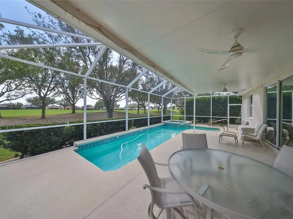 MOTIVATED SELLER. PLUS CREDIT FOR POOL RESURFACING! BEAUTIFUL POOL, SPA & GOLF COURSE VIEWS AND BRAND NEW HVAC SYSTEM! ALL FURNITURE AVAILABLE FOR SALE! Welcome to retirement living at its finest in the active and friendly community of Renaissance within Sun City Center, Florida. You'll be impressed with the attractive curb appeal of this meticulous & well maintained home AND THE ROOF WAS REPLACED IN 2021. Enter through the inviting screened front porch and be wowed by the modern open floorplan and stunning pool & golf course views, all across the rear of the home. This home boasts almost 1900 sq ft of living space & also includes a 14 x 8 living room extension with a triple slider, that leads out to the lanai. The lovely eat-in kitchen with breakfast bar, has been refreshed with newer appliances, including a natural gas range and pretty glass tile backsplash. The comfortable open living room/dining room combo is the perfect space for all your entertainment needs. The living room extension is a great versatile space for your reading or crafting room. The large private owner's suite has more terrific views, newer vinyl flooring and a nice ensuite bathroom with a double vanity, separate soaker tub & walk-in shower. The 2nd bedroom, also has newer vinyl flooring and is at the opposite end of the home for extra privacy for guests. The den/office has solid french doors so it can easily be used for a 3rd bedroom if needed. When you want to relax in the spa or float in the pool, you'll love your very own private & peaceful oasis in the huge, partly covered lanai that has beautiful views of the 5th fairway of the Renaissance Golf Course. For more enjoyment, this home is just a short golf cart ride up the street to the neighborhood Club Renaissance where you can enjoy dining, drinks, social activities, spa treatments, fitness classes and so much more. As an extra bonus, you'll also have access to endless Sun City Center amenities such as restaurants, shopping, banking, doctors, numerous social clubs, pickleball, just to name a few, all accessible by golf cart. This truly is an amazing property in a wonderful community, so come and visit today and see why you'll want to call it home!