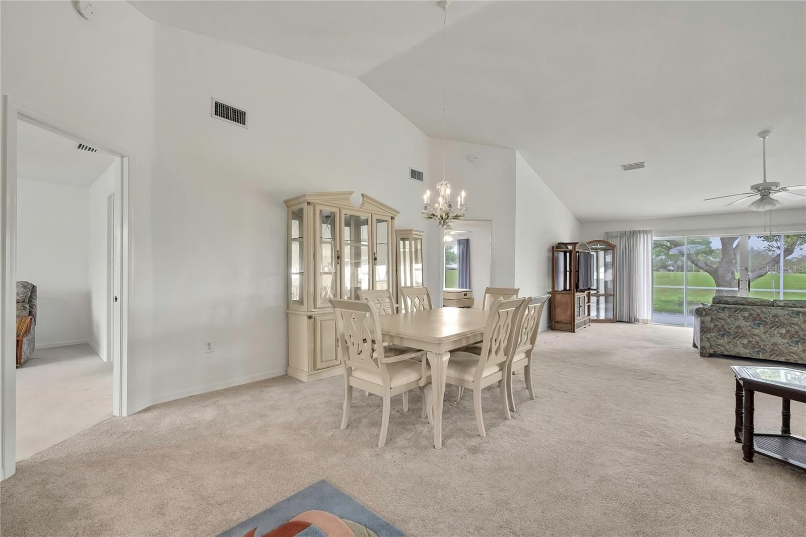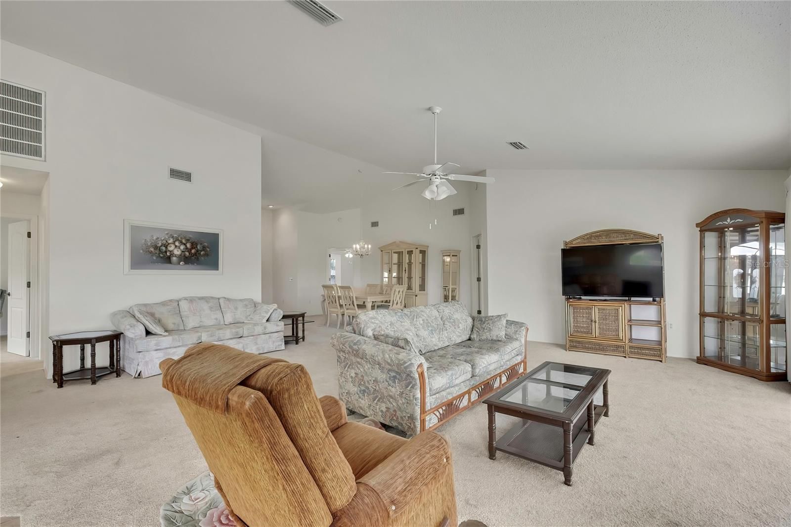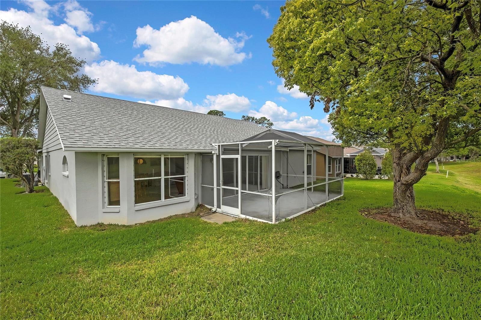 Welcome to this spacious 3-bedroom, 2-bath, 2-car garage home offering over 2,100 living square feet, perfectly situated on the golf course in the highly sought-after Heritage Pines gated community. This light and bright home features an open floor plan with vaulted ceilings, a large great room, and a formal dining area—perfect for both everyday living and entertaining. The open kitchen boasts Corian countertops, a large kitchen nook ideal for casual dining, and plenty of cabinet space, all flowing seamlessly into the main living areas. Enjoy peaceful golf course views from your screened-in back lanai, creating the perfect spot to relax and unwind. The home also features a double-door entry, a huge laundry room with tons of storage, and a convenient side garage door—perfect for easy access with your golf cart. Major updates include a 2022 roof, while the HVAC was replaced in 2012. Heritage Pines is a premier, gated, 55+ golf course community offering resort-style amenities including an 18-hole championship golf course, clubhouse, on-site restaurant, fitness center, heated pool and spa, tennis and pickleball courts, performing arts center, and a full calendar of clubs and social activities. Ideally located just minutes from US Highway 19, shopping, dining, medical facilities, and with easy access to the Suncoast Parkway for a quick commute to Tampa and surrounding areas—this home truly offers the best of the Florida lifestyle.