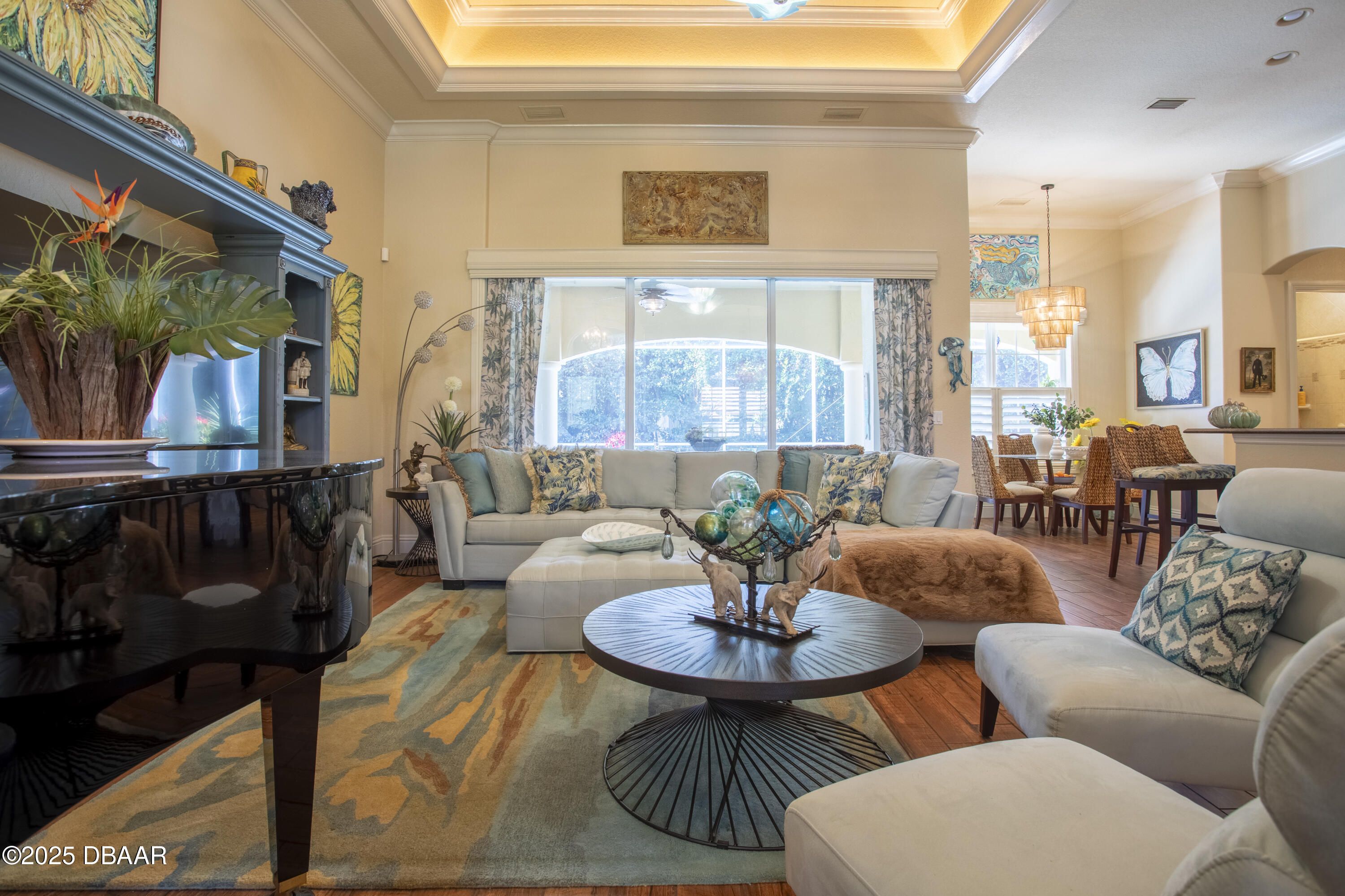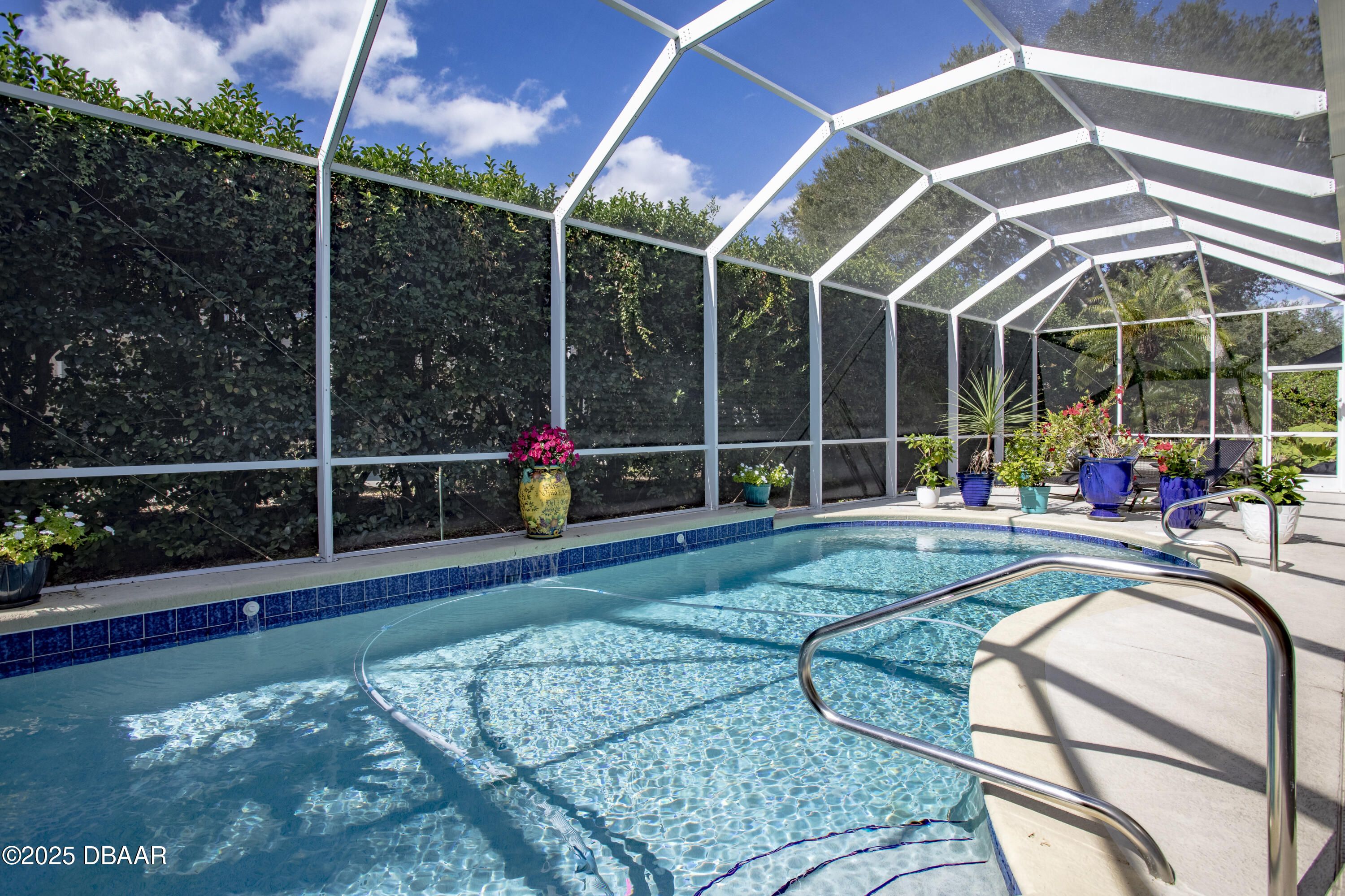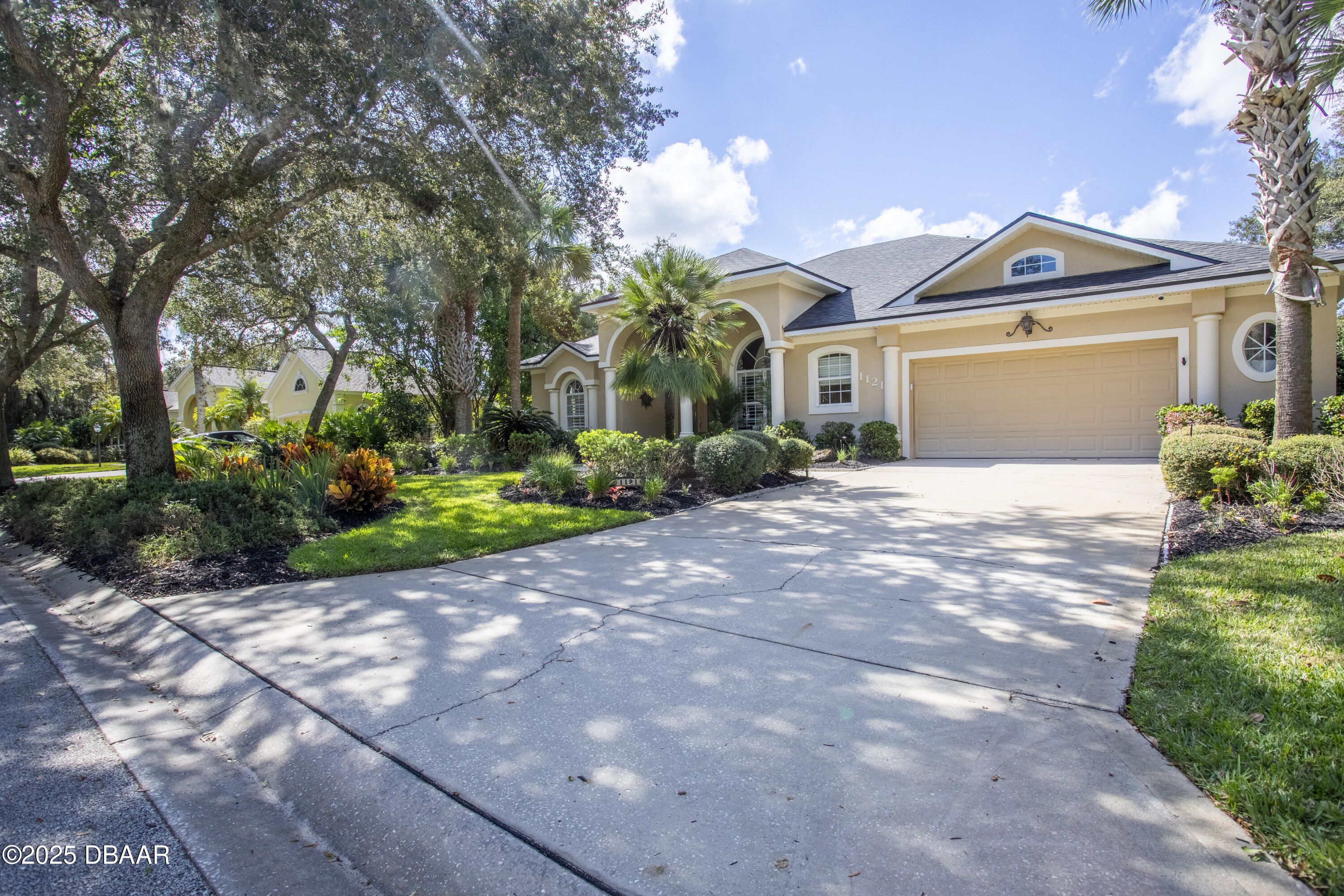 Welcome to your expertly designed home with a new roof October 2025. 2019 maintained Carrier 3.5 ton AC. 2022 mini split AC added to 24' wide garage with newer Genie garage door opener. 2022 washer & dryer stays. Heated saltwater pool with privacy hedge & fountain. Summer kitchen with newer grill. Newer patio ceiling fans. 12 & 13 ft ceilings with 8 ft doors, lit tray ceilings, rounded corners, and crown molding throughout. Gorgeous new lights in main areas. New Plantation Shutters throughout the Primary Bedroom, Dining Room, and Breakfast Nook. Privacy shade on sliders. New porcelain custom tile backsplash in solid wood kitchen with granite counters and SS appliances. Transferrable termite bond and ADT security system. Inside and out wired for surround sound. 2019 remodeled primary bath with wheelchair accessible shower & custom cabinetry and porcelain wood look tile flooring, Halifax Plantation offers Golf, Clubhouse w/ restaurant & pub, tennis & fitness Just 7 minutes to beaches!!