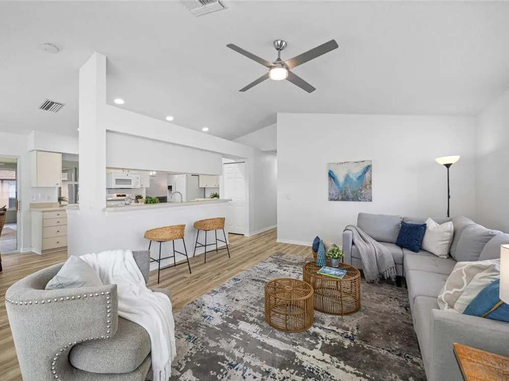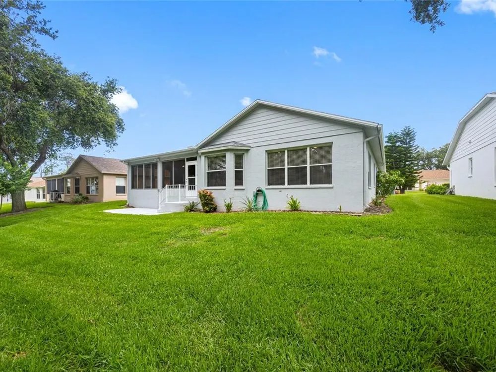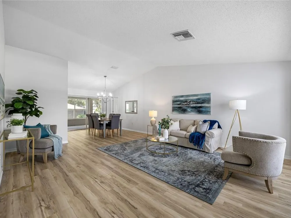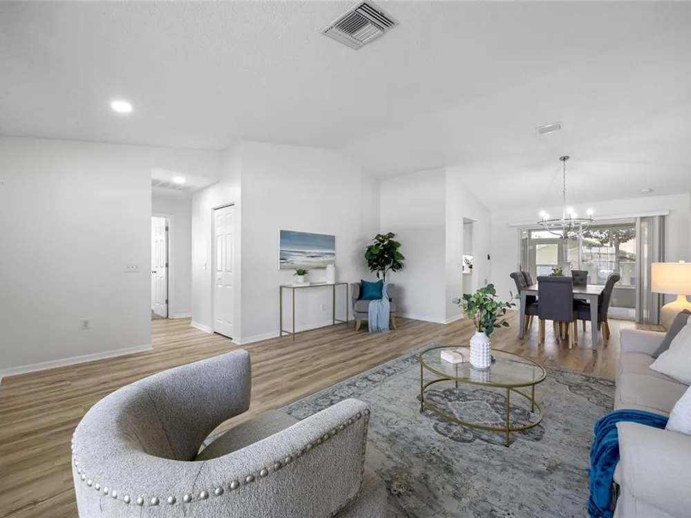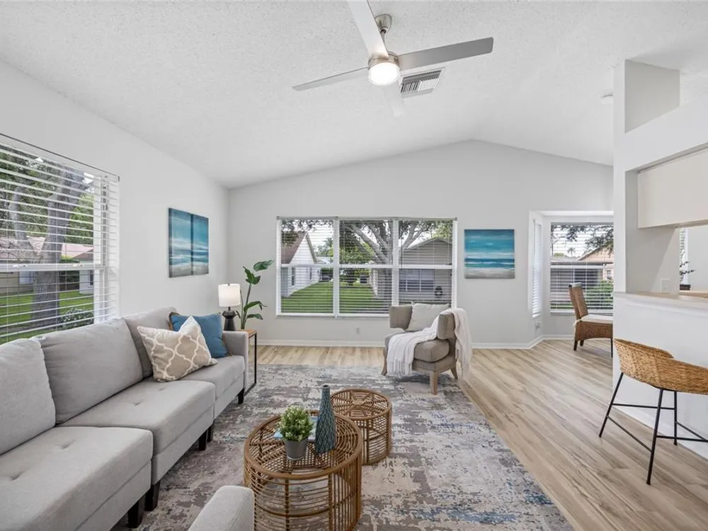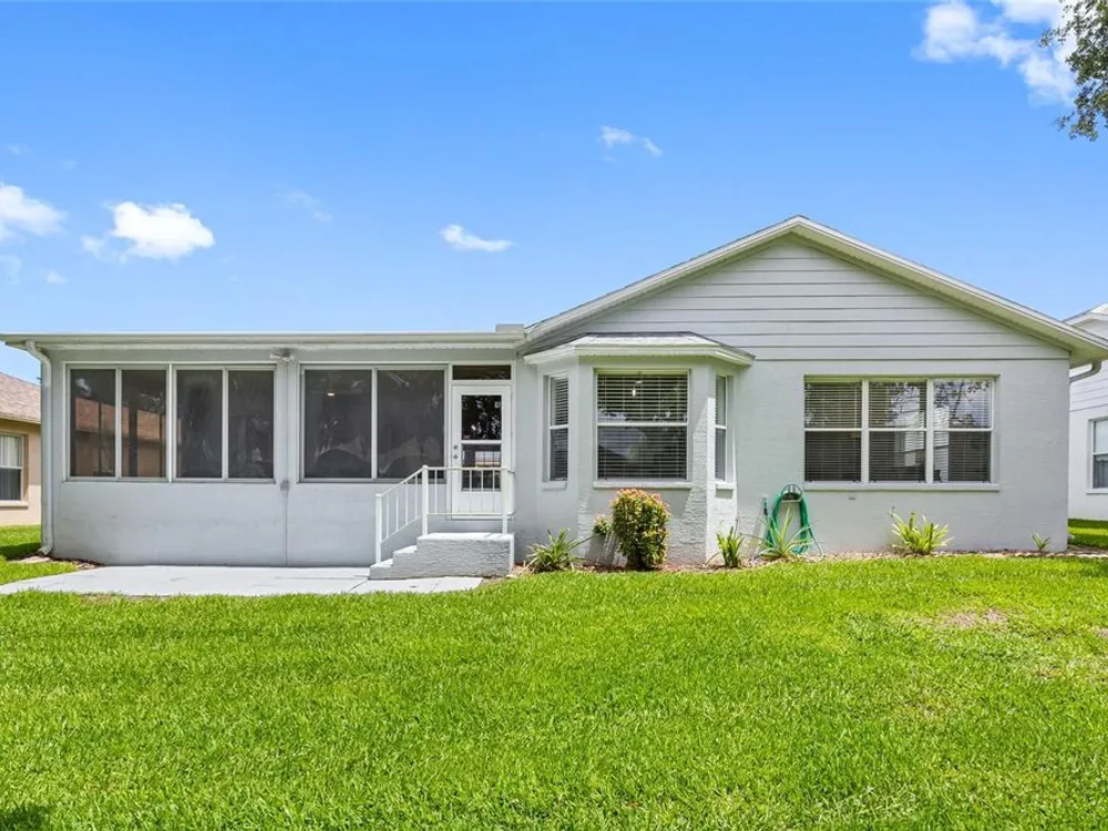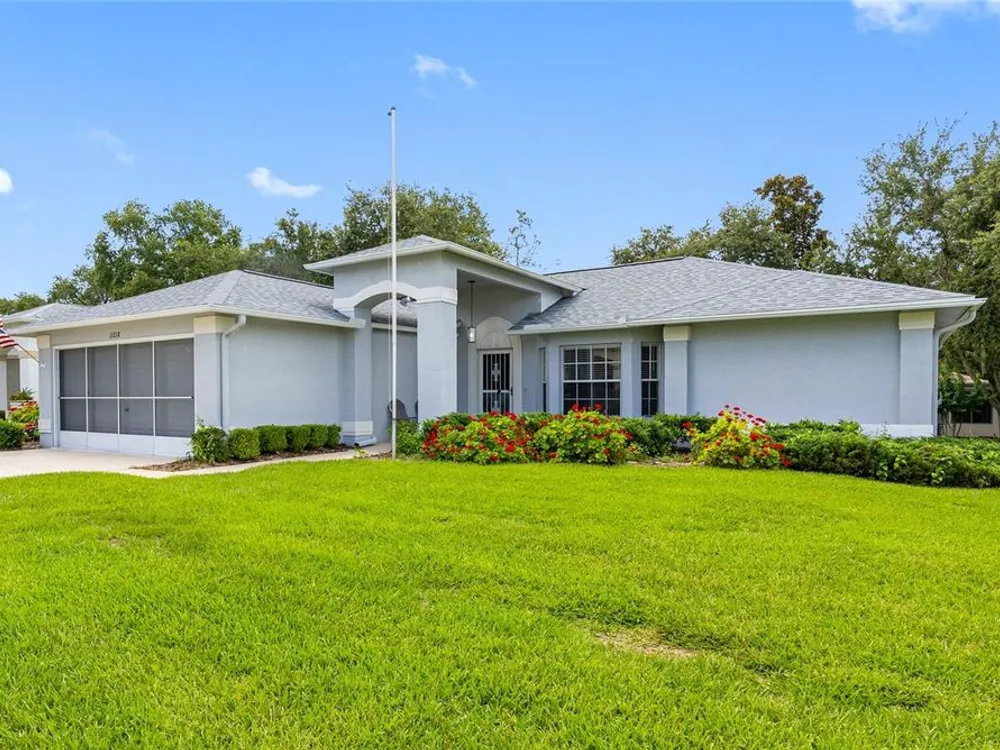 Welcome to your beautiful home in the highly desirable 55+ golf community of Heritage Pines. This spacious 3-bedroom, 2-bathroom residence with a 2-car garage has been thoughtfully refreshed and is ready for its new owners. Recent improvements include a brand-new roof, luxury vinyl plank flooring, fresh interior paint, and stylish new lighting and ceiling fans throughout, creating a modern and move-in ready feel. The home features soaring ceilings and a split-bedroom layout for comfort and privacy. The primary suite boasts dual walk-in closets and an en-suite bath with a dual-sink vanity and walk-in shower. Two guest bedrooms, each with new carpeting, share a full bath on the opposite side of the home. At the heart of the home, the kitchen offers brand new quartz countertops, newer appliances, a breakfast bar, closet pantry, and a sunny dinette area that flows seamlessly into the family room. A highlight of this property is the large, fully enclosed Florida room, complete with HVAC vents, giving this home 2,111 square feet of total cooled living space. Accessible from the dining room, dinette, and primary suite, this versatile space is perfect for entertaining or simply relaxing. Additional features include an indoor laundry room with washer and dryer included. Heritage Pines is a gated, amenity-rich, pet-friendly community offering an 18-hole championship golf course, clubhouse with restaurant and bar, fitness center, heated pool and spa, and courts for tennis, pickleball, bocce, and much more. The HOA fees cover cable, internet, lawn care, and irrigation, ensuring a low-maintenance lifestyle. Don’t miss the opportunity to make this home yours. Be sure to explore the 3D virtual tour and schedule your private showing today!